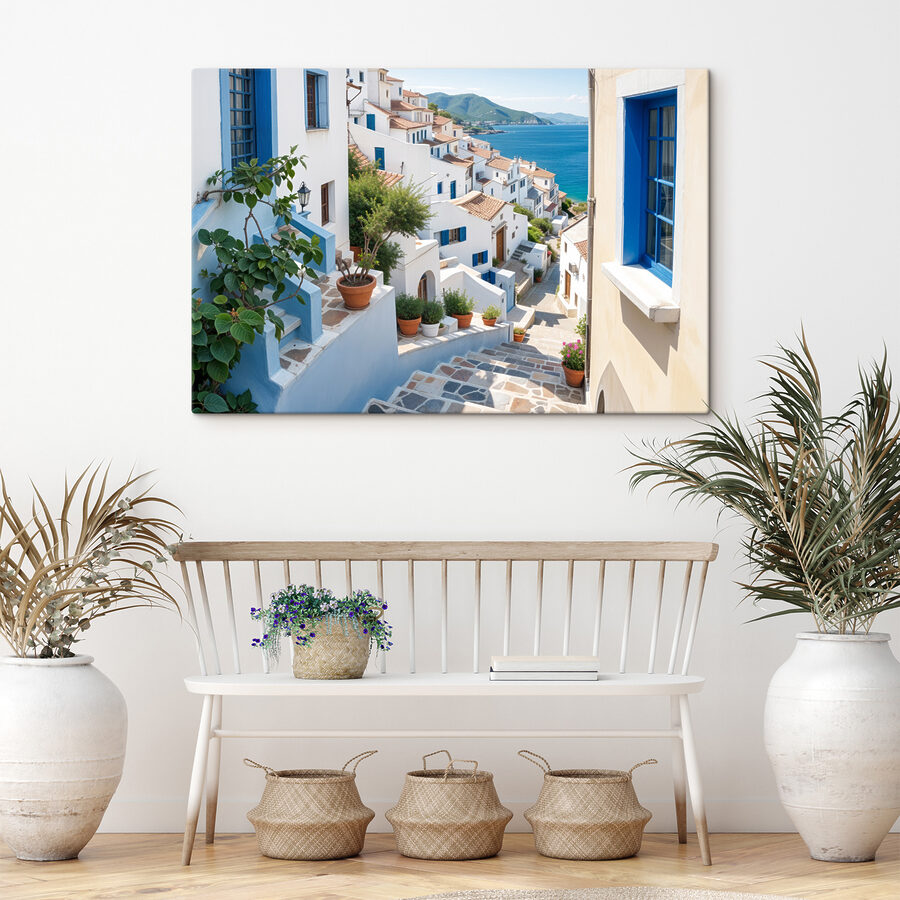 Stap in een charmante wereld met deze canvasprint van een schilderachtige trap die door een verrukkelijk stadje kronkelt. Elke draai trekt de aandacht en nodigt uit tot dagdromen over zonovergoten middagen en gefluisterde gesprekken bij de koffie. De blauwe accenten fleuren zelfs de chagrijnigste maandag op. Stel je dit voor in een gezellig hoekje, waar je gesprekken aanzwengelt over reizen en avonturen – wie wil er nou niet praten over een plek die aanvoelt als een geheime schuilplaats? Het is alsof je een stukje zonneschijn in huis haalt, perfect voor mensen die houden van een beetje reislust in hun inrichting. Met elke blik wordt je herinnerd aan de schoonheid die net buiten onze deur wacht.