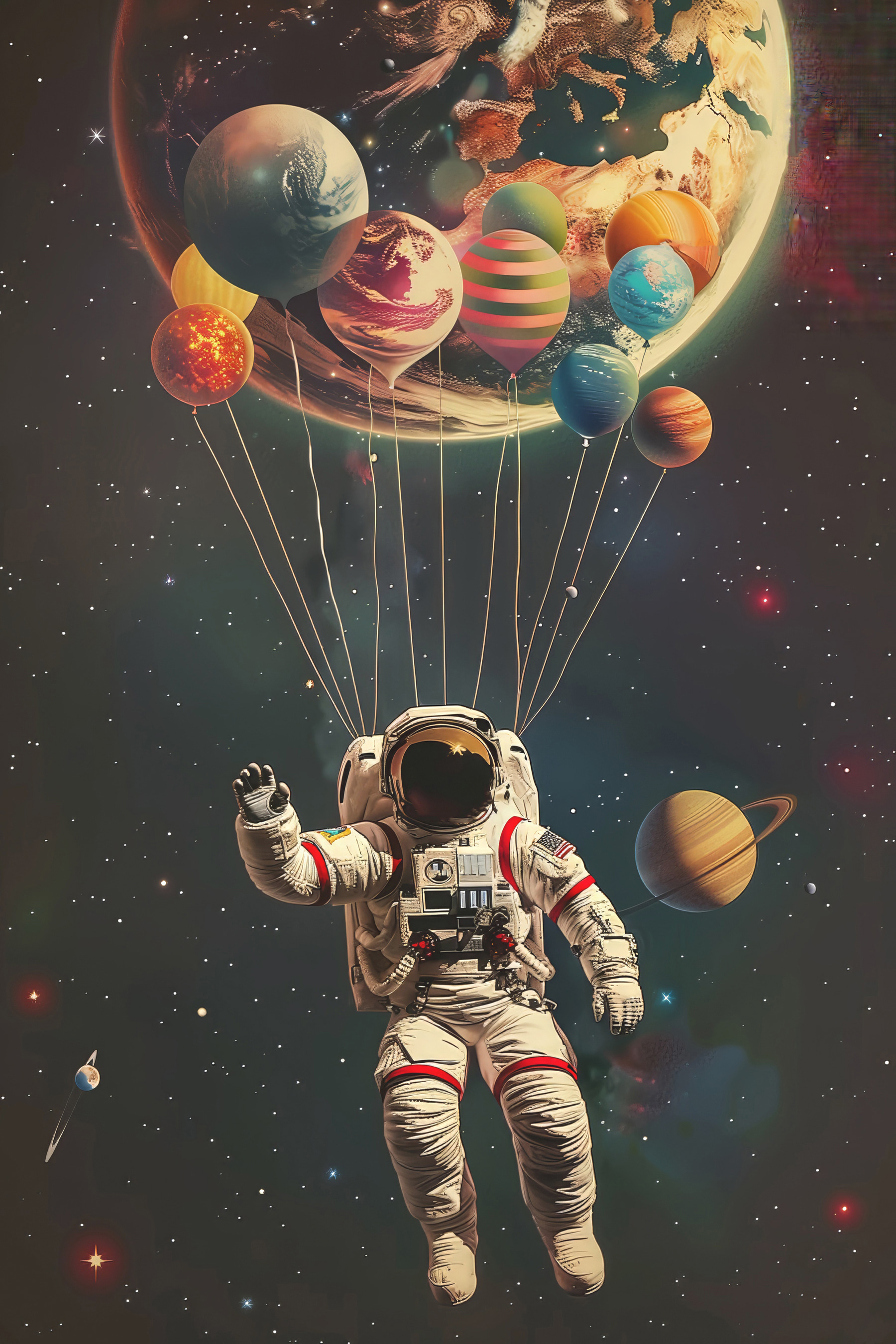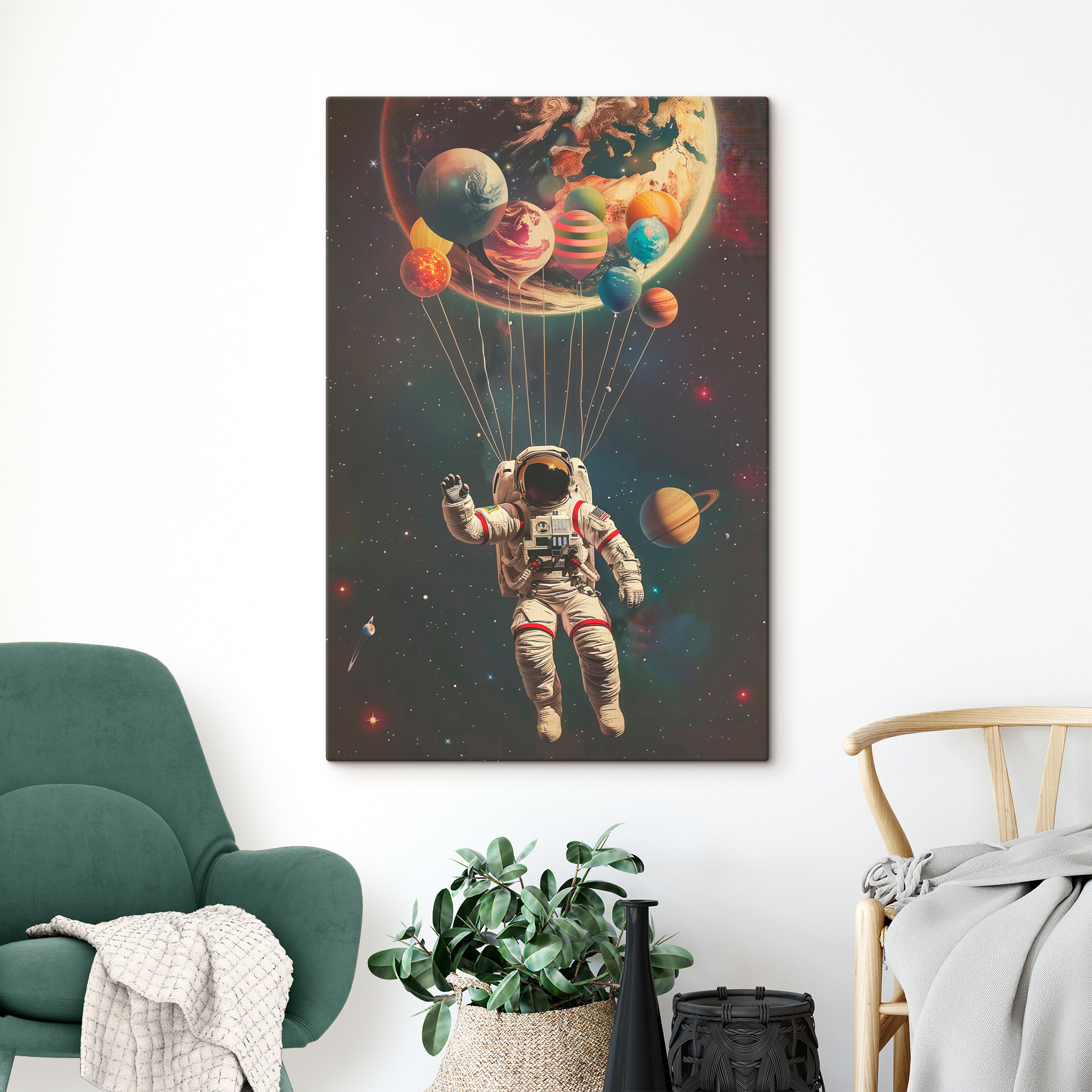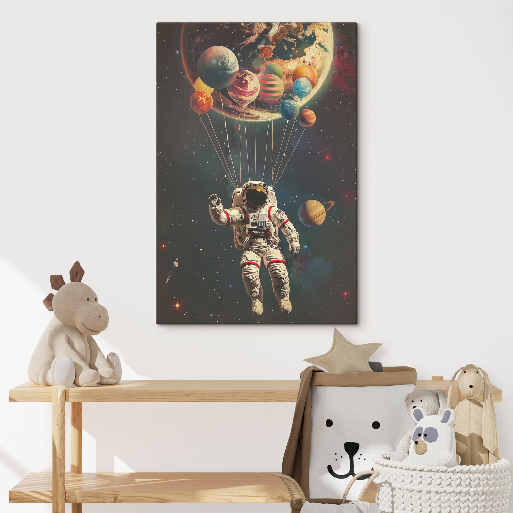 Ooit gedroomd van zweven door de ruimte, vastgebonden aan planeten-ballonnen? Voeg een vleugje kosmische eigenzinnigheid toe aan je kamer (woordspeling bedoeld!) met “Canvas Schilderijen s40185”. Dit betoverende stuk brengt een vleugje kleur en een vleugje sterrenstof in elke kamer. Stel je het voor in je woonkamer, waar je gesprekken en dagdromen aanwakkert… of in een kinderkamer, waar het kleine astronautjes inspireert om hun dromen na te jagen. De astronaut ziet er zo vrolijk uit dat je zou zweren dat hij hallo zwaait! Verfraai je muren – en je humeur – met deze unieke mix van kunst en verbeelding.