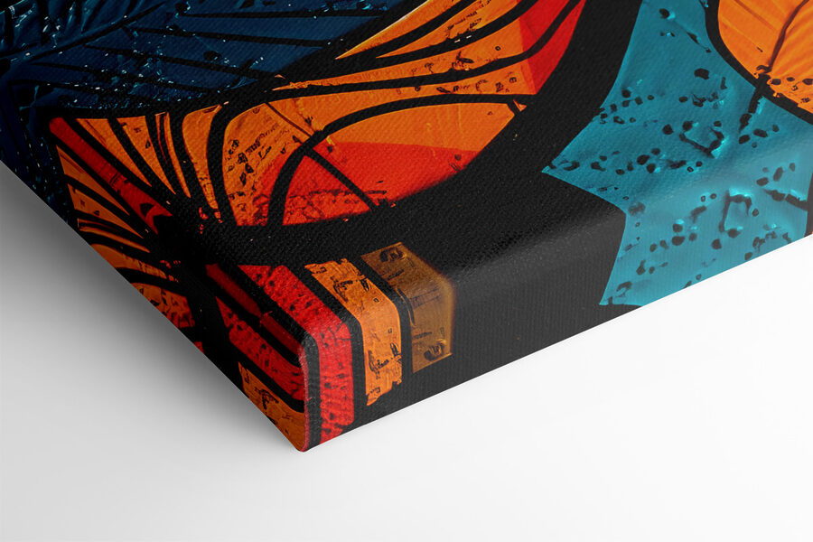 Stel je voor dat je na een lange dag thuiskomt, neerploft op je comfortabele bank en dit levendige stuk aan je muur ziet hangen… Het is als een visuele opkikker. De mix van kleuren – blauw, oranje, rood – knalt gewoon, toch? Het voelt een beetje alsof je een funky, moderne kunstgalerie binnenstapt, maar dan gewoon in je eigen woonkamer.