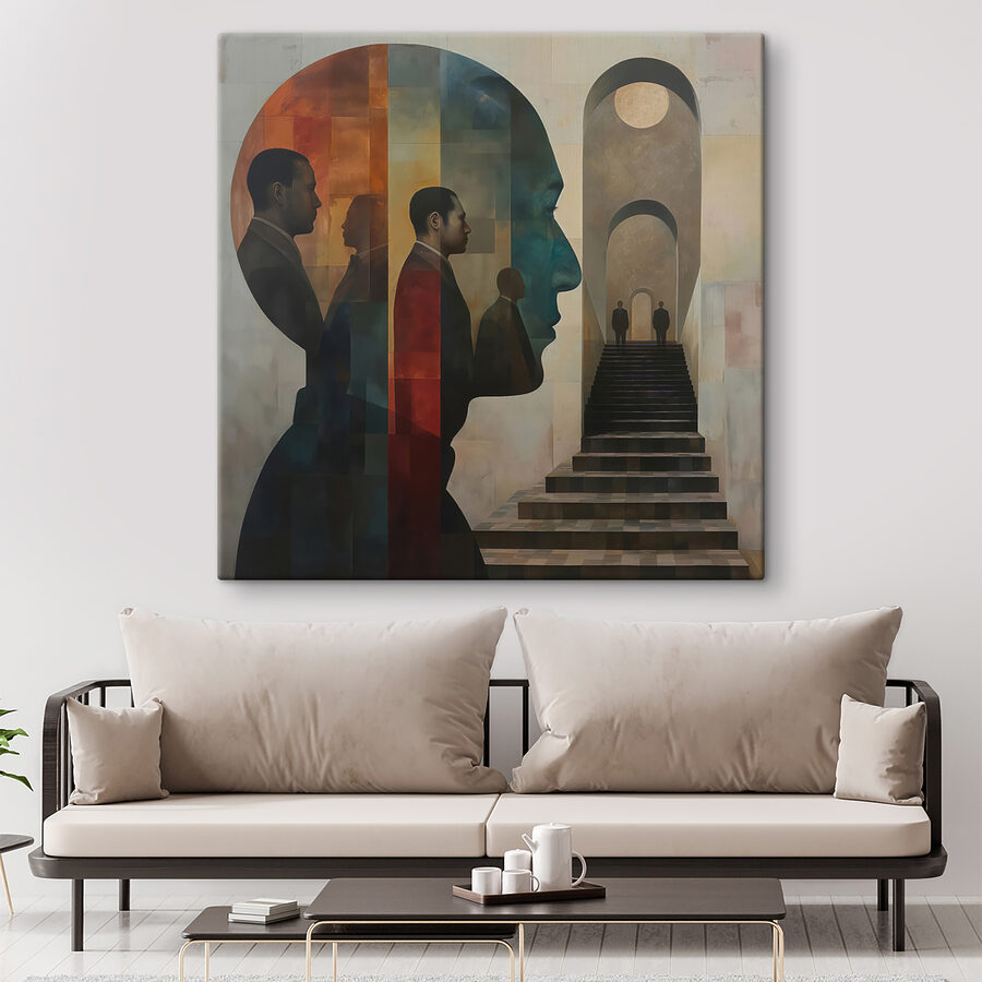 Duik in een wereld van gedachten met deze canvasprint die meer is dan alleen decoratie. Het toont een opvallend mannengezicht naast een trap – een soort visueel raadsel, toch? Door de mix van kleuren voelt het levendig aan, bijna alsof het je uitnodigt om in de scène te stappen. Stel je de gesprekken voor die dit zou kunnen ontketenen. Het is perfect voor gezellige woonkamers of zelfs als opvallend statement in een kantoorruimte. En wie wil er nu geen dagelijkse herinnering om de trappen van het leven te blijven beklimmen? Een beetje creativiteit kan van elke muur een canvas van inspiratie maken!