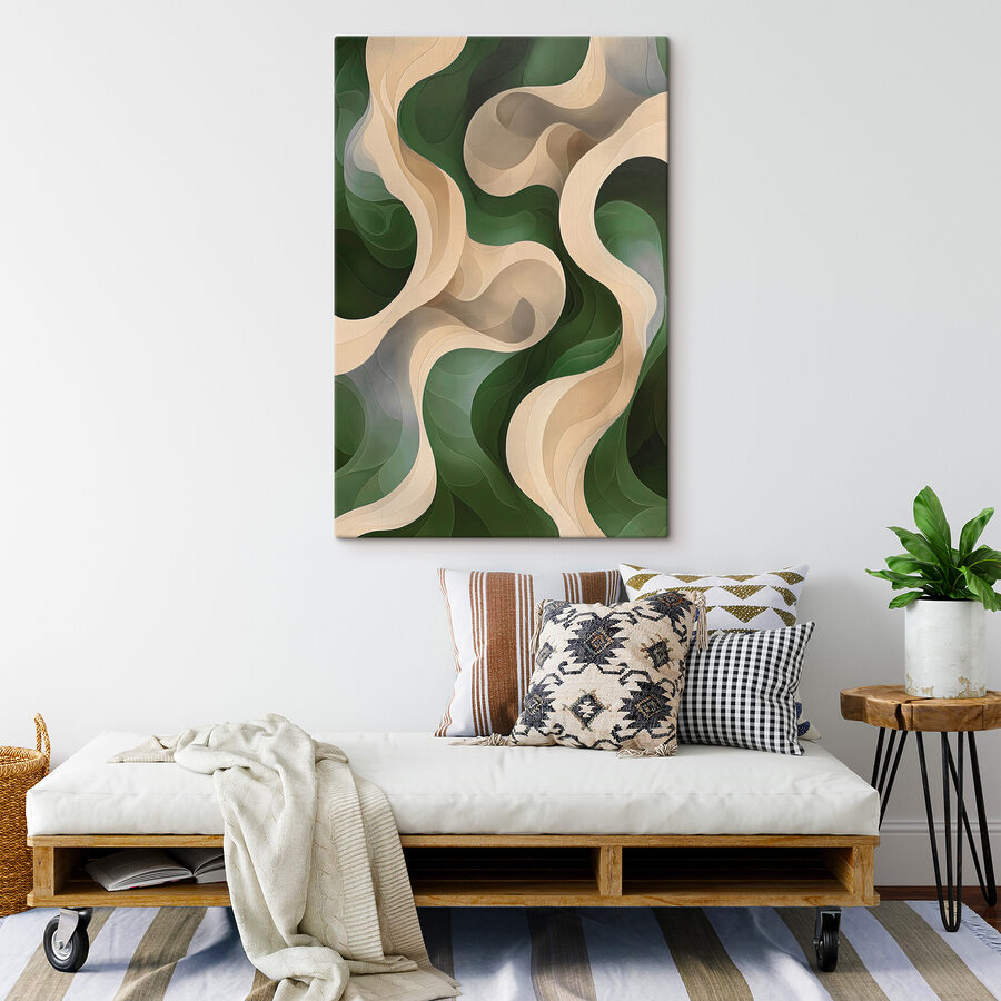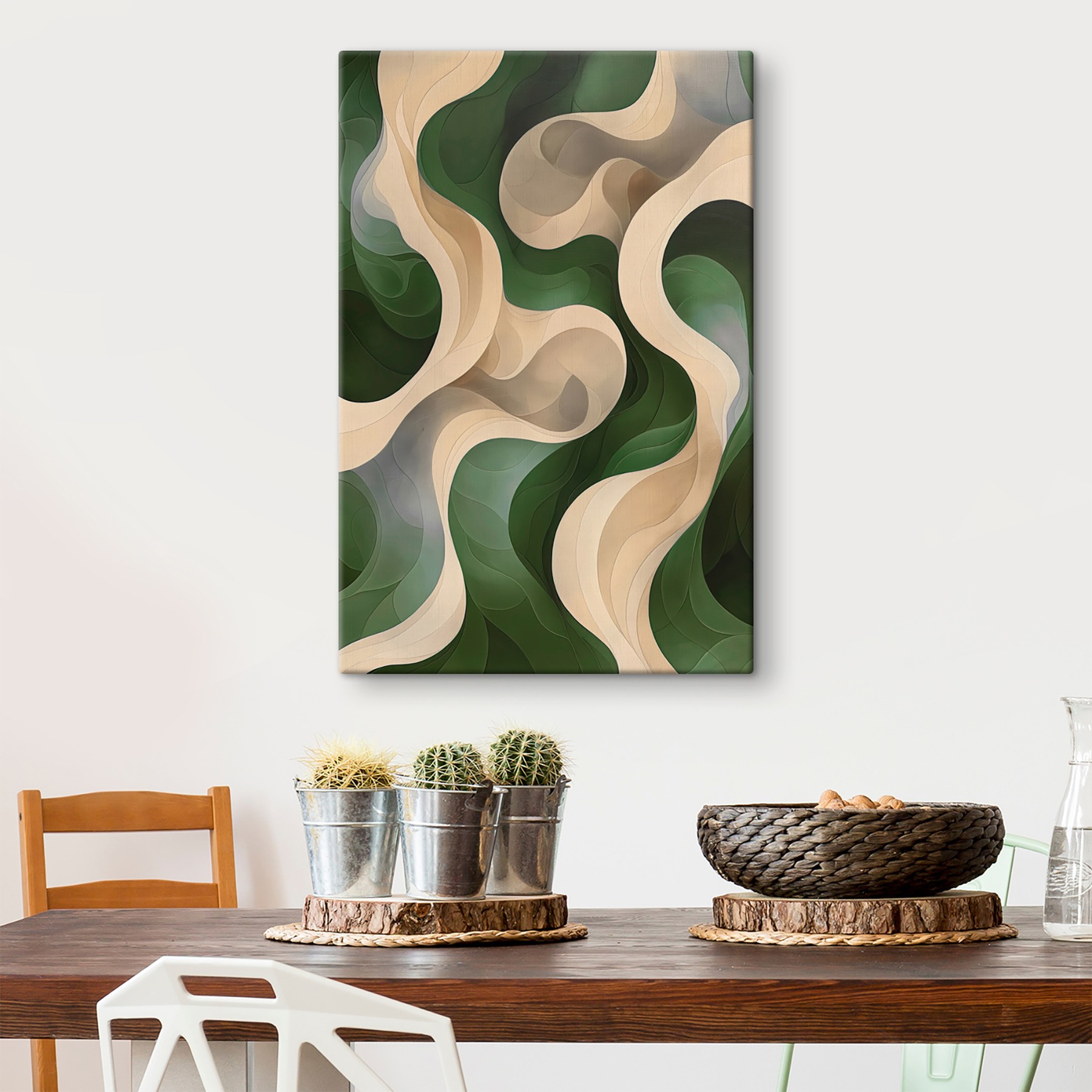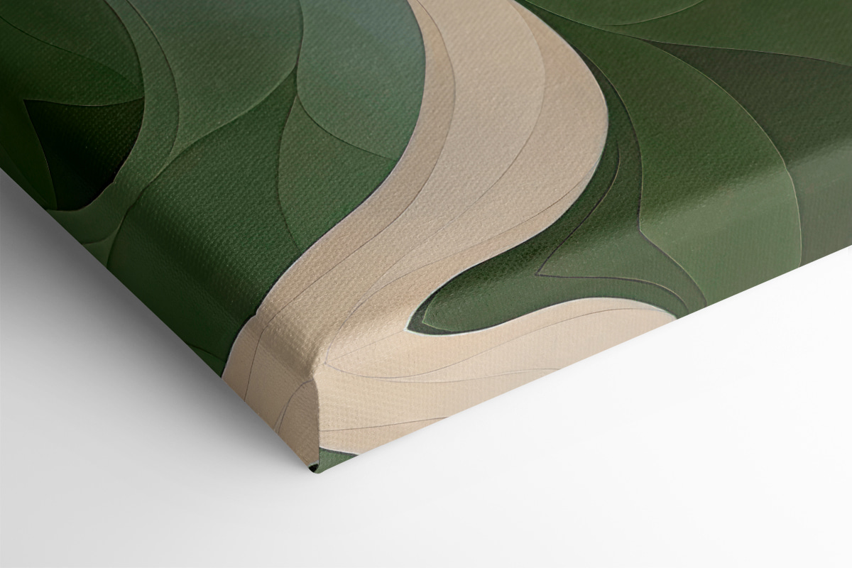 Dompel jezelf onder in een wereld waar groen en crème elkaar ontmoeten in een lieflijke dans van golven. Deze canvasprint met zijn zachte rondingen en vloeiende patronen geeft een serene sfeer die elke ruimte kan transformeren. Zie het al hangen in een gezellig leeshoekje – perfect voor die rustige namiddagen met een kopje thee. De combinatie van kleuren voelt als een zacht briesje op een warme dag, zacht maar opbeurend. Het is als de rust na een regenbui, die rust en een vleugje natuur binnenshuis brengt. Dit kunstwerk hangt niet zomaar aan de muur, het fluistert een verhaal over evenwicht en harmonie en nodigt je elke keer uit om het beter te bekijken. Voeg dit stuk toe aan je inrichting en zie hoe je kamer op subtiele maar prachtige wijze tot leven komt.