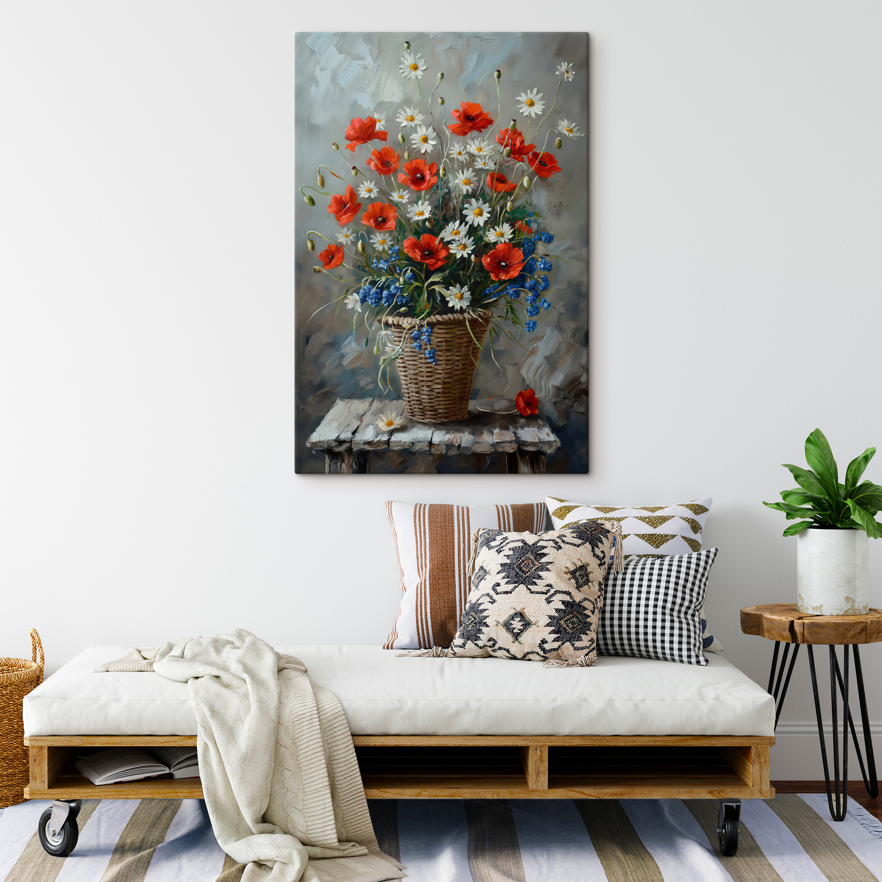Fleur elke kamer op met deze vrolijke canvasprint van bloemen in een mand. Stel je voor dat je door een gezellige tuin wandelt, waar rood, zonnig wit en levendig blauw voor je ogen dansen. Dit stuk brengt die frisse tuinsfeer binnenshuis en voegt een vleugje kleur toe aan saaie muren. Perfect voor de keuken, woonkamer of zelfs een klein hoekje waar ‘s ochtends koffie wordt gedronken. Het is alsof je een vriendelijk boeket hebt dat nooit verwelkt en altijd een glimlach op je gezicht tovert. Over weinig onderhoud gesproken: deze schoonheid heeft geen water nodig! Of het nu een cadeautje is of een traktatie voor jezelf, het zal je geest zeker opvrolijken en elke blik vrolijk maken.