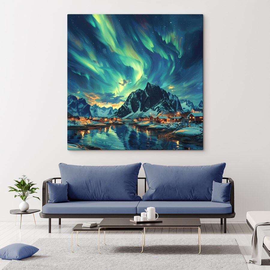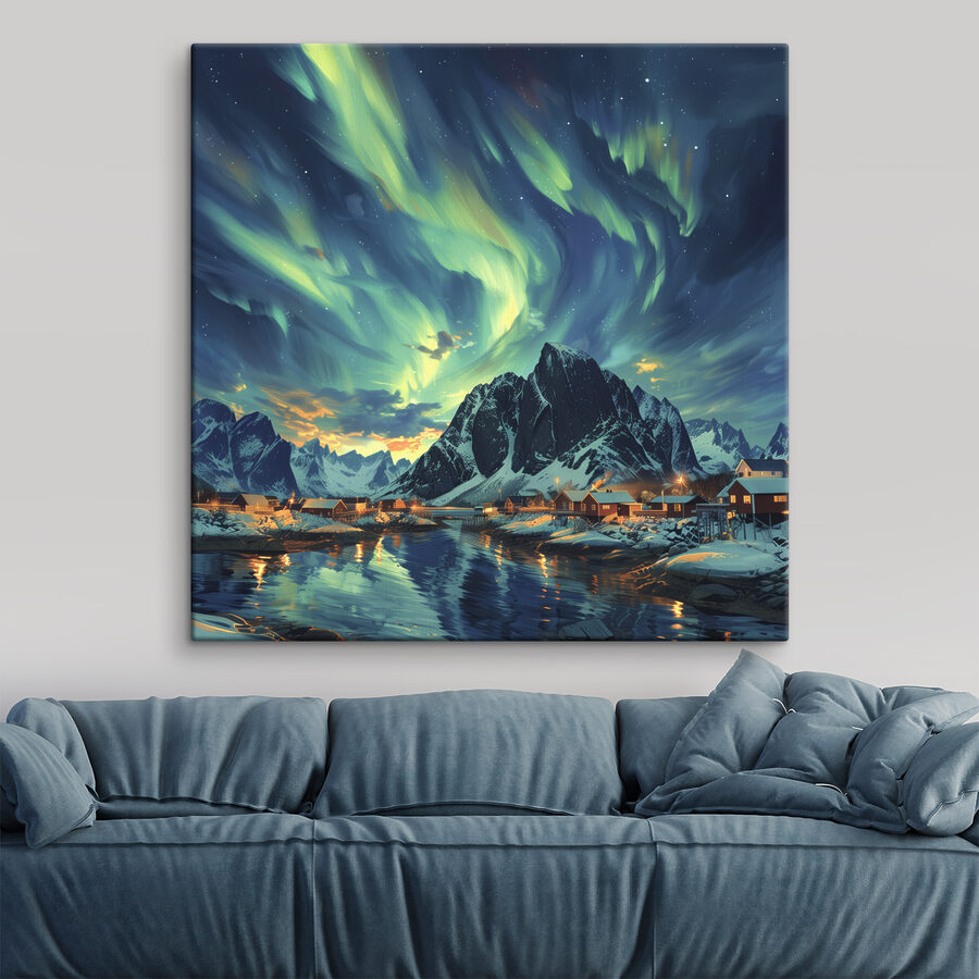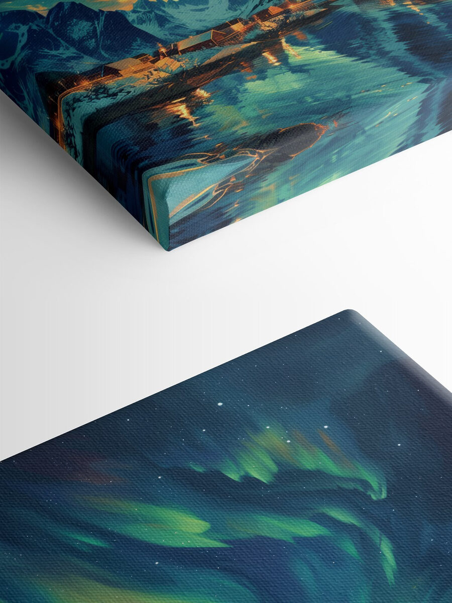 Stel je eens voor dat je wakker wordt in een wereld waar de lucht danst van de kleuren, zachte sneeuw de grond bedekt en gezellige huizen langs een sereen meer staan. Met deze canvasprint “Landschap met een meer en huizen in de sneeuw” haal je die sfeer in huis. Het is perfect voor natuurliefhebbers of dromers die een besneeuwd wonderland niet kunnen weerstaan. Voel de vredige sfeer je kamer binnensijpelen. Het kan zelfs inspireren tot een kop warme chocolademelk bij het vuur. Zet hem ergens neer waar je je ontspant en zie hoe elke dag aanvoelt als een sneeuwdag!