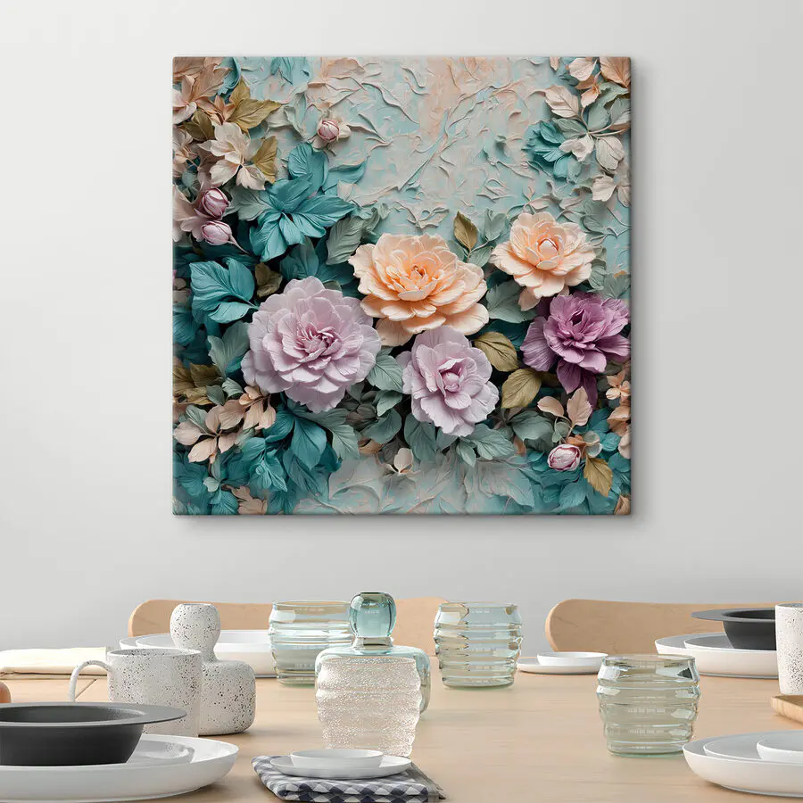 Transformeer elke kamer met deze prachtige canvasprint die een en al charme uitstraalt. Stel je een gezellige namiddag voor met binnenvallend zonlicht, een warm kopje thee in de buurt en dit prachtige ensemble van aquarelbloemen aan de muur. De zachte lila, perzikkleurige en groenblauwe tinten nodigen uit tot een gevoel van rust, waardoor elke blik als een frisse wind aanvoelt. Stel je voor dat vrienden langskomen om de kunst te bewonderen en dat jij je terloops laat ontvallen dat je muur zojuist een gratis dagje spa heeft gekregen. Het is de perfecte touch om een keuken, woonkamer of zelfs een rustig leeshoekje op te fleuren. Laat de bloemen hun werk doen!