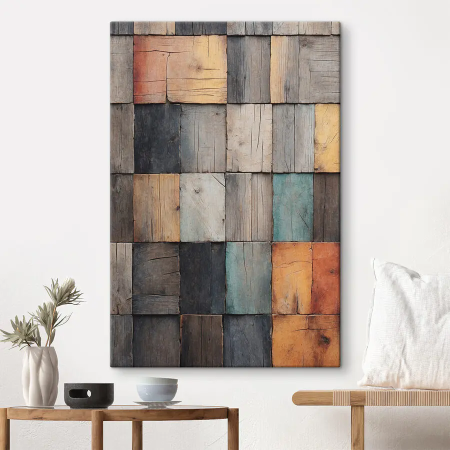 Stap in een gezellige hut sfeer met deze canvas print met een stijlvolle lappendeken van houten planken. Elke plank vertelt een verhaal en de mix van zachte tinten voegt een warme touch toe aan elke ruimte – perfect om die eenzame muur om te toveren in iets uitnodigends. Stel je voor dat je lekker op de bank gaat liggen met een kop koffie in de hand, terwijl deze schoonheid subtiel karakter en charme toevoegt aan je kamer. Het is alsof de natuur je inrichting heeft overgenomen, zonder de splinters. Geweldig voor woonkamers, thuiskantoren of zelfs een chill leeshoekje. Maak je klaar voor complimenten!