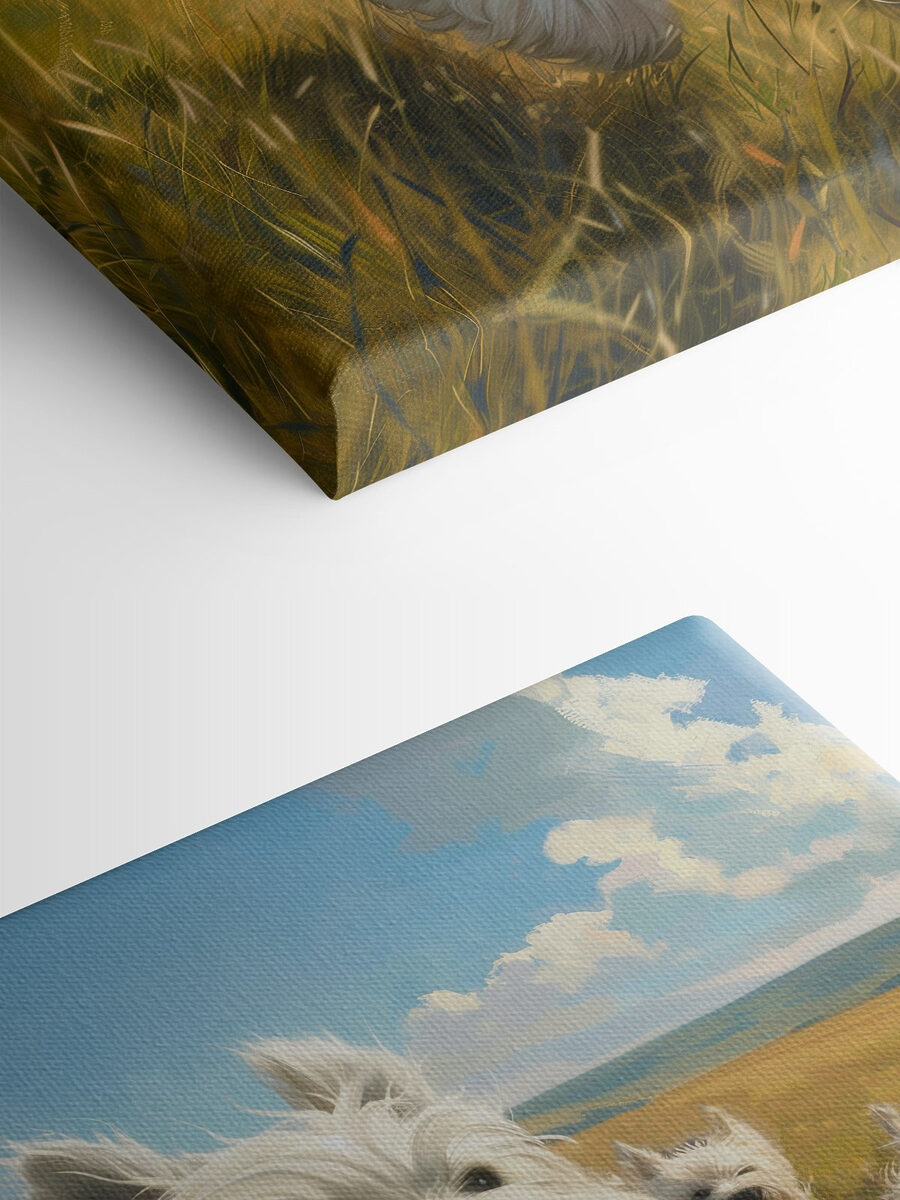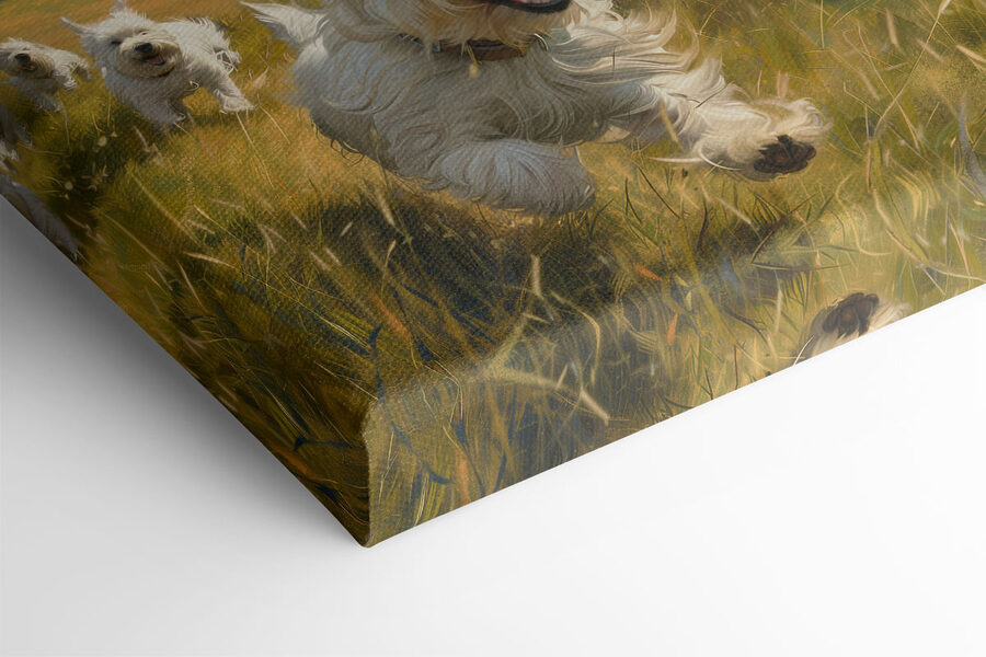 Stel je voor dat je deze energieke, vrolijke explosie van harige vrienden op je muur hebt. Het is als een momentopname van puur geluk en vrijheid! “Canvas Schilderijen s40358” vangt de essentie van een perfecte dag: vijf schattige witte honden die door een open veld rennen, de bries die hun vacht optilt terwijl ze vol overgave sprinten. Je kunt de warme zon en het zachte gras onder je voeten bijna voelen! Deze pittige pups brengen een speelse, levendige sfeer – perfect om elke kamer op te fleuren. Of je nu een zware dag achter de rug hebt of gewoon een energieboost nodig hebt, deze print herinnert je aan eenvoudige vreugden en zorgeloze momenten. Hij is ook veelzijdig – ideaal voor elke ruimte die wat meer vrolijkheid en eigenzinnigheid nodig heeft. Dit stuk is niet zomaar kunst; het is een dagdroom. Stel je voor: lekker achterover leunen met een kopje koffie, staren naar deze gelukkige honden en je een beetje lichter voelen. Wie wist dat kunst kon kwispelen en je laten glimlachen?