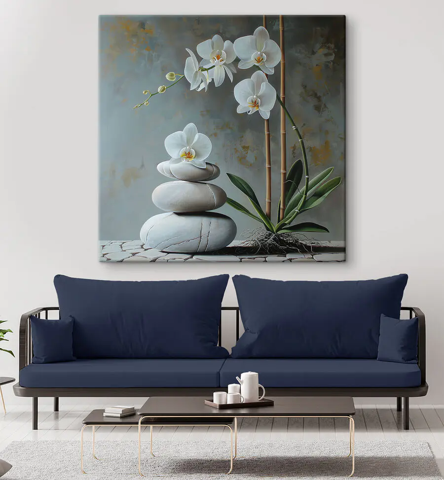 Stel je voor dat je een serene oase binnenstapt telkens als je een blik werpt op deze canvasprint. Met delicate orchideeën in balans op gladde stenen is het net een mini-spa-dag aan je muur. De zachte kleuren nodigen uit tot kalmte, waardoor het perfect is voor ruimtes waar ontspanning belangrijk is, zoals woonkamers, leeshoekjes of zelfs een gezellige slaapkamer. Het stimuleert ook gesprekken; wat is er intrigerender dan een plant en wat stenen, toch? Elke keer als iemand er naar kijkt, komt er een golf van vrede door de kamer. Fris je inrichting op zonder de bank te breken; dit stuk doet het zware werk terwijl jij gewoon achterover leunt en geniet van de sfeer.