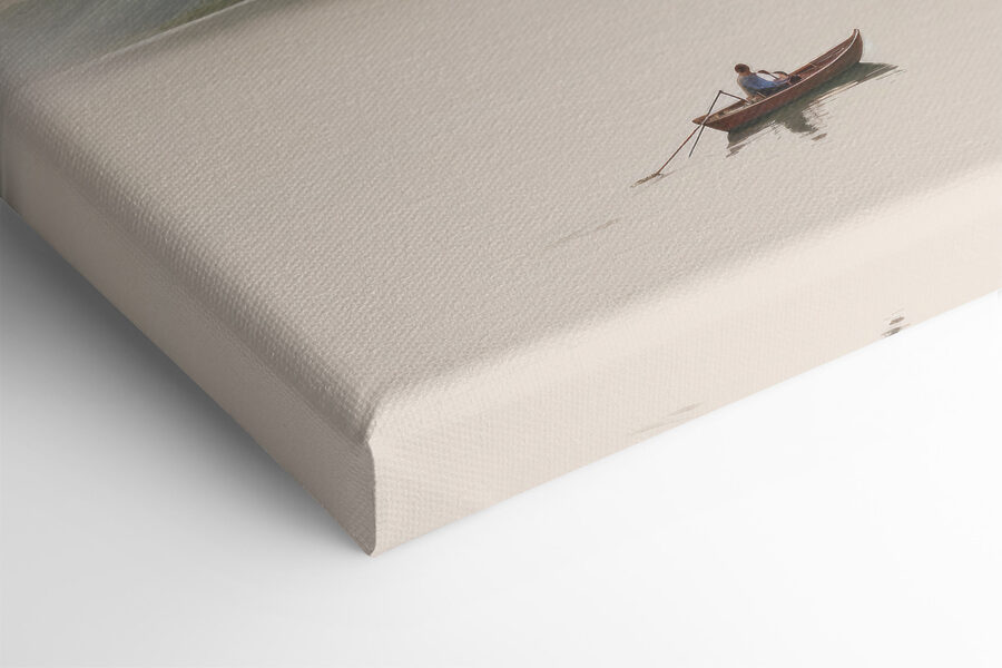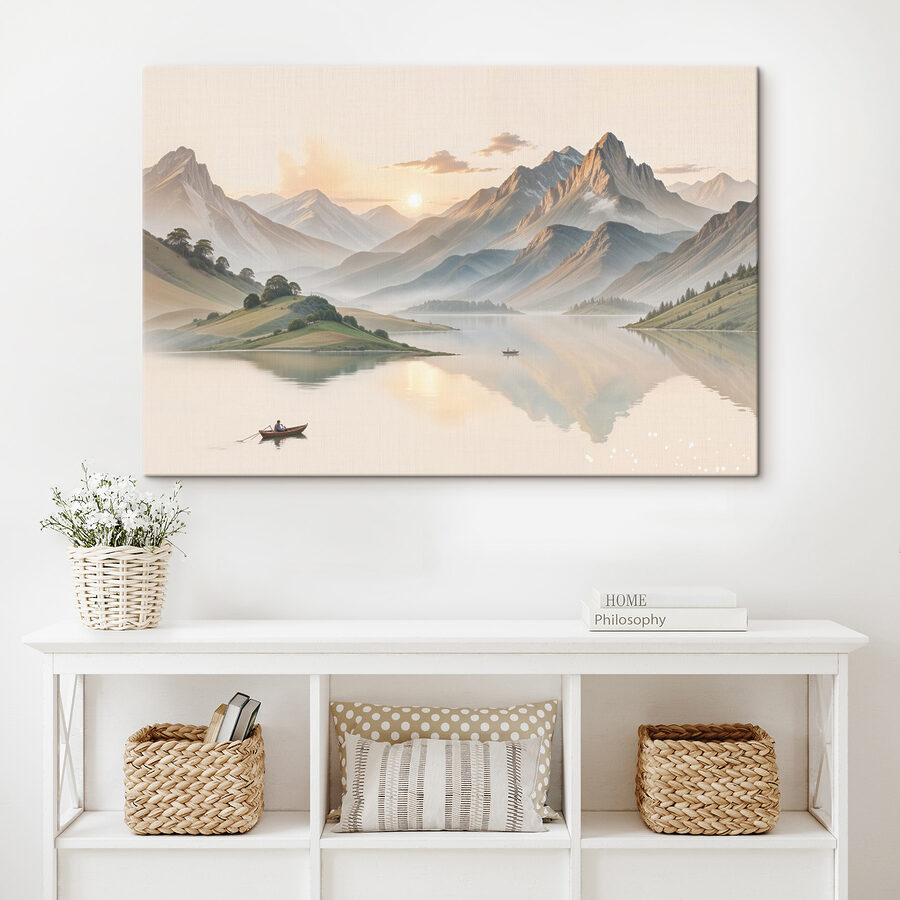 Transformeer elke ruimte met deze prachtige canvasprint met een sereen meer omringd door majestueuze bergen en een rustige boot die over het water glijdt. Het is als een mini ontsnapping naar de natuur zonder de wandelschoenen. Stel je voor dat je lekker knus in je woonkamer gaat zitten, dit kunstwerk aan de muur hangt en de rust over je heen voelt komen na een lange dag. De zachte tinten vloeien in elkaar over en roepen herinneringen op aan vredige zomers en een zacht briesje. Perfect om gesprekken op gang te brengen of gewoon om bij weg te dromen terwijl je koffie drinkt. Het is een kunstwerk dat verhalen van avontuur en rust fluistert.