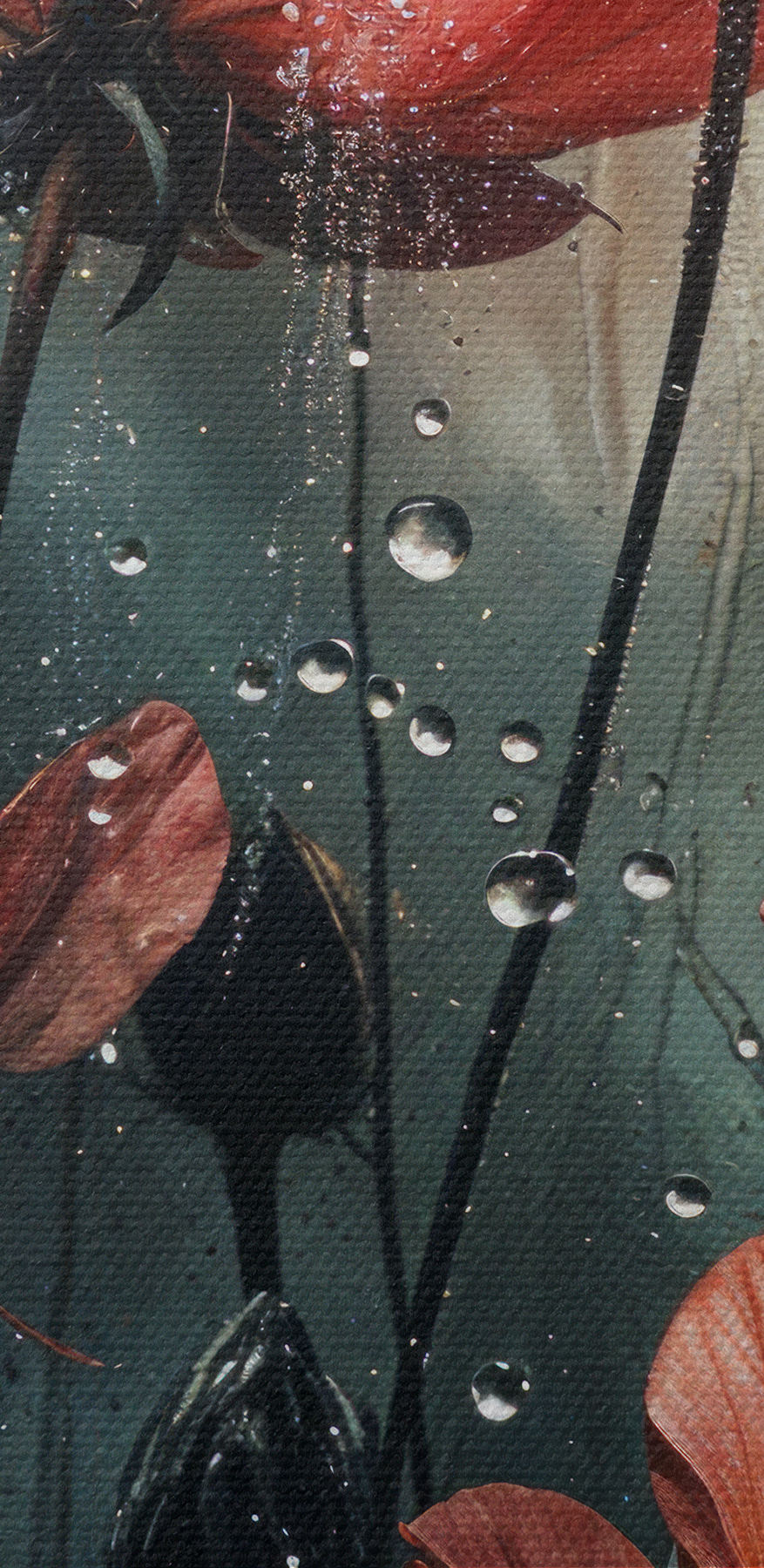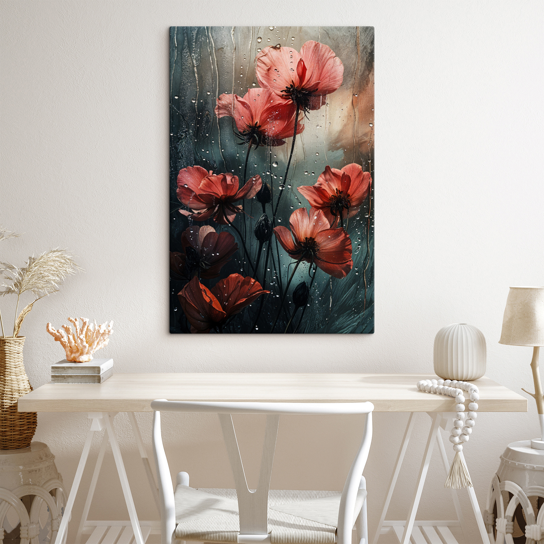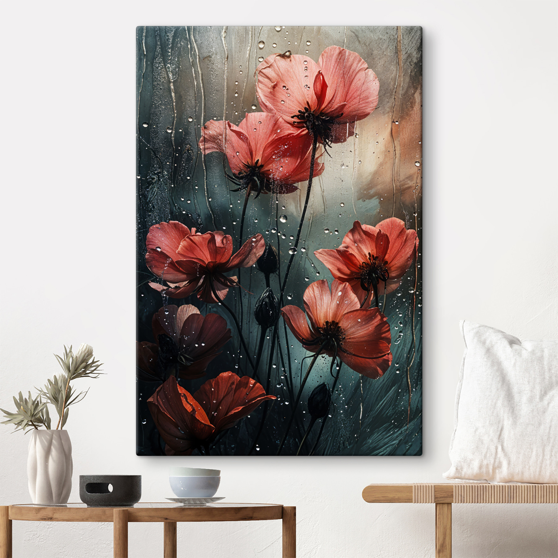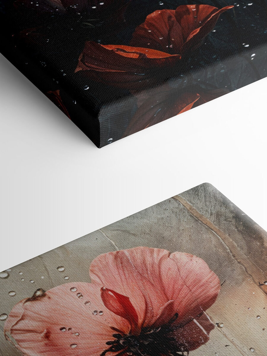 Breng een vleugje natuurlijke dramatiek in je interieur met “Rain-kissed blossoms embrace the storm”. Stel je deze delicate bloemen voor dansend onder een zachte regenbui, druppels glinsterend als kleine juwelen. Tegen een zachte, stemmige achtergrond legt deze canvasprint zowel de kwetsbaarheid als de veerkracht van het leven vast. Het is als een zachte herinnering dat stormen plaats kunnen maken voor schoonheid. Perfect voor die lege muur die om aandacht smeekt of om een gesprek op gang te brengen bij een gezellig kopje thee. Laat deze bloemen leven, kleur en een vleugje intrige brengen in elke kamer. Wie wil er nou niet knus zitten met zo’n sfeer?