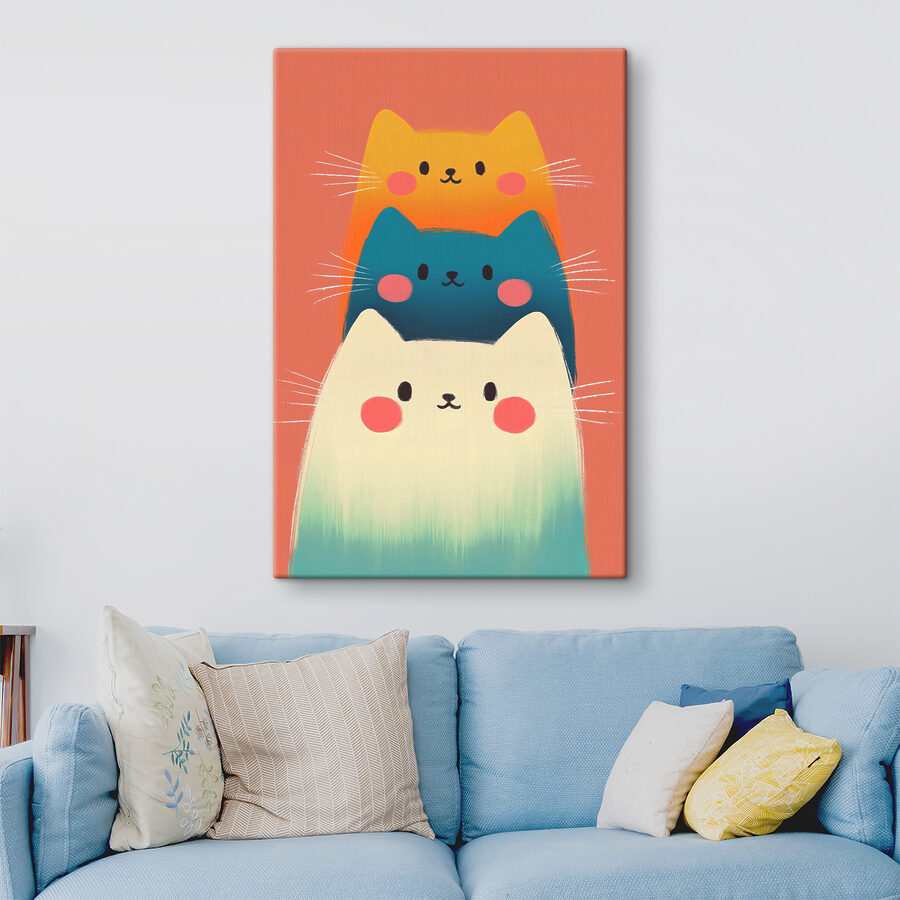 Heb je een voorliefde voor eigenzinnige en schattige decoraties? Maak dan kennis met “Canvas Schilderijen s40431”! Dit levendige stuk is perfect voor iedereen die een vleugje eigenzinnigheid niet kan weerstaan – kijk maar eens naar die kleurrijke katten opgestapeld als een gezellige katachtige toren! Het tovert zeker een glimlach op je gezicht en vrolijkt je muren op. Geweldig voor elke hoek van het huis die wel een oppepper kan gebruiken, bijvoorbeeld de keuken, een kinderkamer of de gang.