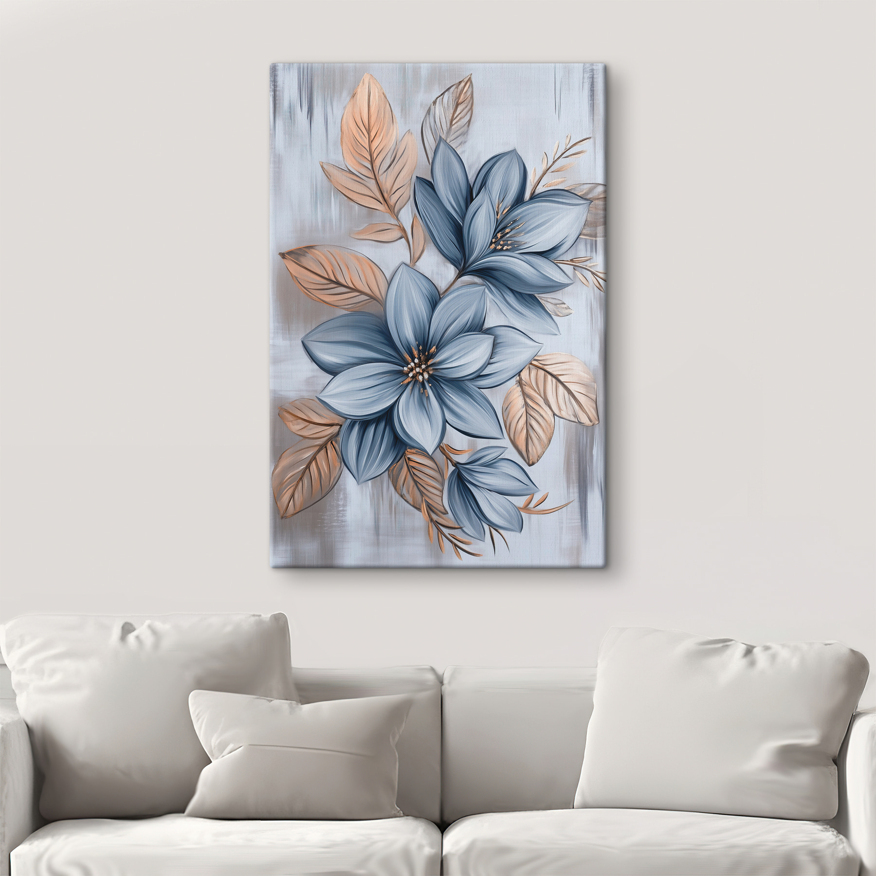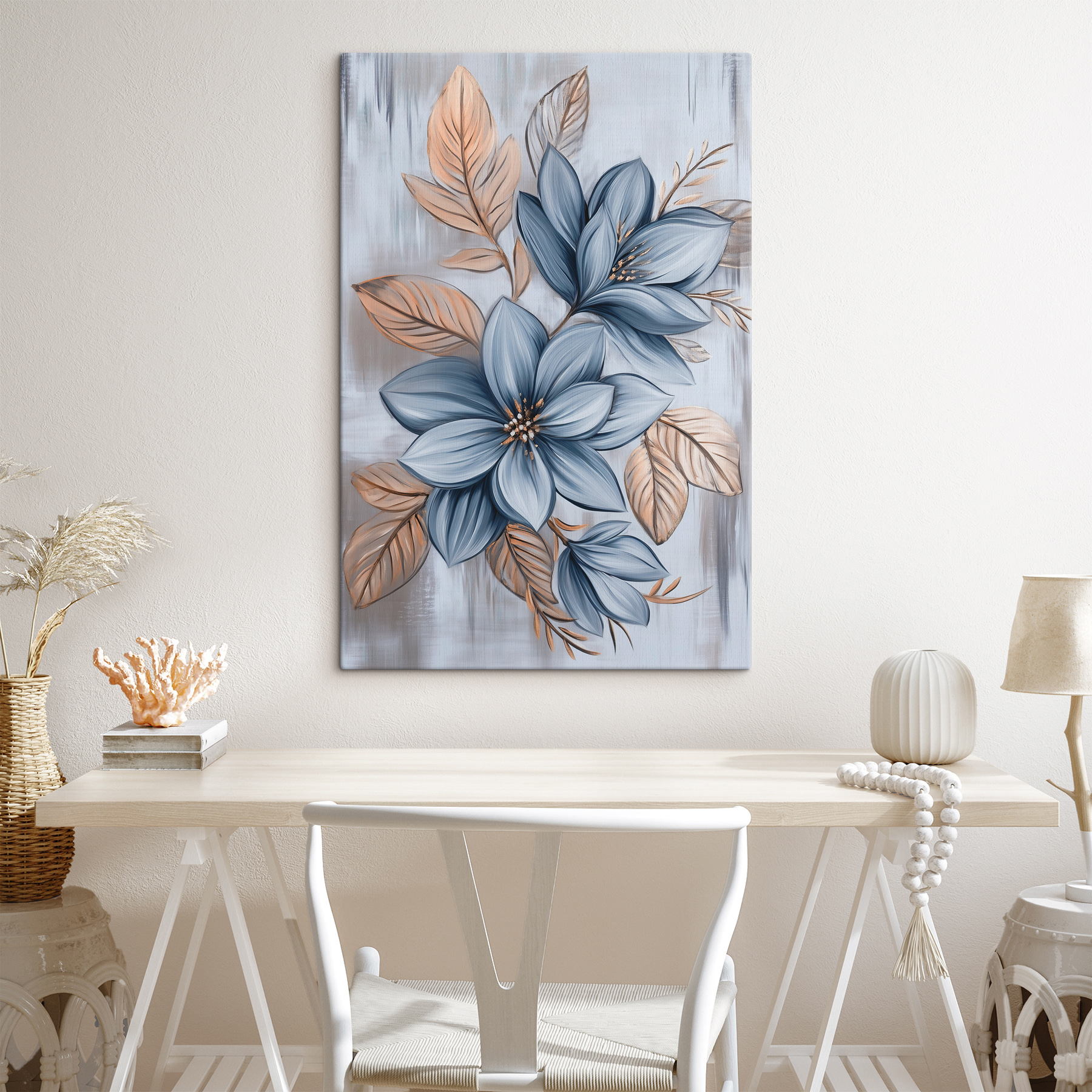 Fleur je kamer op met deze canvasprint die bloemen en bladeren tot leven brengt. Stel je voor dat je een gezellige kamer binnenstapt vol warmte en de geur van de lente, zelfs als het buiten sneeuwt. De zachte blauw- en aardetinten creëren een rustgevende sfeer, perfect voor een slaapkamer of woonkamer. Het is een mooie balans tussen gedurfd en subtiel, waardoor het een gespreksstarter is zonder te veel moeite te doen. Hang het boven een bank of bij het raam en laat de schoonheid van de natuur, gevangen op canvas, je huis veranderen in een mini-oase. Wie had gedacht dat een eenvoudig kunstwerk zo’n vreugde zou kunnen opwekken?