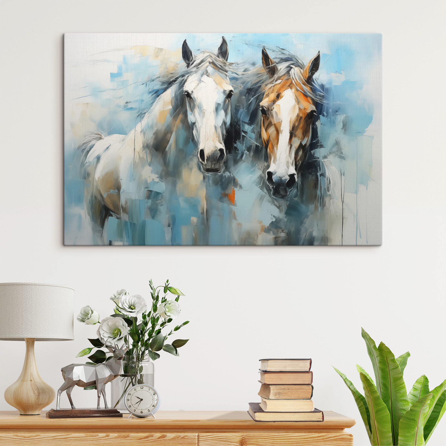 Voeg wat charme toe aan je interieur met dit fascinerende doek, “Schilderij van twee paarden”. Het is alsof je een vleugje van de natuur in huis haalt. De paarden, vol gratie en beweging, lijken bijna klaar om van het doek af te galopperen – geen extra hooi nodig! Met zijn koele blauwtinten en warme aardetinten fluistert dit werk verhalen van vrijheid en avontuur. Stel je voor dat het boven je bank hangt, zonlicht vangt en gesprekken aanwakkert. Elke blik kan een kleine ontsnapping zijn naar open velden en frisse briesjes. Perfect voor dromers en zwervers.