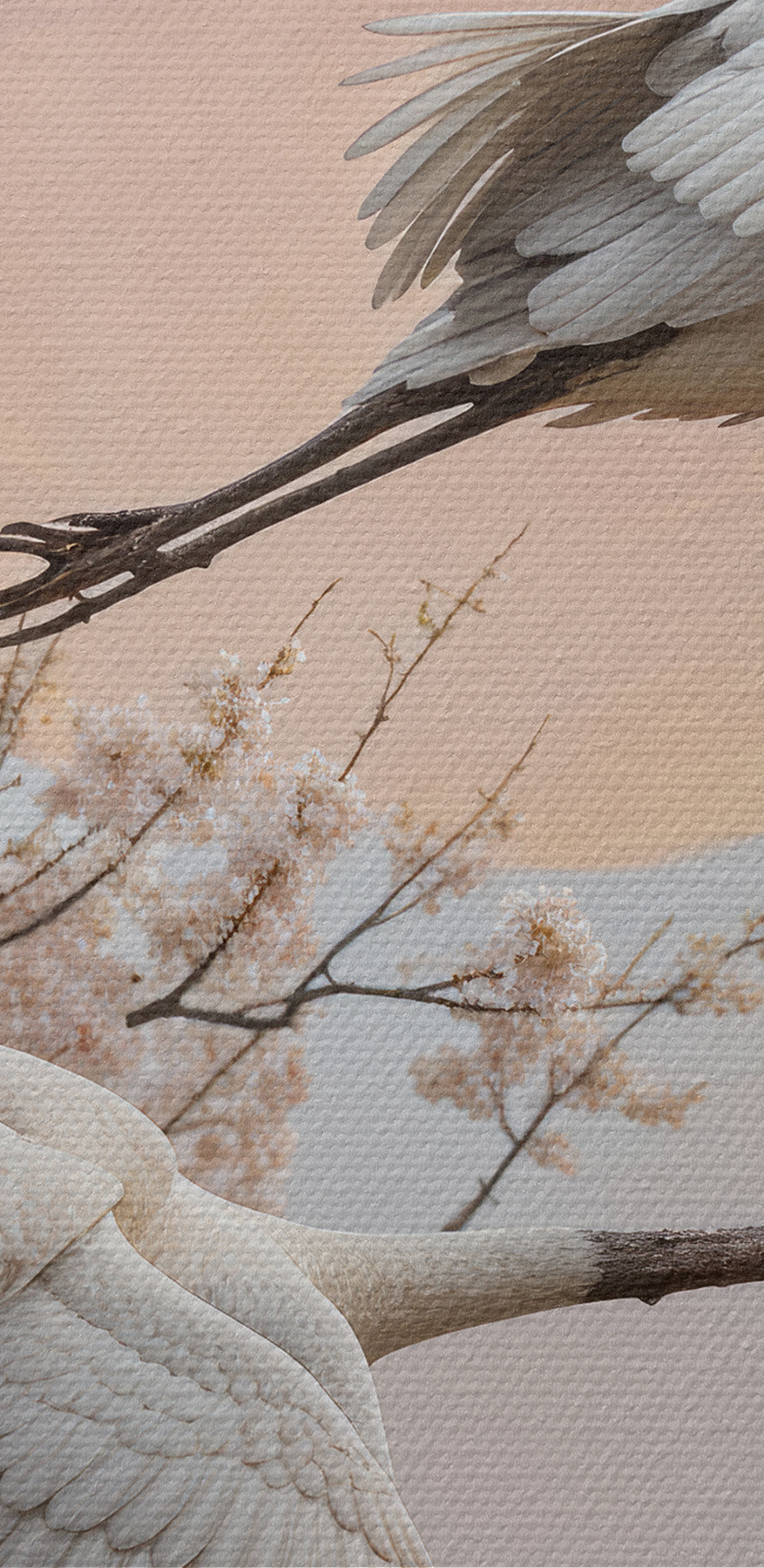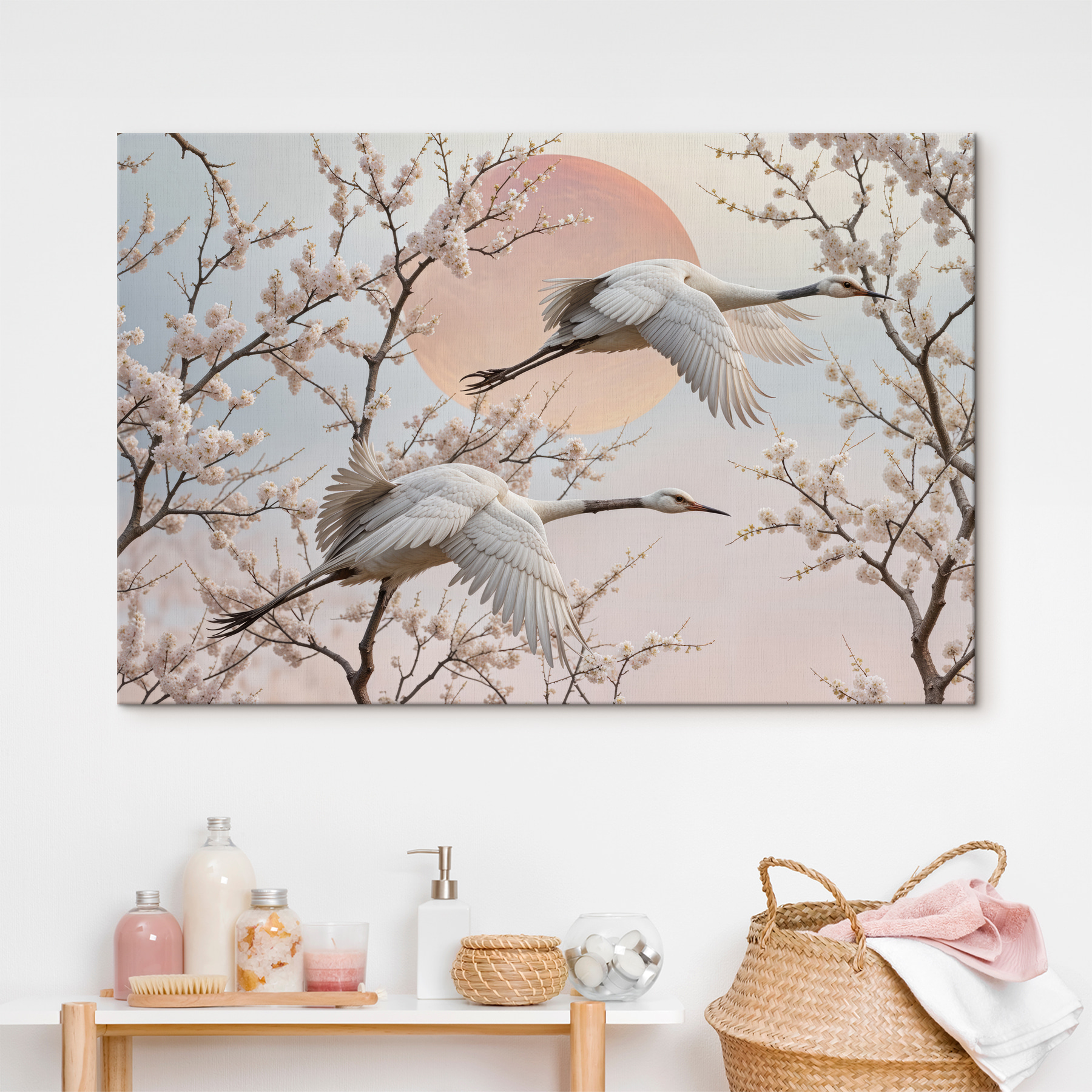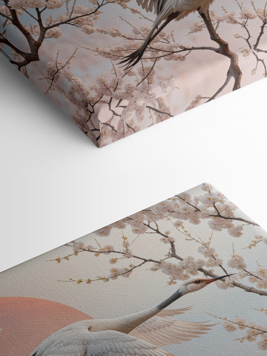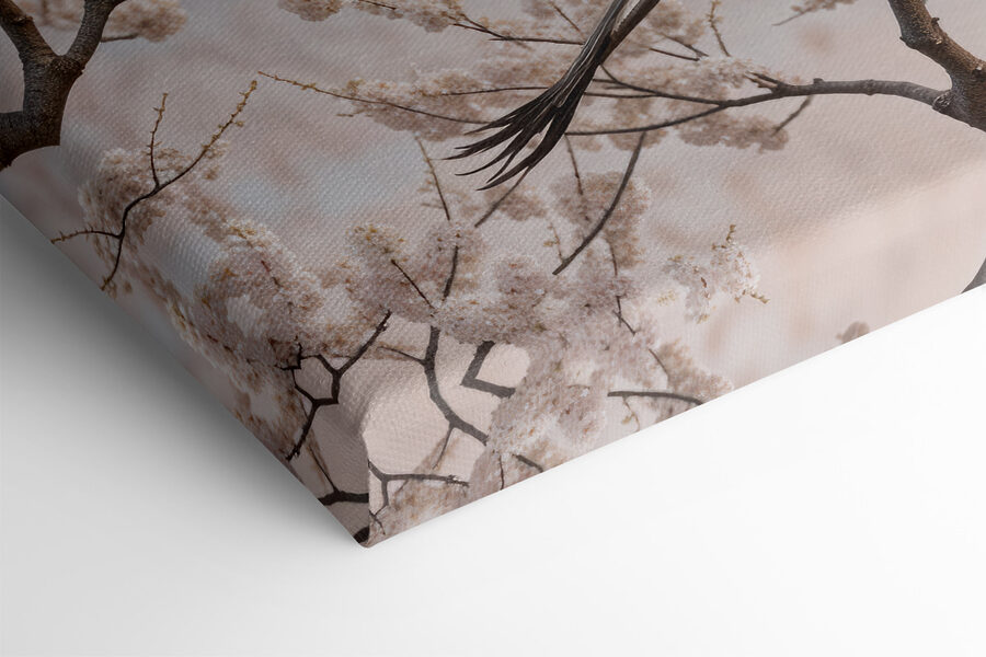 Stel je voor: je zit aan de thee en daar, aan je muur, hangt deze prachtige canvasprint van vogels in volle vlucht. Het is alsof je op pauze staat op een perfect moment – die elegante vleugels die door de lucht vliegen, kersenbloesems die hun reis omlijsten. Kun je de bries bijna voelen? Deze print hoort thuis in een serene ruimte, misschien waar je ontspant of een boek leest. Het fluistert kalmte en vrijheid, en nodigt uit tot dagdromen over zweven tussen zachte wolken. Echt, het is als een beetje frisse lucht voor je huis.
