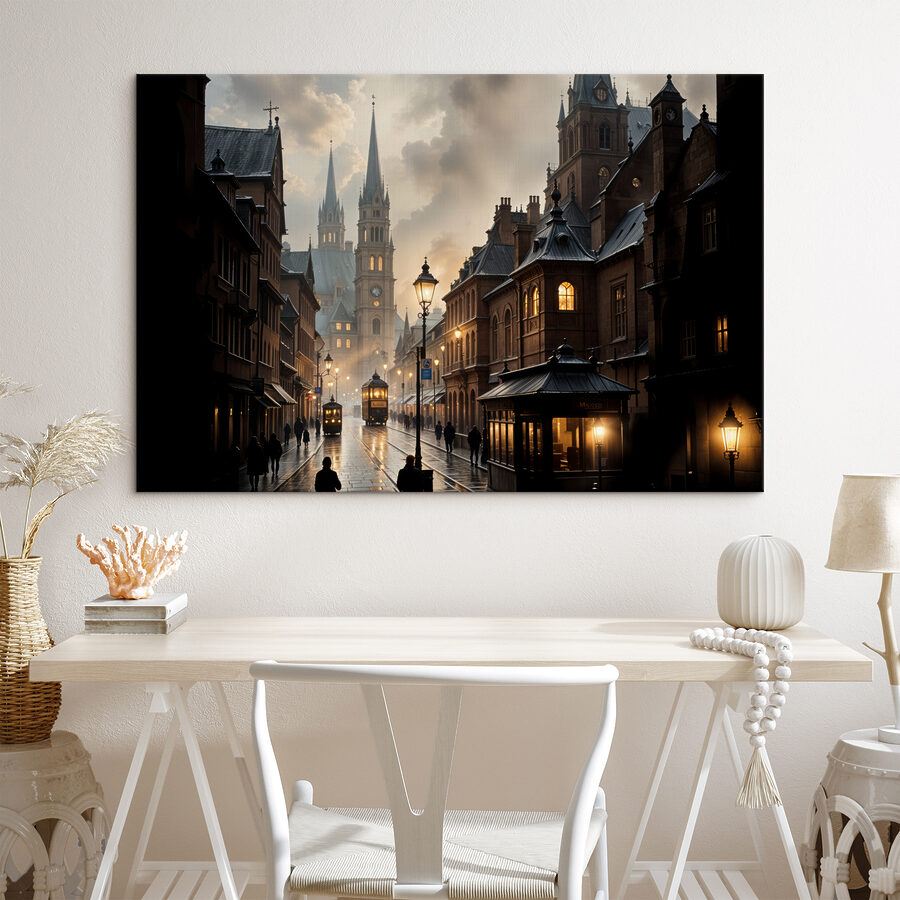 Ooit het gevoel gehad dat een straat verhalen kan vertellen? Dit doek doet dat zeker! Een charmant tafereel waar kinderkopjes het ochtendlicht kussen en een schilderachtige trein voorbij ratelt. Het voelt alsof je in een vintage roman stapt, waar de tijd rustig voortkabbelt en alles een beetje magisch is. Perfect voor dat knusse hoekje of die muur in de woonkamer die een vleugje ouderwetse charme nodig heeft. Misschien droom je er wel van om zelf door deze pittoreske straatjes te dwalen, met een kopje koffie in de hand, genietend van het vredige stadsrumoer. Het is net een mini-uitstapje, gewoon bij je thuis!
