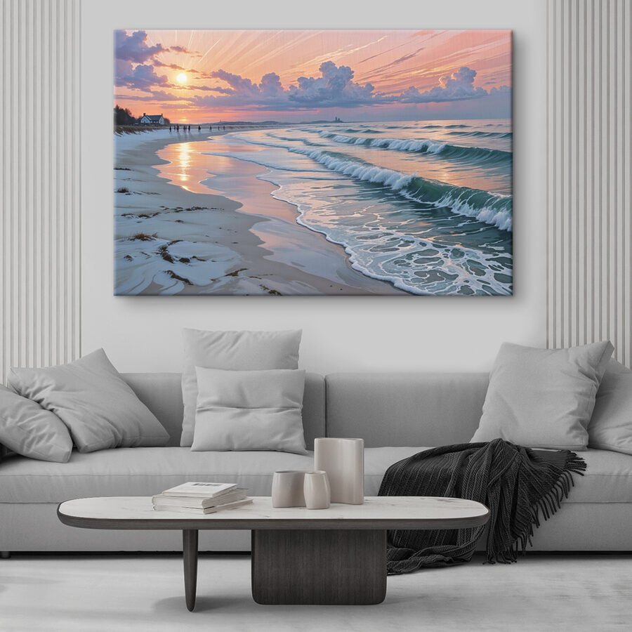 Stel je voor: een zonovergoten strand, golven die zachtjes binnenrollen, de horizon die de lucht in allerlei dromerige kleuren schildert. Deze canvasprint “Strand met golven en mensen” vangt die perfecte oceaan-sfeer. Stel je voor dat je in je woonkamer zit, met je voeten omhoog en net doet alsof je de zeemeeuwen kunt horen. Het is het soort kunst dat een ruimte een ontspannen en luchtig gevoel geeft, zoals een minivakantie aan je muur. Bovendien maakt het niet uit of je nog nooit van je leven hebt gesurft; het wil gewoon met je chillen. Perfect om je innerlijke strandzwerver te ontketenen.