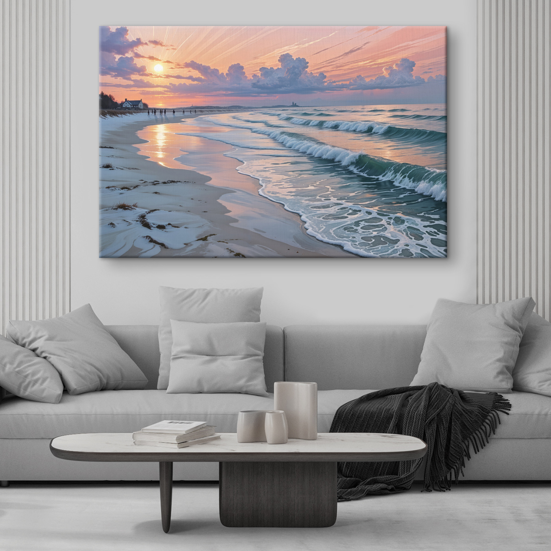 Stel je voor: een zonovergoten strand, golven die zachtjes binnenrollen, de horizon die de lucht in allerlei dromerige kleuren schildert. Deze canvasprint “Strand met golven en mensen” vangt die perfecte oceaan-sfeer. Stel je voor dat je in je woonkamer zit, met je voeten omhoog en net doet alsof je de zeemeeuwen kunt horen. Het is het soort kunst dat een ruimte een ontspannen en luchtig gevoel geeft, zoals een minivakantie aan je muur. Bovendien maakt het niet uit of je nog nooit van je leven hebt gesurft; het wil gewoon met je chillen. Perfect om je innerlijke strandzwerver te ontketenen.
