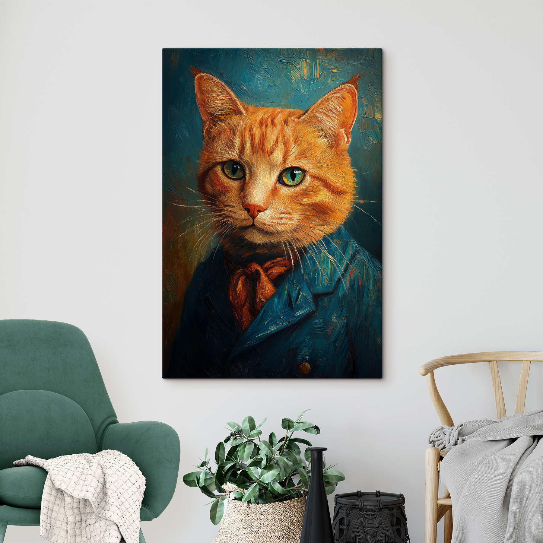 Waarom houden zoveel mensen van de canvasprint “Cat in a Suit”? Misschien zijn het die doordringende groene ogen of die scherpe outfit – deze kat lijkt klaar om een bestuursvergadering of een chic theekransje te leiden. Zie het voor je in je woonkamer. Het is niet zomaar een kat in kleren, het is een statement! Gasten zullen grinniken en knikken alsof ze een zeer serieuze (en stijlvolle) zakenkat hebben ontmoet. Voegt een vleugje eigenzinnigheid en klasse toe, nietwaar? Bijna alsof je een harige bewaker van de kunst hebt. Een mooie gespreksstarter voor elke kamer!