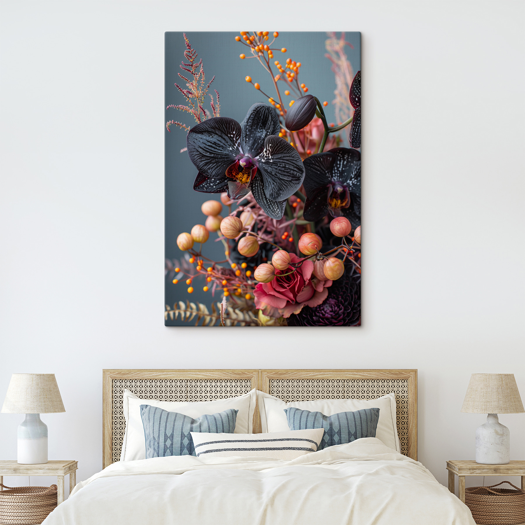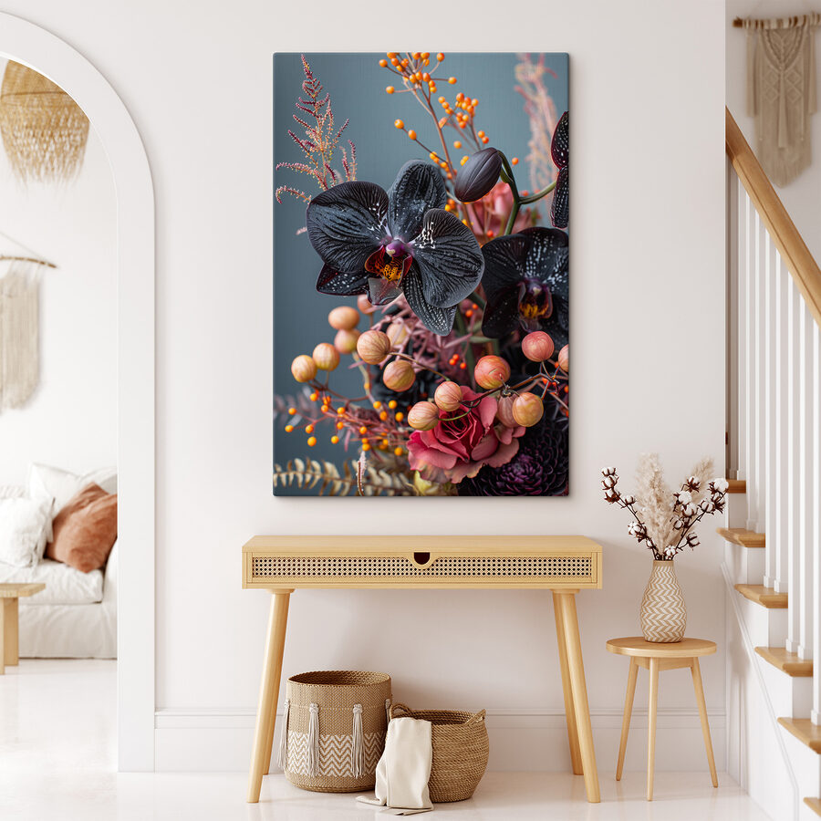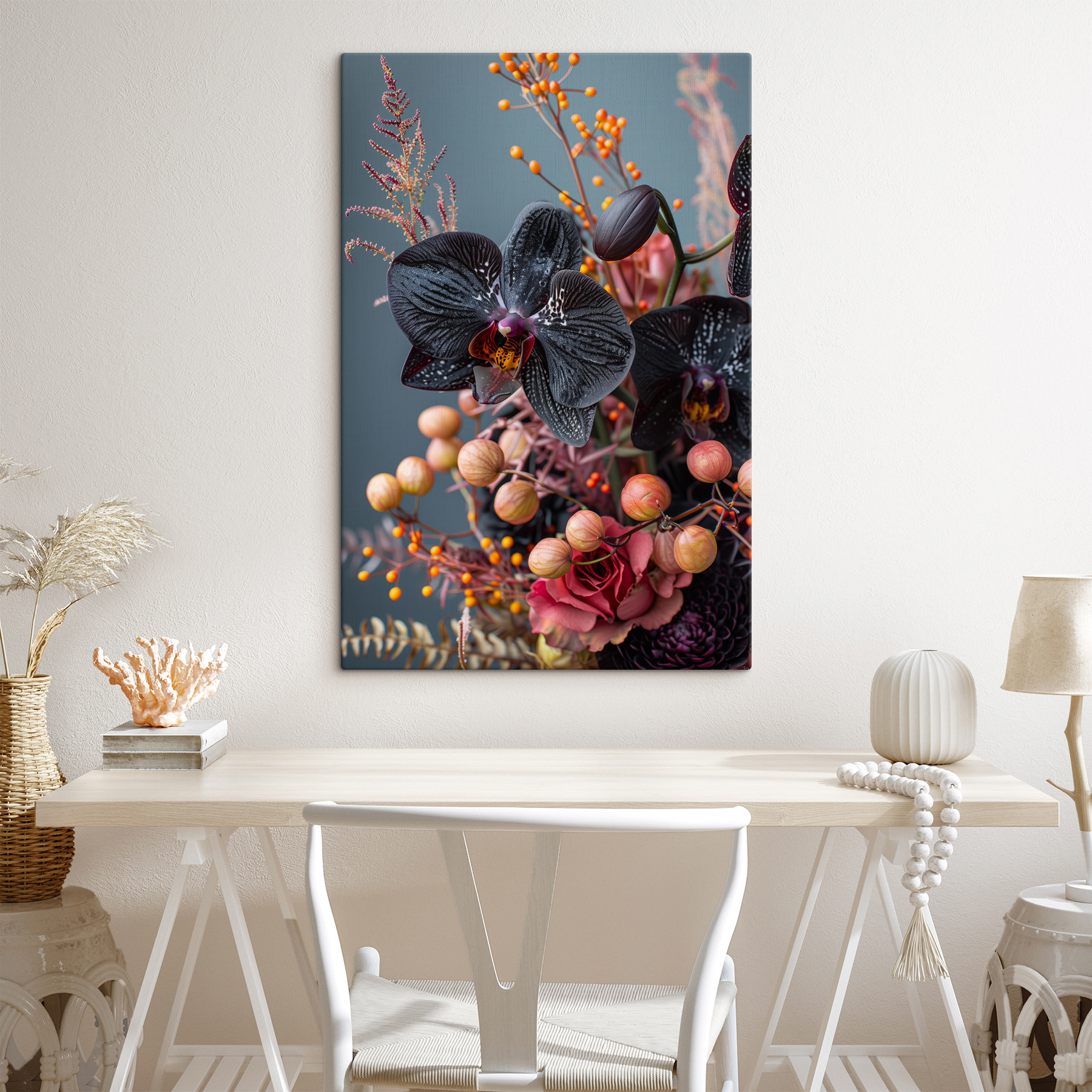 Stel je voor dat je een kamer binnenstapt en begroet wordt door de levendige elegantie van deze canvasprint. “Exquisite Orchids with Vibrant Autumn Hues is niet alleen een naam, het is een ervaring. Het diepe, dramatische zwart van de orchideeën steekt prachtig af tegen de vurige herfstkleuren. Het is alsof de natuur zelf zegt: “Hé, let op!”. Perfect voor de sfeer in elke ruimte. Of je nu koffie drinkt of vrienden ontvangt, deze kunst fluistert rust uit en steelt de sfeer. Het is meer dan decor; het is een gespreksstarter, een sfeerbooster, een stukje natuur in je huis.