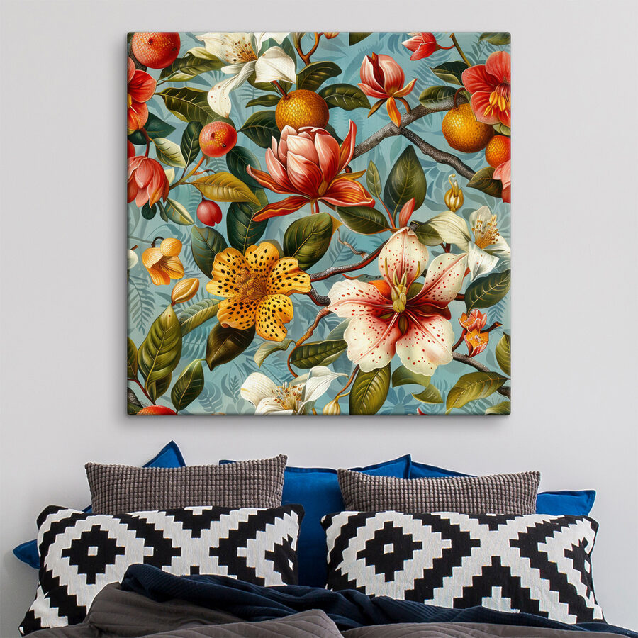 Breng een vleugje leven in elke kamer met deze oogverblindende canvasprint met een levendig bloemenpatroon verweven met vrolijke sinaasappels. Het is net een tuinfeest op je muur – water geven is niet nodig! Of je het nu in een knus hoekje plaatst of in een open woonruimte, dit kunstwerk nodigt je uit om even stil te staan en de ingewikkelde details in je op te nemen. Stel je voor dat je een warme bijeenkomst hebt waar iedereen de uitbarsting van kleur kan bewonderen. Het is niet zomaar een print; het is een conversatiestarter, een sfeerbooster en een unieke toets die elke ruimte verfrissend levendig maakt. Echt, wie wil er nu niet deze heerlijke uitbarsting van natuurlijke charme?