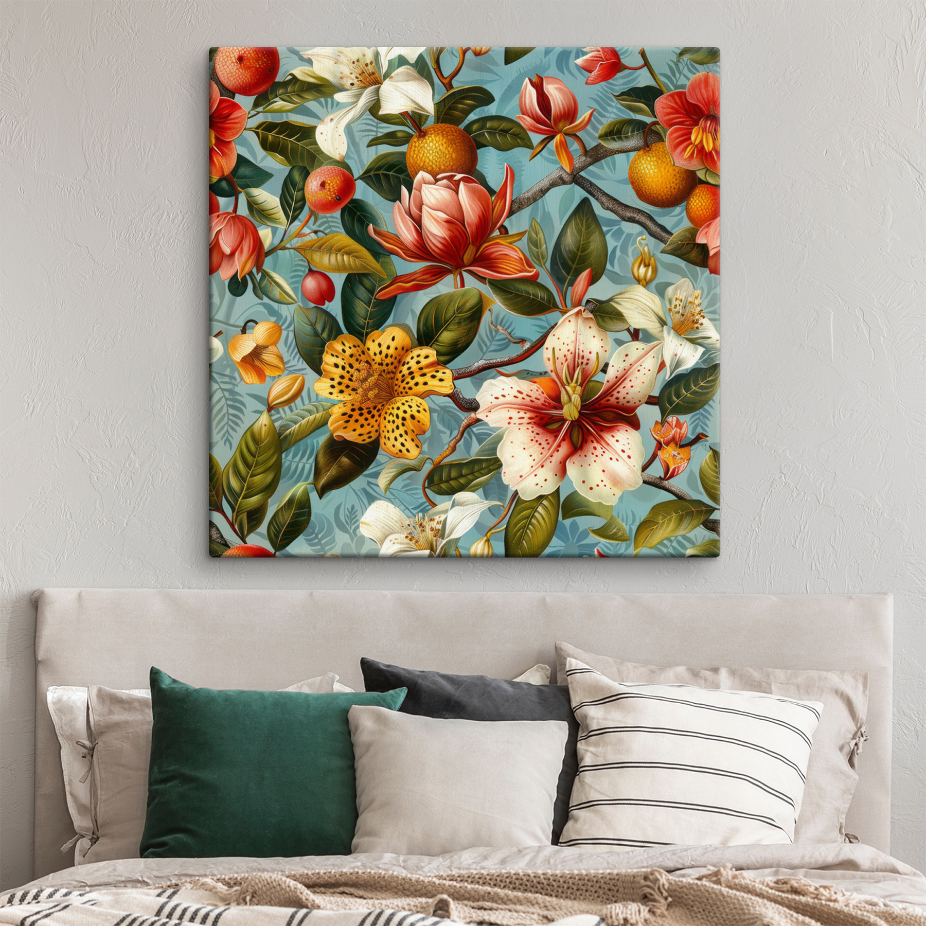 Breng een vleugje leven in elke kamer met deze oogverblindende canvasprint met een levendig bloemenpatroon verweven met vrolijke sinaasappels. Het is net een tuinfeest op je muur – water geven is niet nodig! Of je het nu in een knus hoekje plaatst of in een open woonruimte, dit kunstwerk nodigt je uit om even stil te staan en de ingewikkelde details in je op te nemen. Stel je voor dat je een warme bijeenkomst hebt waar iedereen de uitbarsting van kleur kan bewonderen. Het is niet zomaar een print; het is een conversatiestarter, een sfeerbooster en een unieke toets die elke ruimte verfrissend levendig maakt. Echt, wie wil er nu niet deze heerlijke uitbarsting van natuurlijke charme?