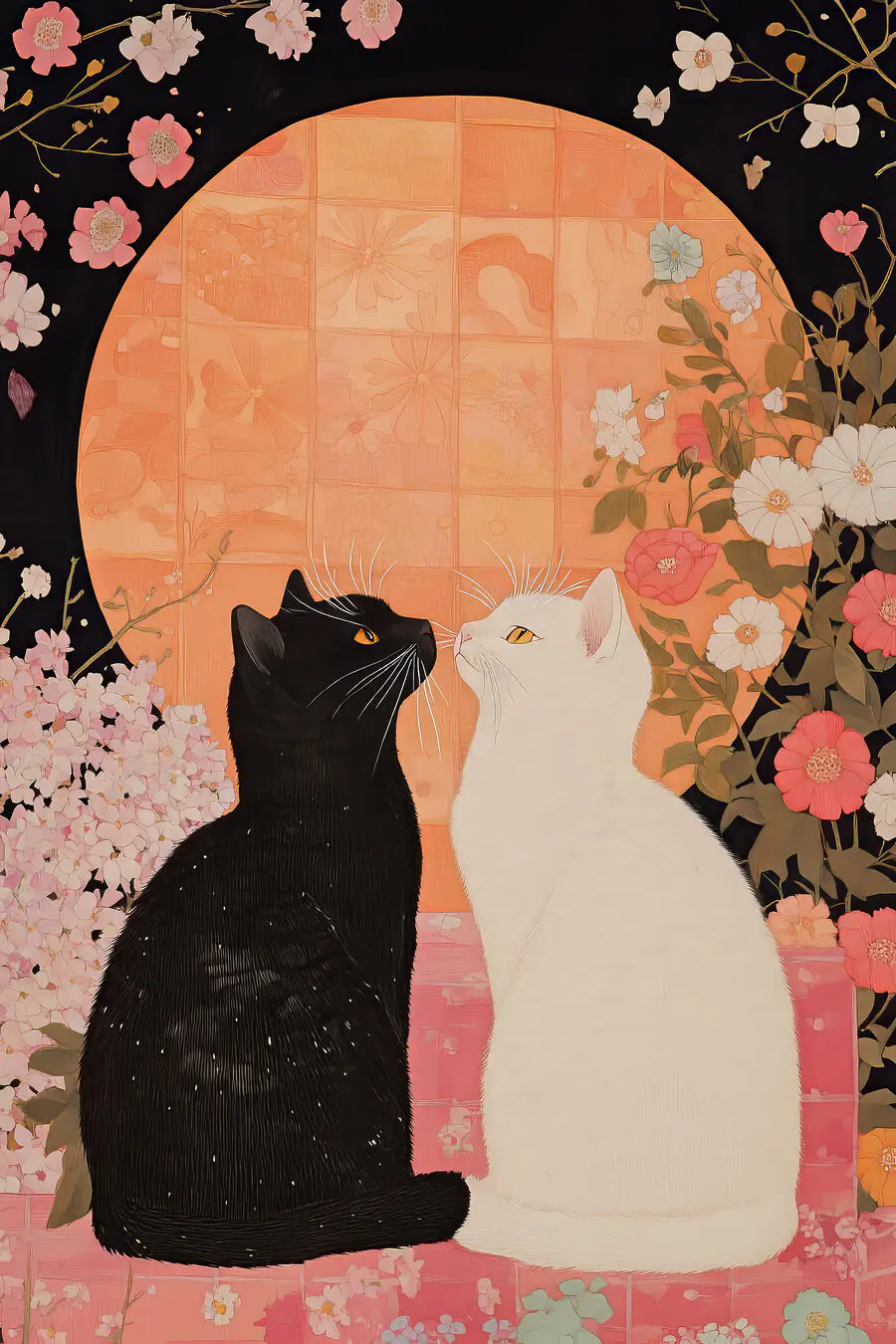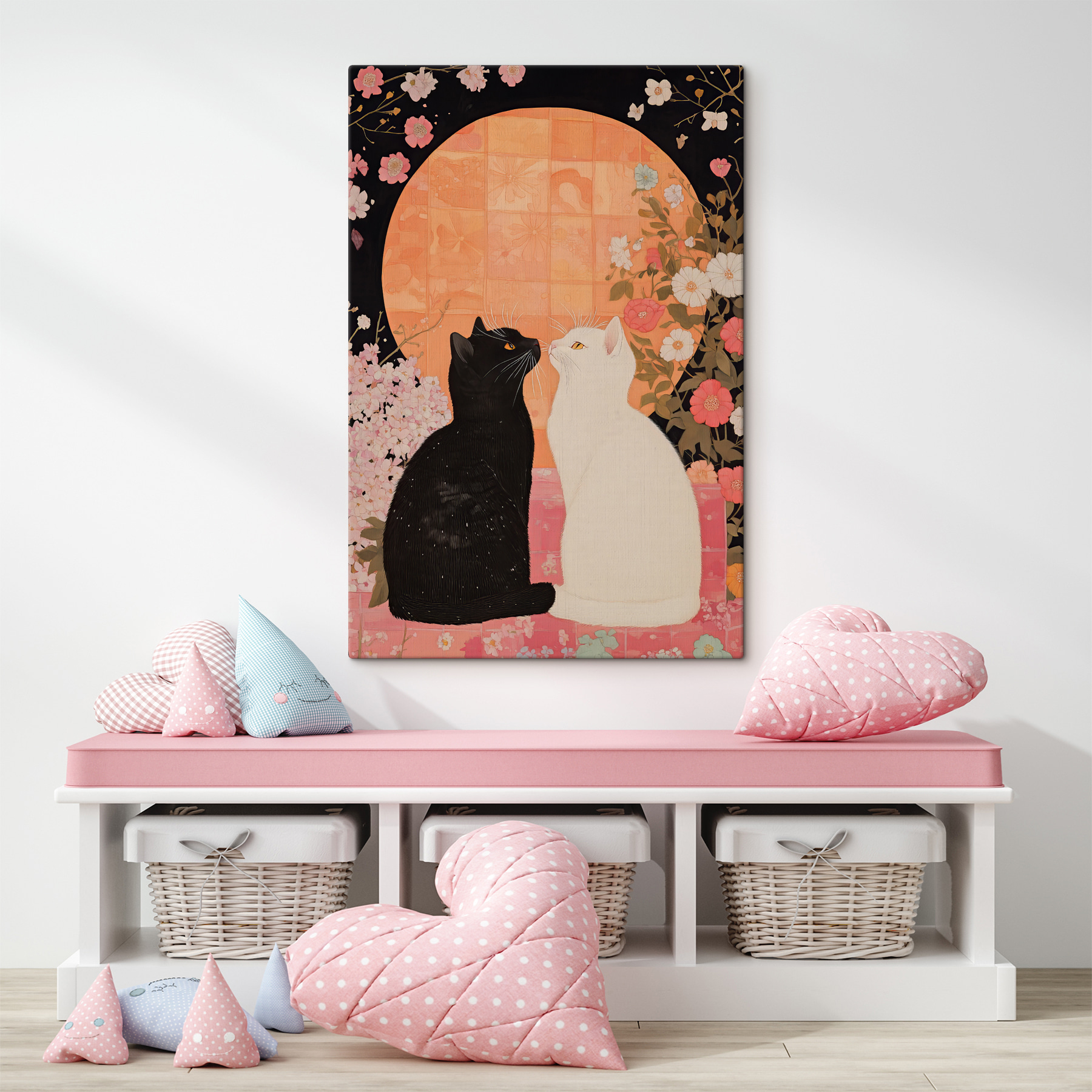 Breng een vleugje eigenzinnigheid in je interieur met het canvasdoek “Black and White Cats Looking at Each Other”. Stel je voor: twee katten, zo verschillend als dag en nacht, maar die toch een onuitgesproken band delen onder een zachte, warme gloed. Het is alsof ze geheimen van het universum uitwisselen of een speelse aanval plannen. Dit stuk combineert de charme van dierlijk gezelschap met delicate bloemendetails, perfect voor wie houdt van een mix van natuur en nieuwsgierigheid. Stel je voor dat het in je woonkamer staat en een vleugje katachtige finesse toevoegt. Het is meer dan kunst – het is een conversatiestarter!