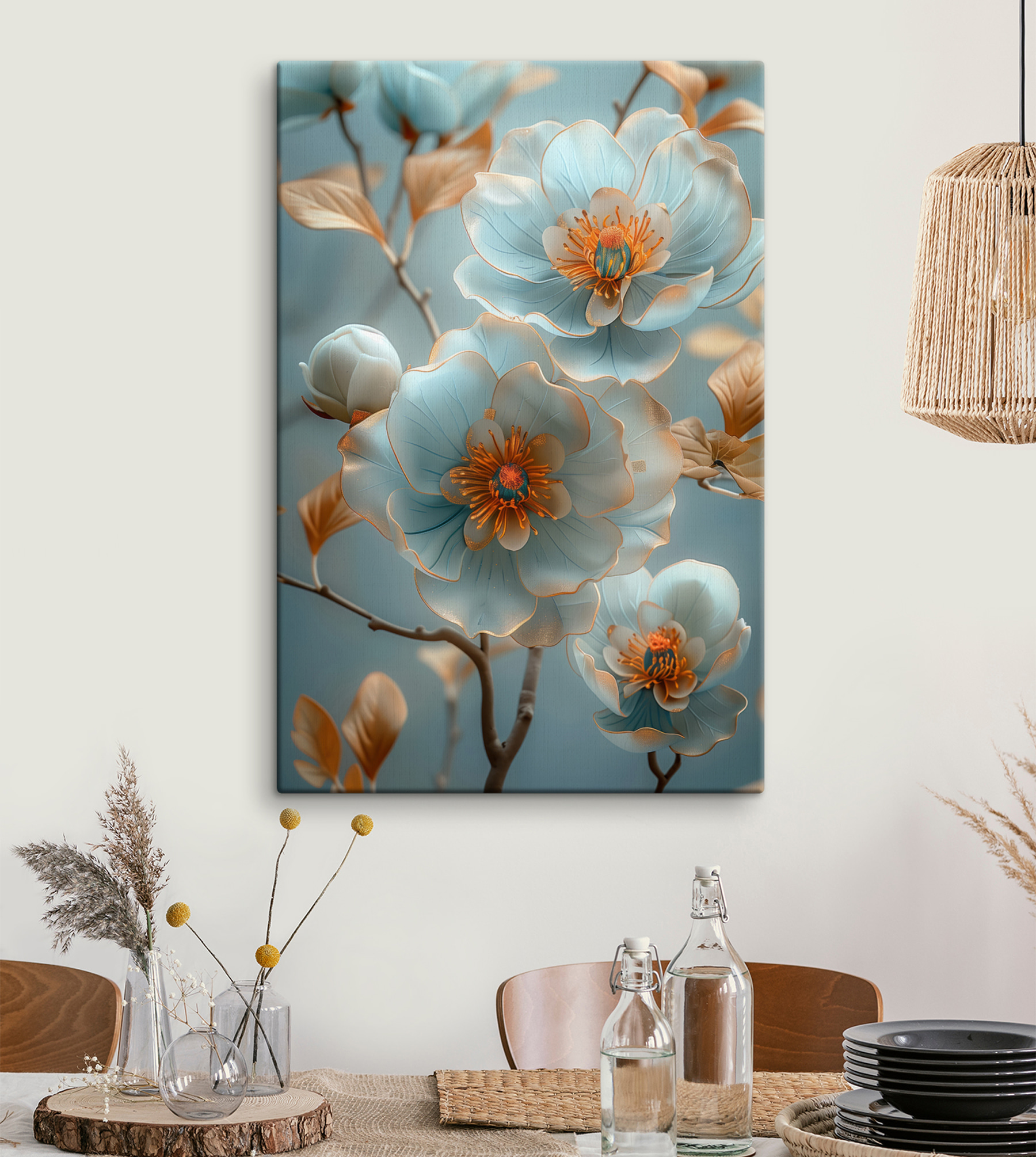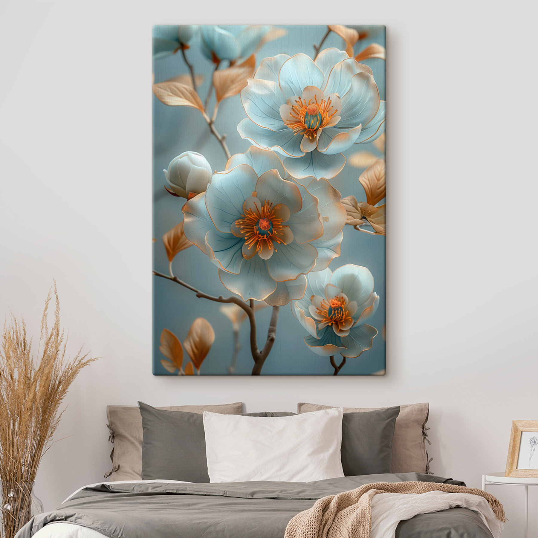 Transformeer elke ruimte met “Etherische bloemen in serene tinten”. Deze canvasprint is als een frisse wind, met delicate bloemenmagie die zowel rustgevend als opbeurend aanvoelt. Stel je voor dat je een kamer binnenstapt waar zachte, rustgevende tinten je omringen, zodat elk bezoek voelt als een mini-vakantie. De weelderige bloemen lijken bijna te wiegen en nodigen uit tot een dagdroom of twee. Perfect voor gezellige hoekjes, uitnodigende gangen of die lege muur die vraagt om een vleugje charme. Stel je die kleine glimlach voor wanneer gasten het opmerken – het is decor met een vleugje eigenzinnigheid!