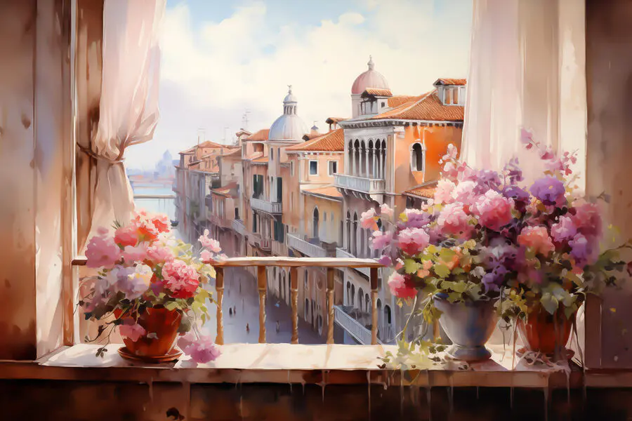 Heb je er ooit van gedroomd om op je balkon een stadsgezicht te zien met charmante daken en kleurrijke bloemen? Dit doek, “Gezicht op een stad vanaf een balkon”, brengt die droom tot leven. Het is alsof je een persoonlijk venster hebt op een wereld waar architectuur en kunst elkaar ontmoeten. Stel je voor dat je ‘s ochtends aan je koffie nipt met dit uitzicht – het is een kleine ontsnapping, rechtstreeks vanuit je woonkamer. Die bloemen fluisteren bijna poëzie, terwijl de stad een zacht deuntje neuriet. Perfect om een vleugje reislust aan je muren toe te voegen of een vleugje dagdromen.