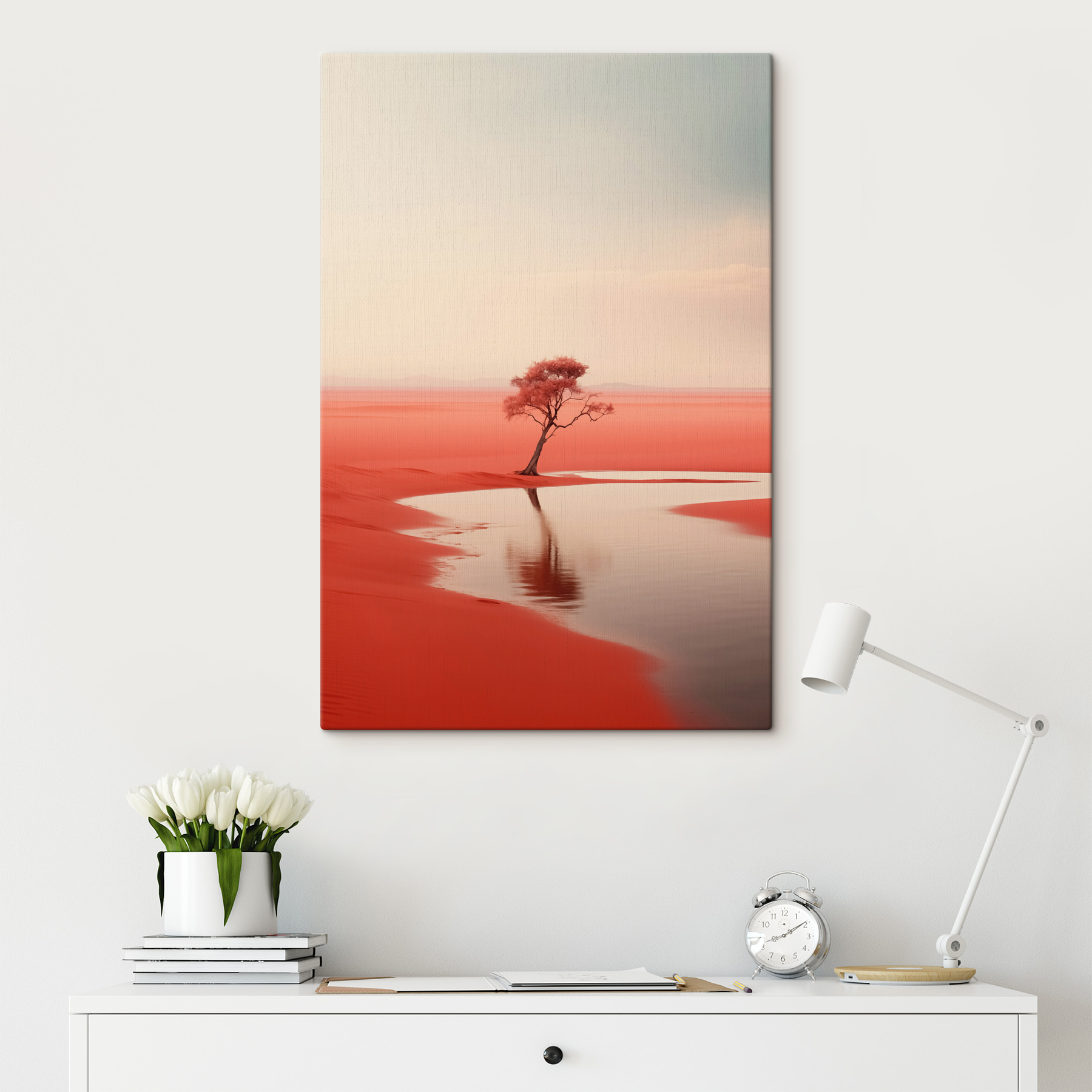 Stel je een uitgestrekte rode woestijn voor, waar een eenzame boom als een eigenzinnige vriend tegen een adembenemende achtergrond staat. Deze canvasprint, “Tree in a Red Desert”, vangt de essentie van eenzaamheid en schoonheid, perfect voor iedereen die een opvallend tintje aan zijn of haar ruimte wil geven. De rijke kleuren springen eruit en fluisteren bijna verhalen van avontuur en rust. Stel je voor dat je een kamer binnenloopt en meteen wordt meegevoerd naar dit serene landschap, waar zorgen vervagen. Het is niet zomaar een decor; het is een dagelijkse herinnering om groot te blijven en uniekheid te omarmen. Een stukje kunst van de natuur dat gesprekken op gang brengt en misschien zelfs dagdromen.