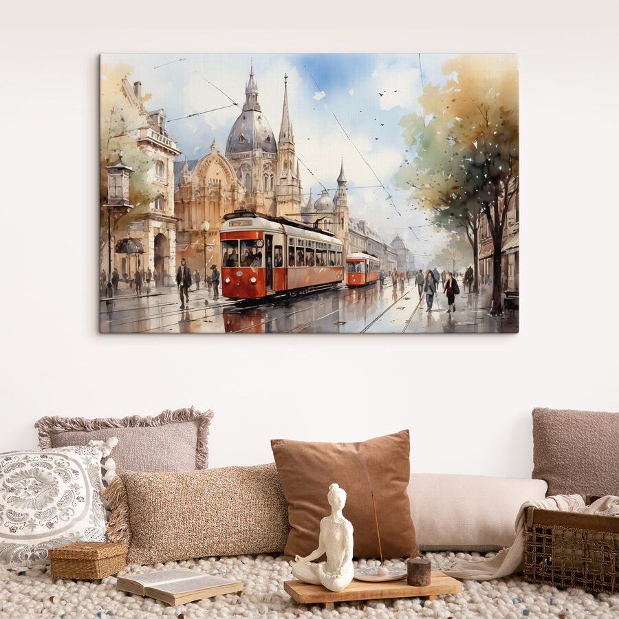 Stap in de charme van bruisende straten met de “Trolley on a Street” canvasprint. Het is net een aquareldroom die tot leven komt, waarin de elegantie van de architectuur van weleer wordt vermengd met de alledaagse sfeer van het stadsleven. Je weet wel, het soort tafereel dat je doet dagdromen over koffie drinken in een klein café terwijl je de wereld voorbij ziet gaan. Dit stuk brengt een vleugje nostalgie in elke hoek, wekt nieuwsgierigheid op en fluistert reisverhalen. Perfect voor iedereen met een zwak voor stedelijke avonturen en artistieke flair!