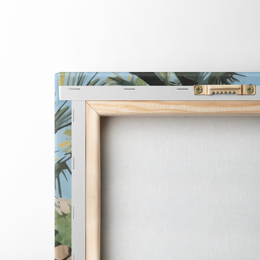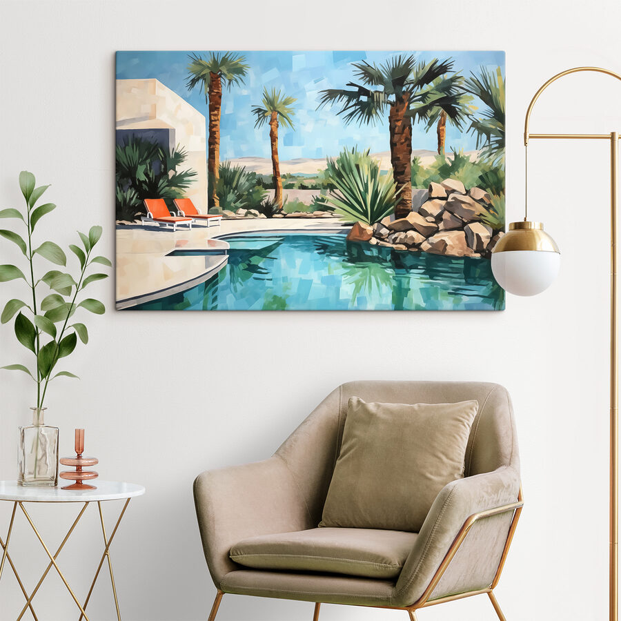 Stel je voor dat je aan het zwembad ligt, palmbomen wiegen in een zacht briesje en de zon speelse schaduwen werpt. Met deze canvasprint haal je die zalige sfeer naar je woonkamer – zonder zonnebrand. Perfect voor iedereen die droomt van tropische ontsnappingen en zonnige avonturen. De scène vangt het vredige gevoel van vakantiedagen, allemaal vanuit het comfort van thuis. Plaats het in je kamer en plotseling voelt je dinsdagmiddag als een strandzondag. En die fel oranje stoelen? Echte showstoppers.