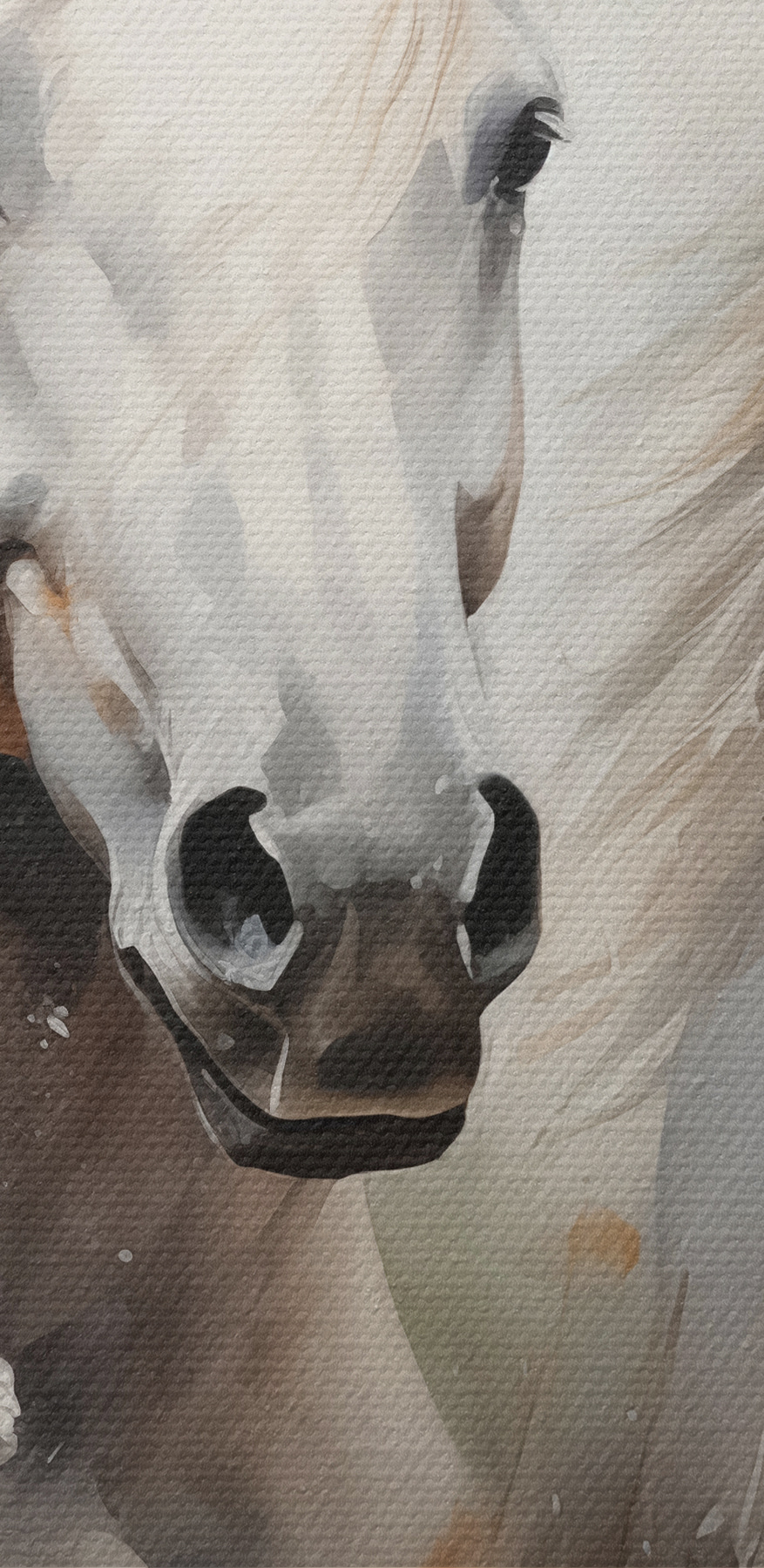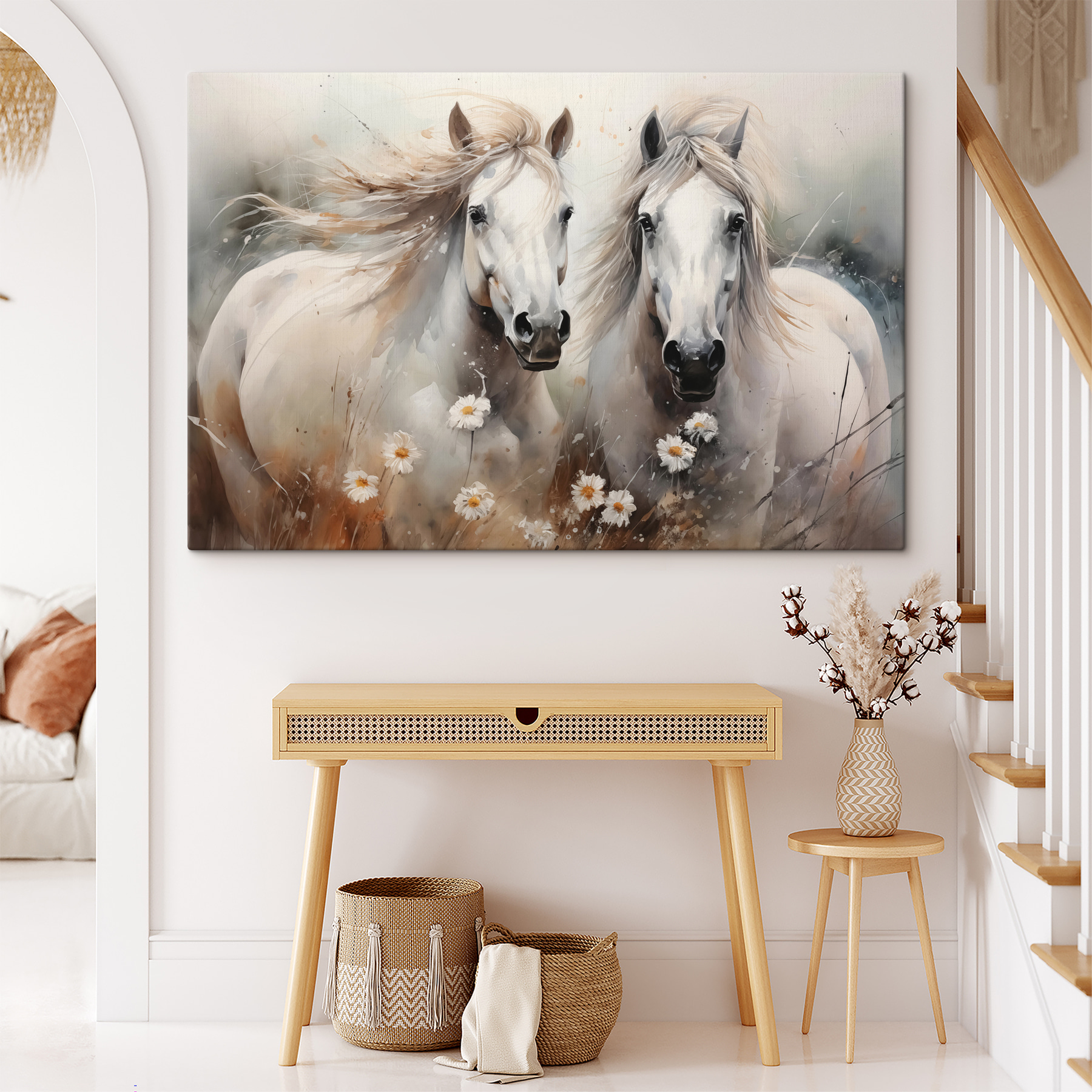 Stel je voor dat je een kamer binnenloopt en begroet wordt door dit verbluffende canvas – twee majestueuze paarden, hun manen wapperend alsof ze door een zacht briesje draven. Maar wacht, er is meer – heldere, delicate bloemen voegen een vleugje charme toe, als confetti van de natuur zelf. Het is alsof ze zeggen: “Hé, het leven is een wilde rit, maar stop en ruik de madeliefjes!”. Perfect om een vleugje drama en eigenzinnigheid toe te voegen, dit kunstwerk vangt beweging, gratie en een vleugje wilde schoonheid. Een zekere gespreksstarter die ziel toevoegt aan elke ruimte.