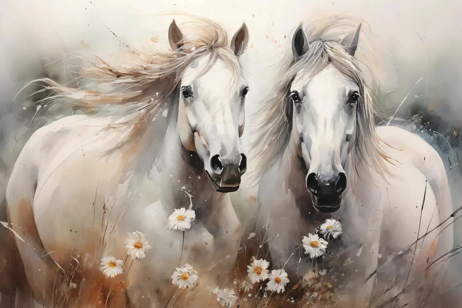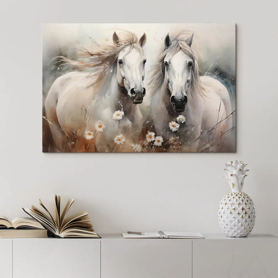 Stel je voor dat je een kamer binnenloopt en begroet wordt door dit verbluffende canvas – twee majestueuze paarden, hun manen wapperend alsof ze door een zacht briesje draven. Maar wacht, er is meer – heldere, delicate bloemen voegen een vleugje charme toe, als confetti van de natuur zelf. Het is alsof ze zeggen: “Hé, het leven is een wilde rit, maar stop en ruik de madeliefjes!”. Perfect om een vleugje drama en eigenzinnigheid toe te voegen, dit kunstwerk vangt beweging, gratie en een vleugje wilde schoonheid. Een zekere gespreksstarter die ziel toevoegt aan elke ruimte.