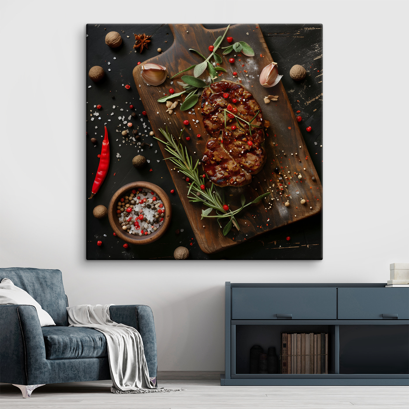 Stel je voor: de gezelligheid van je keuken en de artistieke flair van een galerie. Deze canvasprint, met een sappig stuk vlees versierd met specerijen en kruiden, brengt een vleugje culinair avontuur aan je muren. Het is alsof het bord van een chef-kok midden in de bereiding is vastgelegd – het sissen is bijna hoorbaar! Perfect voor fijnproevers of iedereen die houdt van een vleugje rustieke charme. Hang het op en misschien inspireert het je volgende gastronomische experiment of doet het je in ieder geval verlangen naar een stevige steak. Iemand een heerlijk decor?