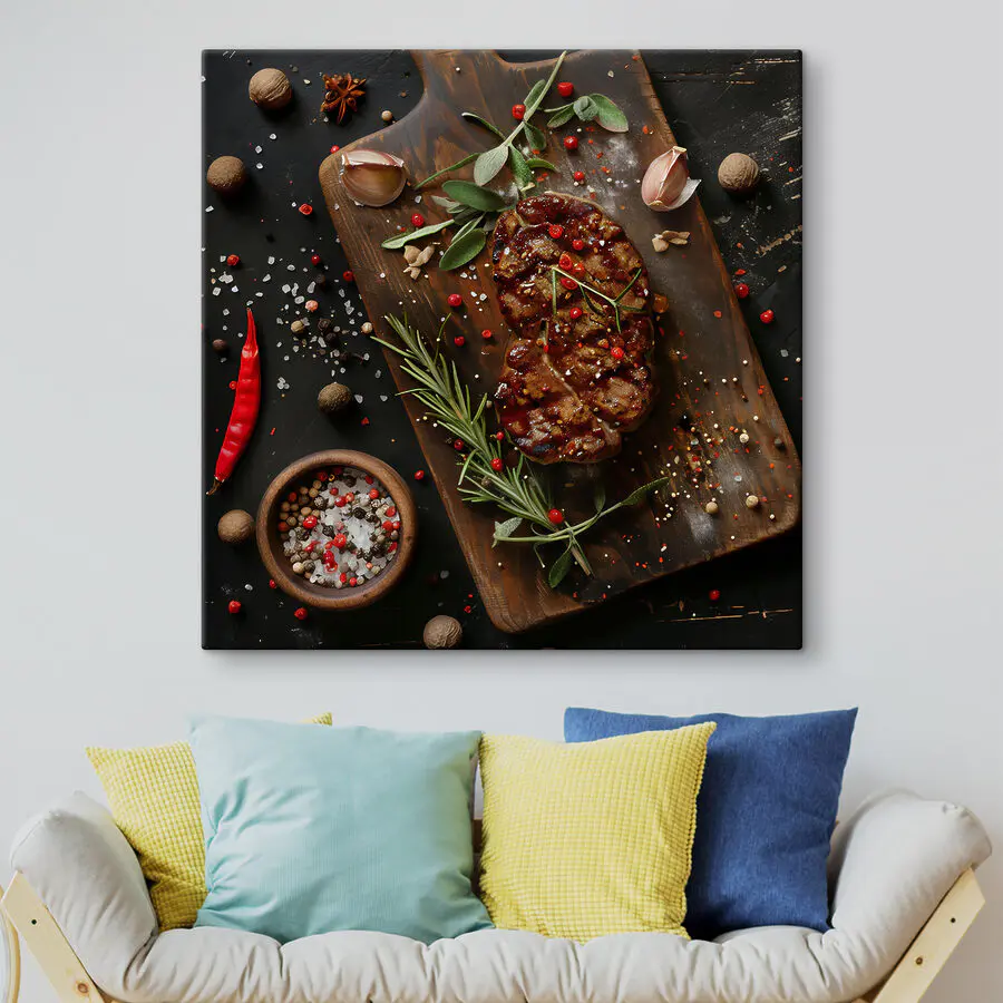 Stel je voor: de gezelligheid van je keuken en de artistieke flair van een galerie. Deze canvasprint, met een sappig stuk vlees versierd met specerijen en kruiden, brengt een vleugje culinair avontuur aan je muren. Het is alsof het bord van een chef-kok midden in de bereiding is vastgelegd – het sissen is bijna hoorbaar! Perfect voor fijnproevers of iedereen die houdt van een vleugje rustieke charme. Hang het op en misschien inspireert het je volgende gastronomische experiment of doet het je in ieder geval verlangen naar een stevige steak. Iemand een heerlijk decor?
