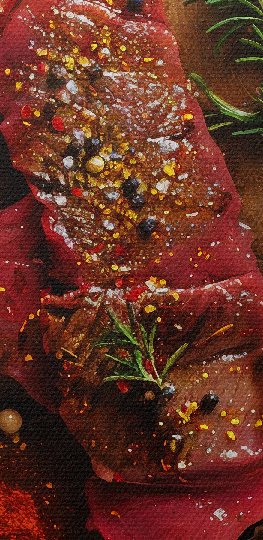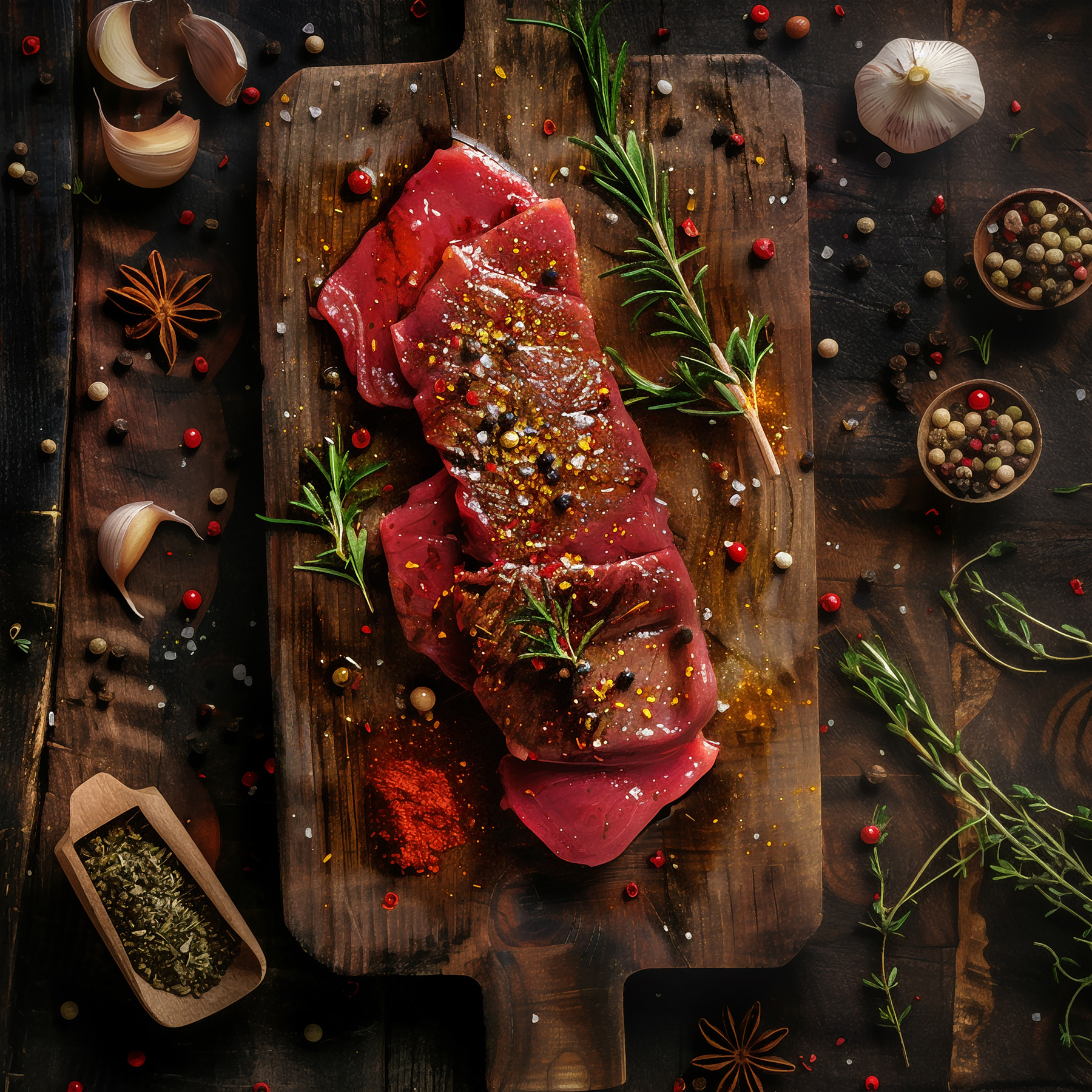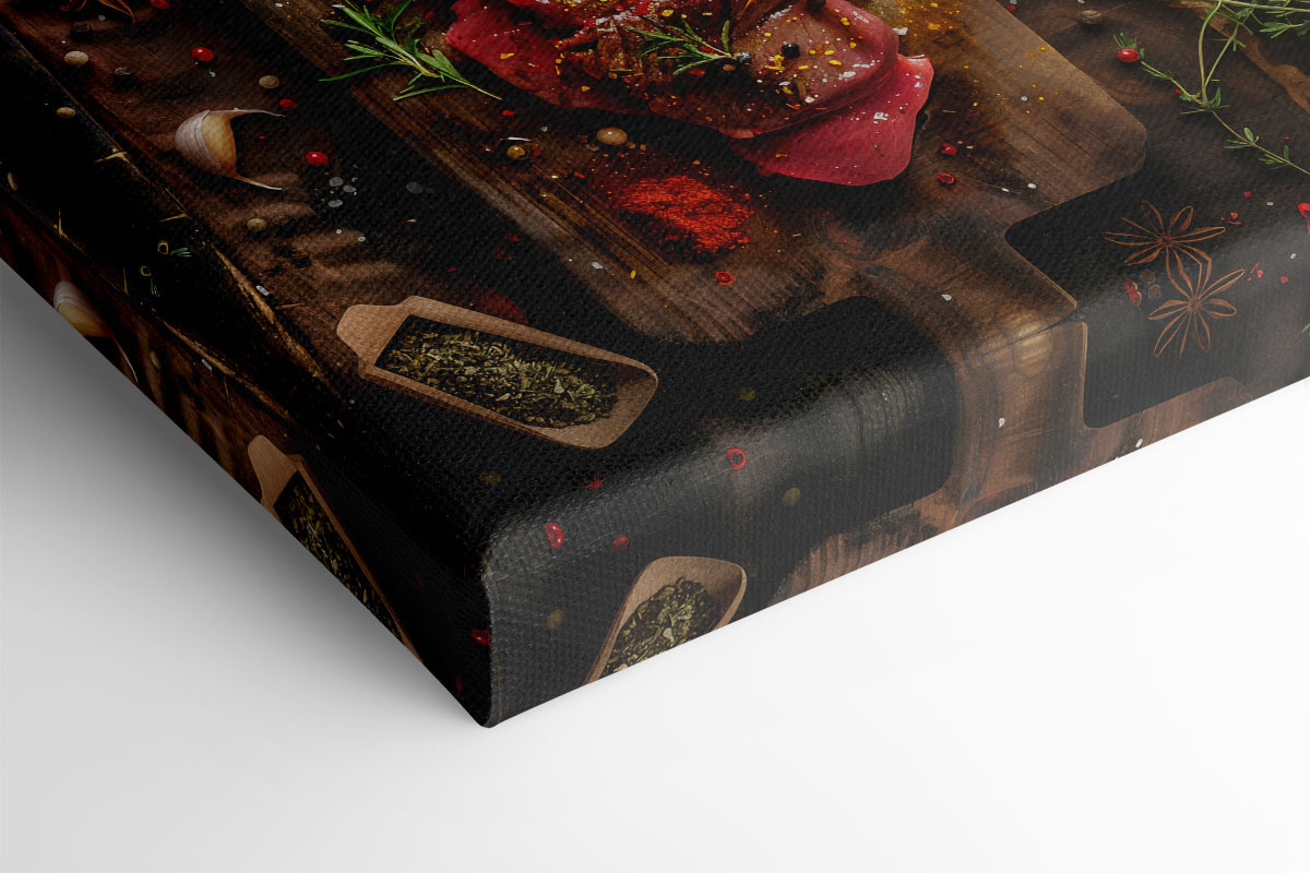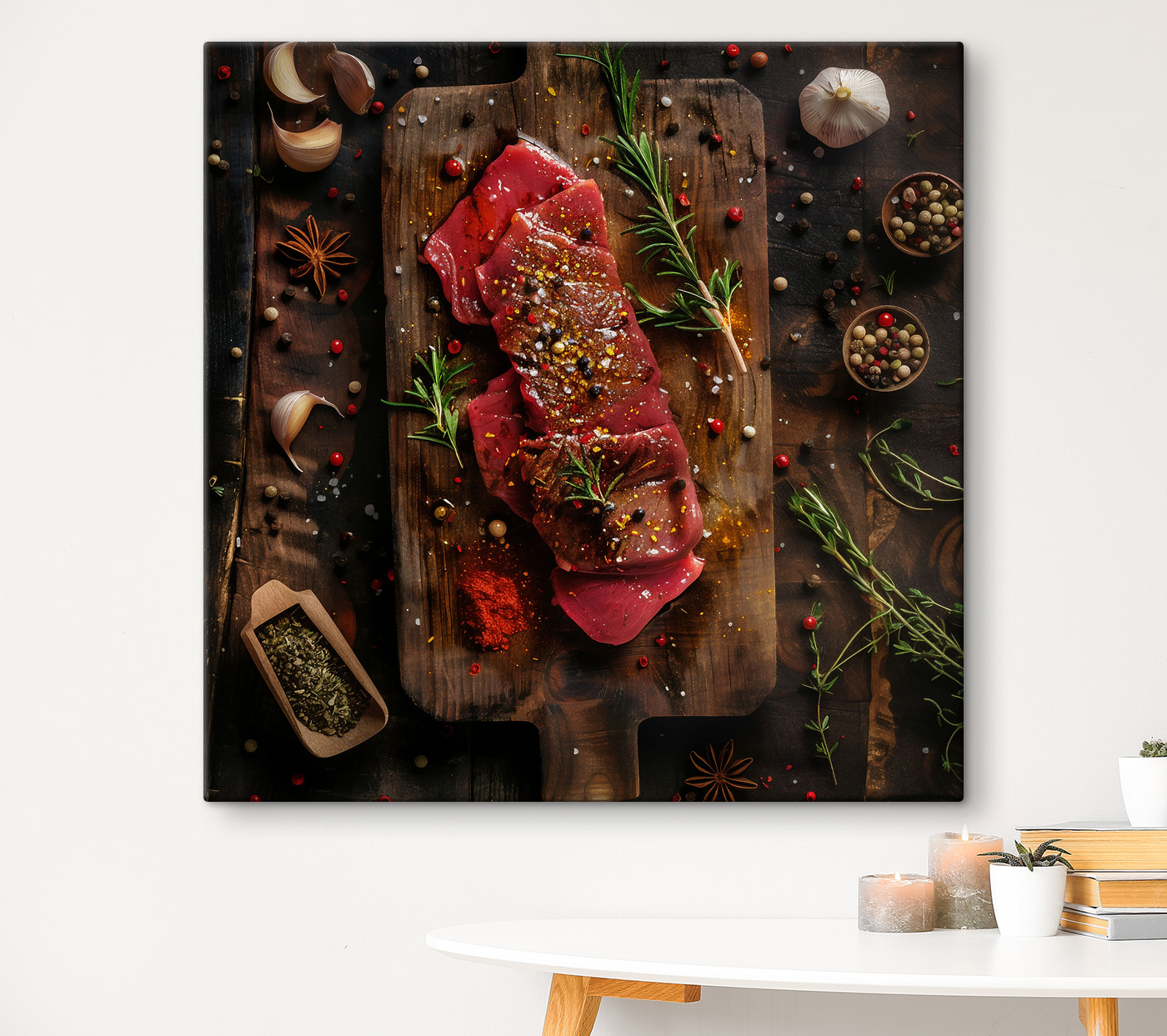 Zie je je keuken wel eens als een galerie met meesterwerken? Kijk dan eens naar deze intrigerende canvasprint “Vlees op een snijplank met kruiden en specerijen”. Het is echt om van te watertanden en straalt warmte en gezelligheid uit. Het soort dat je doet verlangen naar een stevige stoofpot op een regenachtige dag. Perfect voor fijnproevers of iedereen die op zoek is naar een rustieke sfeer. Die kruiden zien eruit alsof ze geheime recepten fluisteren. Hang het op en zie hoe je ruimte verandert. Waarschuwing: Kan spontane kookwoede of hongergevoelens op vreemde uren veroorzaken!