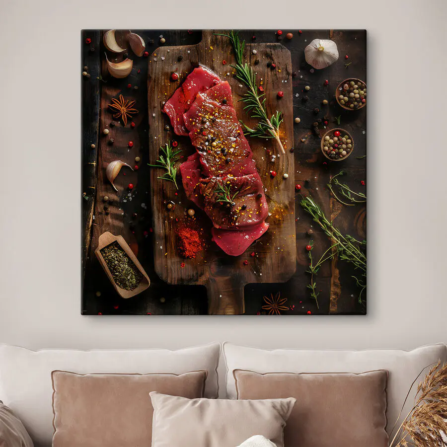 Zie je je keuken wel eens als een galerie met meesterwerken? Kijk dan eens naar deze intrigerende canvasprint “Vlees op een snijplank met kruiden en specerijen”. Het is echt om van te watertanden en straalt warmte en gezelligheid uit. Het soort dat je doet verlangen naar een stevige stoofpot op een regenachtige dag. Perfect voor fijnproevers of iedereen die op zoek is naar een rustieke sfeer. Die kruiden zien eruit alsof ze geheime recepten fluisteren. Hang het op en zie hoe je ruimte verandert. Waarschuwing: Kan spontane kookwoede of hongergevoelens op vreemde uren veroorzaken!