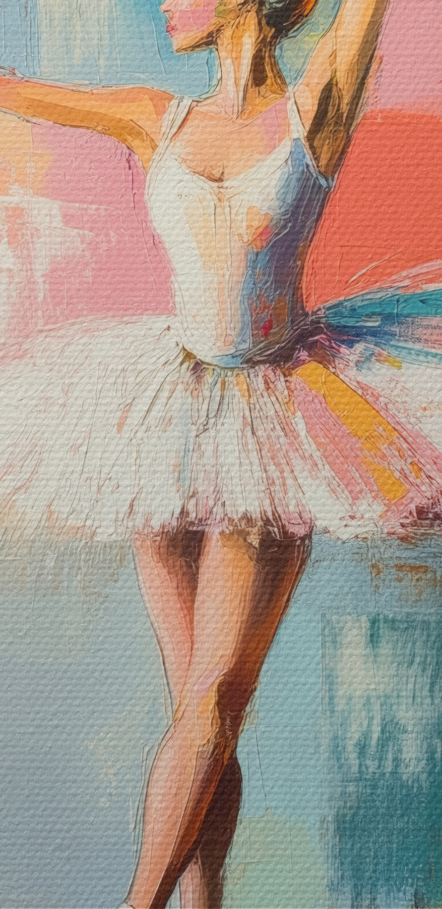 Deze canvasprint danst je woonkamer binnen en toont een ballerina die zo van de muur lijkt te springen. Stel je de kleurenpracht voor – zachte pastels die zich mengen alsof ze naar het beste feestje zijn geweest. Haar tutu wervelt met de gratie van een lentebriesje! Het is een beetje abstract, een beetje beeldende kunst en heel veel elegantie. Stel je voor dat je aan je ochtendkoffie nipt of na een lange dag tot rust komt en dit levendige tafereel je eraan herinnert om een beetje te dansen in je eigen leven. Perfect voor wie houdt van een vleugje eigenzinnigheid in zijn kunst!