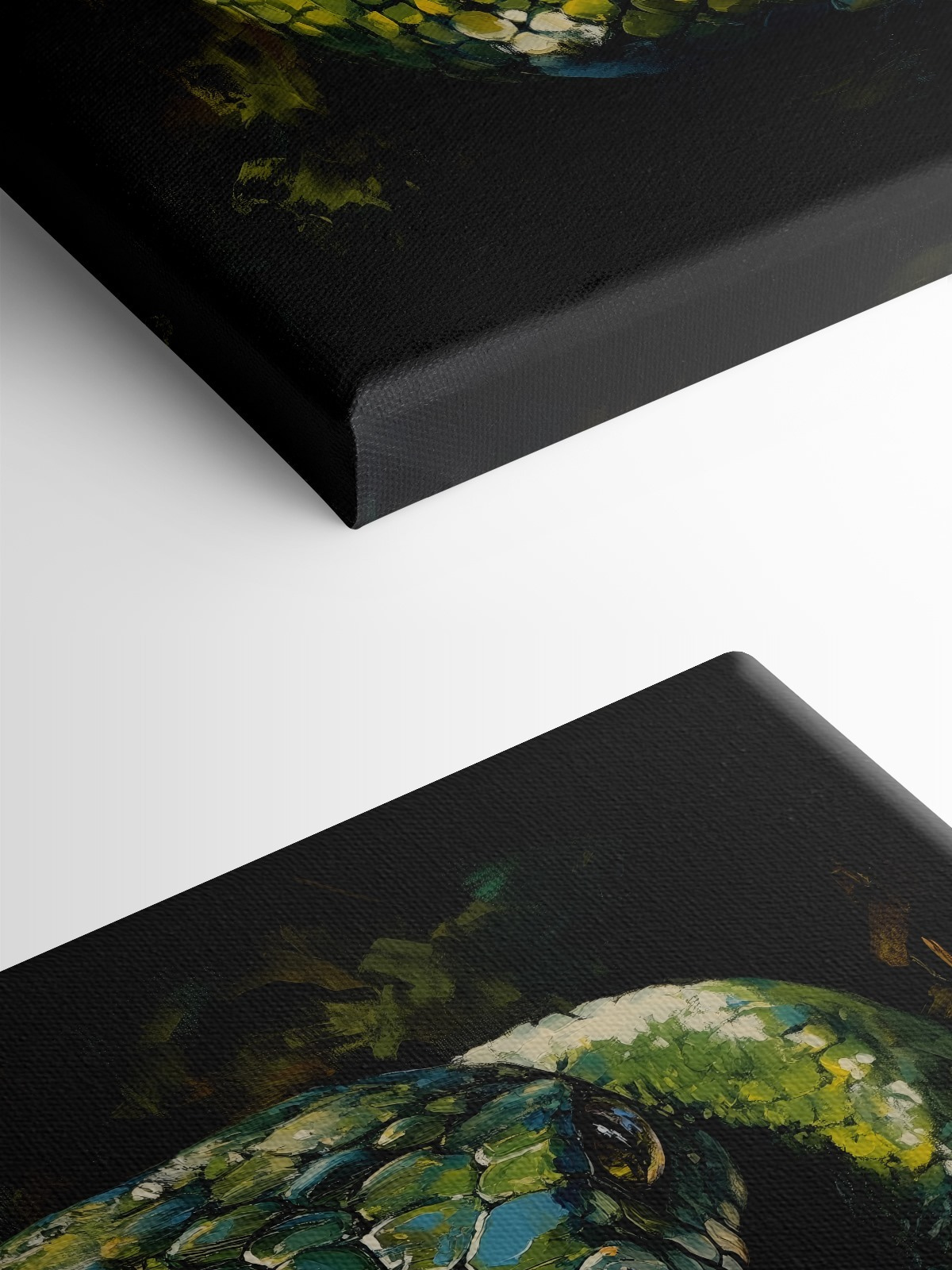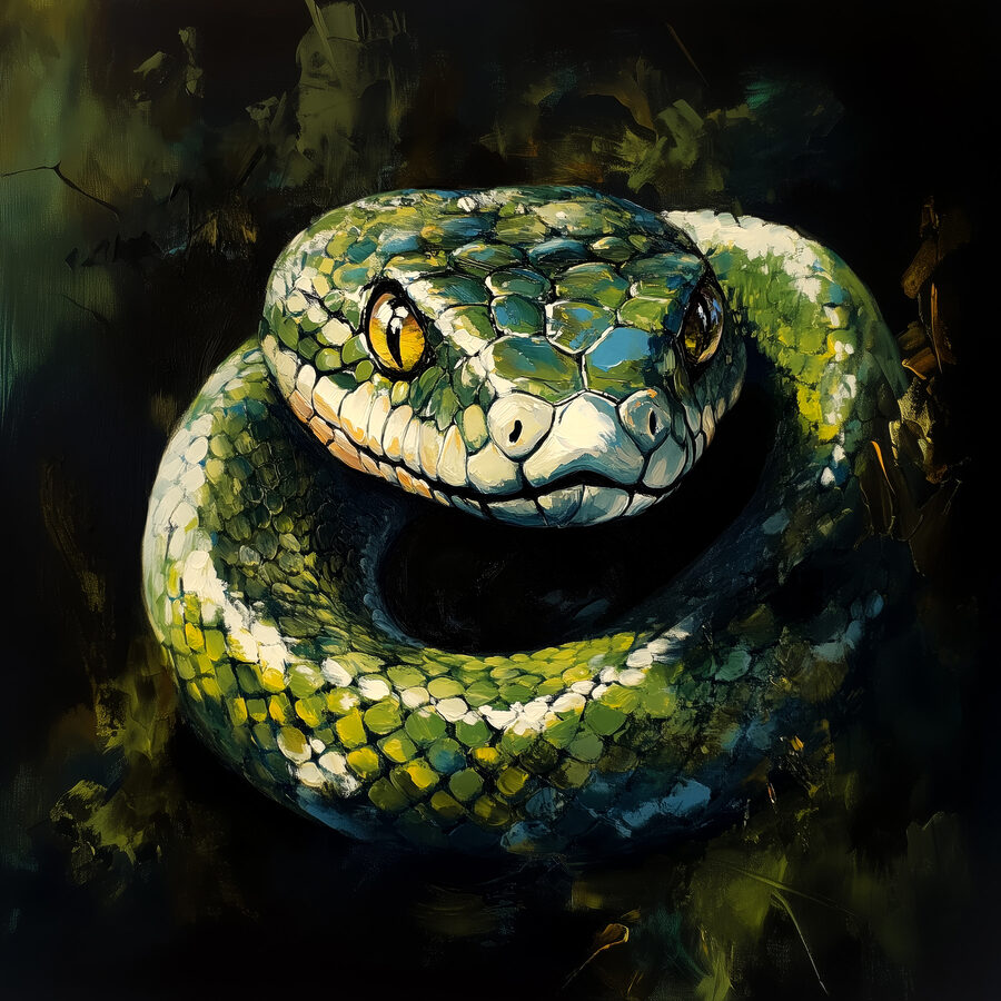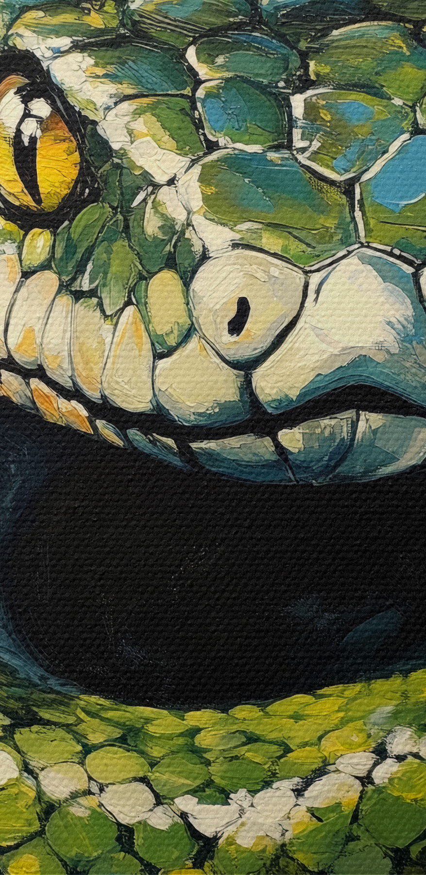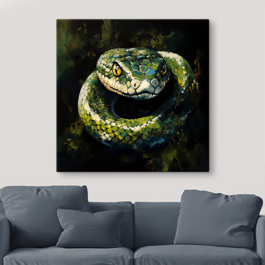 Maak kennis met je nieuwe favoriete kunstwerk aan de muur: “Groene slang met gele ogen. Deze canvasprint kan de conversatiestarter zijn waarvan je niet wist dat je hem nodig had. Die doordringende ogen volgen je bijna door de kamer, toch? Het is alsof de slang geheimen uit de jungle fluistert terwijl je aan je ochtendkoffie nipt. Perfect voor dierenliefhebbers of mensen die gewoon een beetje ongetemde wildheid in hun woonkamer willen. Stel je deze gedurfde schoonheid voor boven je bank en voeg een vleugje intrige toe – wild, mysterieus en betoverend.
