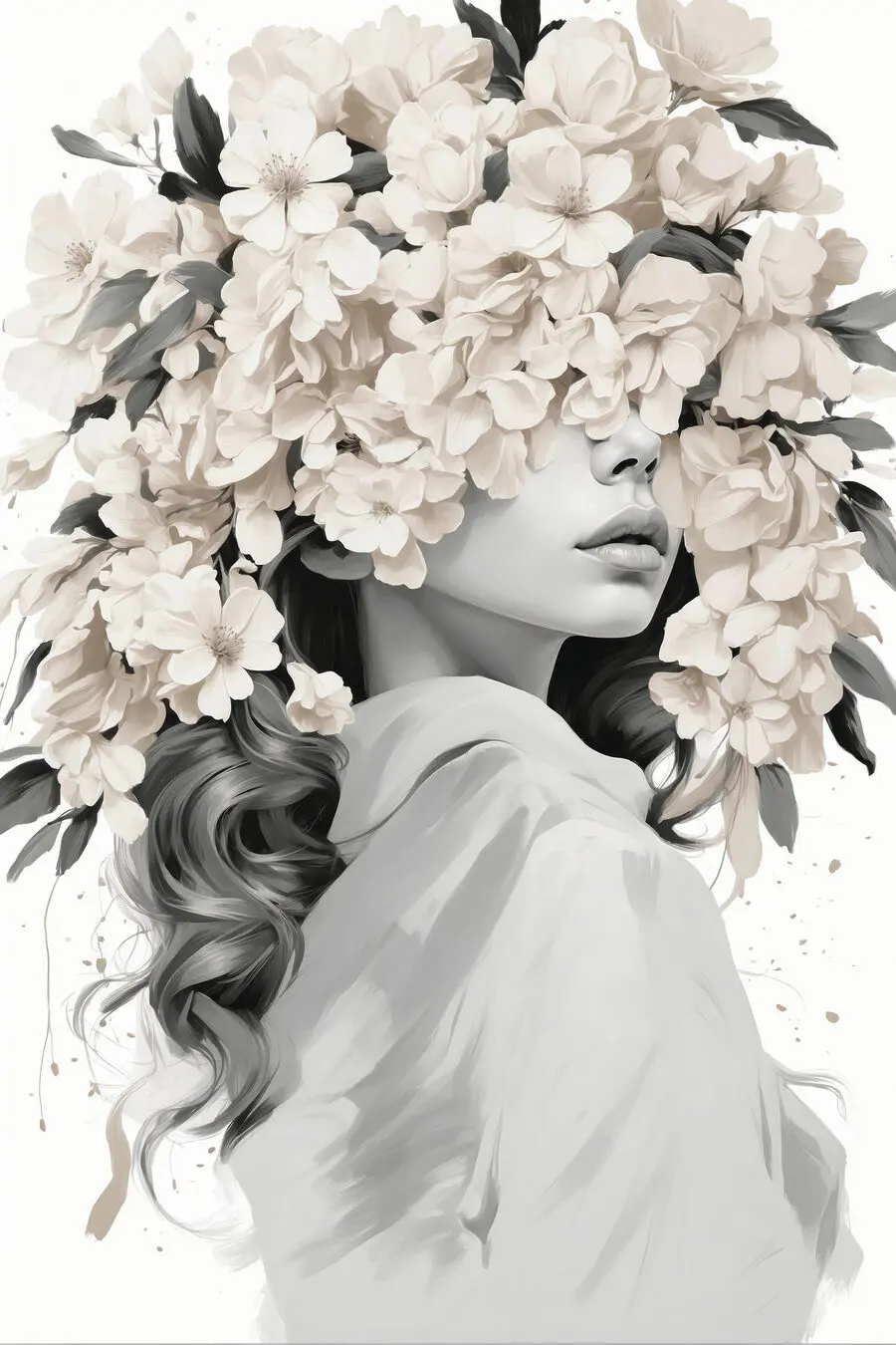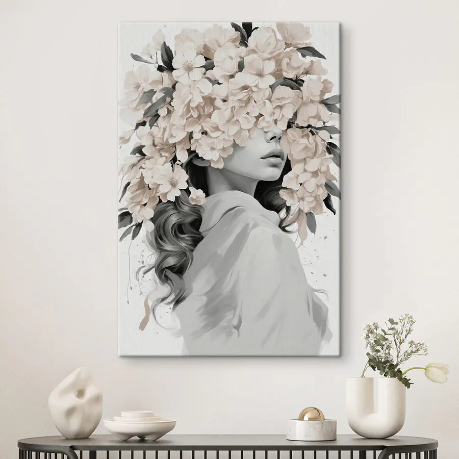 Stel je voor dat je een kamer binnenloopt en begroet wordt door dit prachtige canvas kunstwerk. Een vrouw versierd met een boeket bloemen, haar schoonheid zachtjes vermengend met de delicate bloemen. Het trekt je naar binnen en doet denken aan lentedagen en een zacht briesje. Perfect voor een gezellig hoekje of die lege muur die smeekt om een vleugje charme, dit stuk heeft een manier om elegantie te suggereren terwijl het moeiteloos koel blijft. Vrienden zullen stoppen en het bewonderen, misschien zelfs een beetje dagdromen. Het is net een gesprek met kunst – een mooi, bloemrijk gesprek dat de sfeer opfleurt en elke ruimte een beetje levendiger maakt. Een echte showstopper!