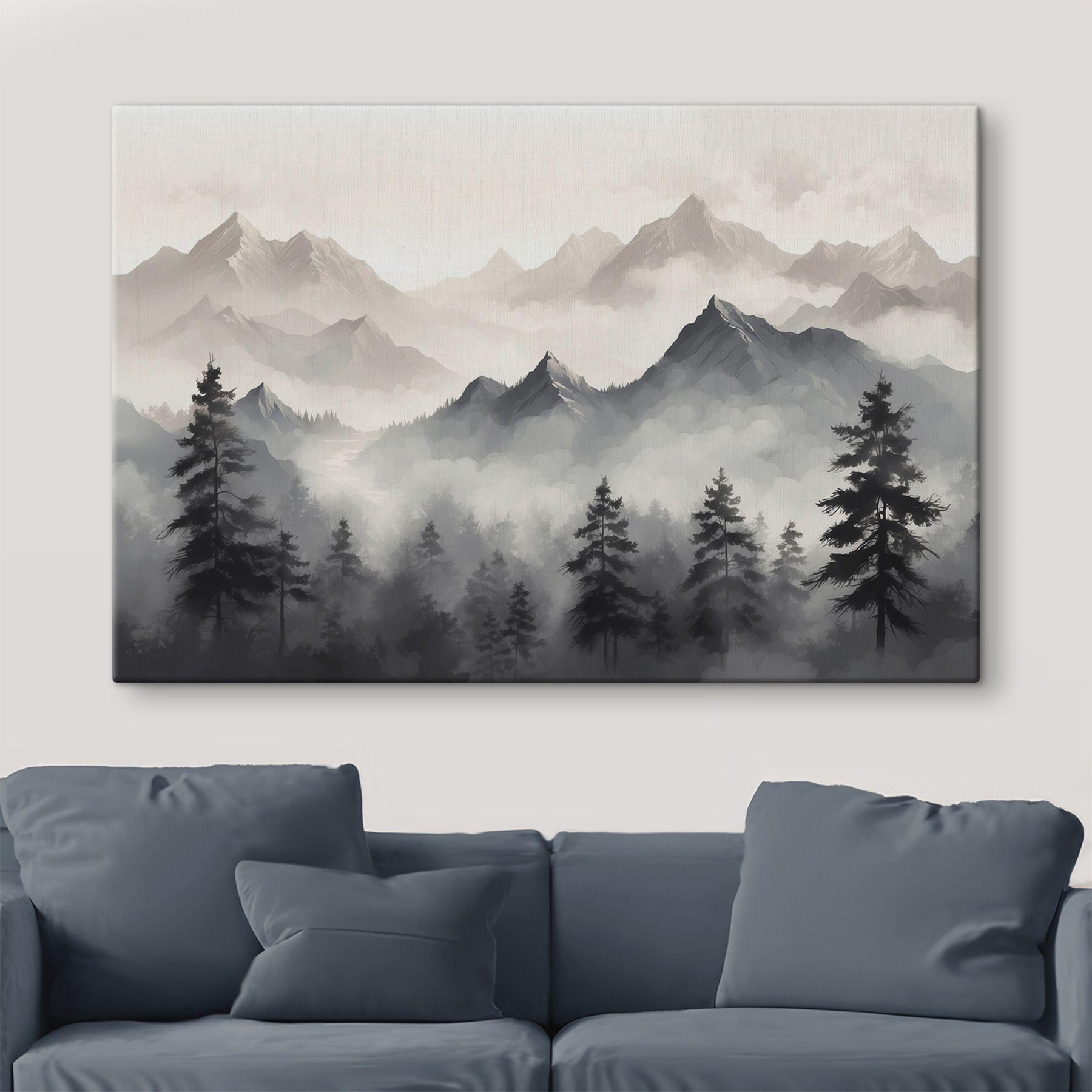 Heb je wel eens het gevoel dat je muren een vleugje rust kunnen gebruiken? Stel je voor dat je wakker wordt met dit prachtige canvas – vredige bergen gehuld in mist, met bomen die naar de hemel reiken. Het is als een frisse wind in je woonkamer. Deze print fluistert de geheimen van de natuur en nodigt uit tot een serene sfeer in elke ruimte. Perfect om bij weg te dromen of gewoon koffie te drinken op een luie zondag. Het herinnert je eraan dat schoonheid in de eenvoudigste landschappen te vinden is. Bovendien vergeet hij nooit een beetje rust te brengen.