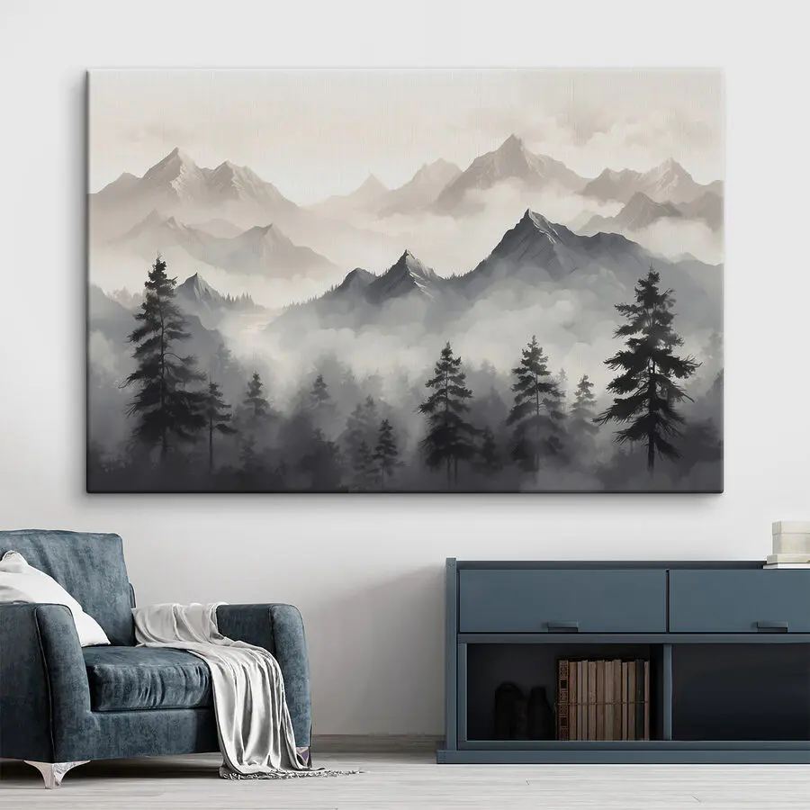 Heb je wel eens het gevoel dat je muren een vleugje rust kunnen gebruiken? Stel je voor dat je wakker wordt met dit prachtige canvas – vredige bergen gehuld in mist, met bomen die naar de hemel reiken. Het is als een frisse wind in je woonkamer. Deze print fluistert de geheimen van de natuur en nodigt uit tot een serene sfeer in elke ruimte. Perfect om bij weg te dromen of gewoon koffie te drinken op een luie zondag. Het herinnert je eraan dat schoonheid in de eenvoudigste landschappen te vinden is. Bovendien vergeet hij nooit een beetje rust te brengen.