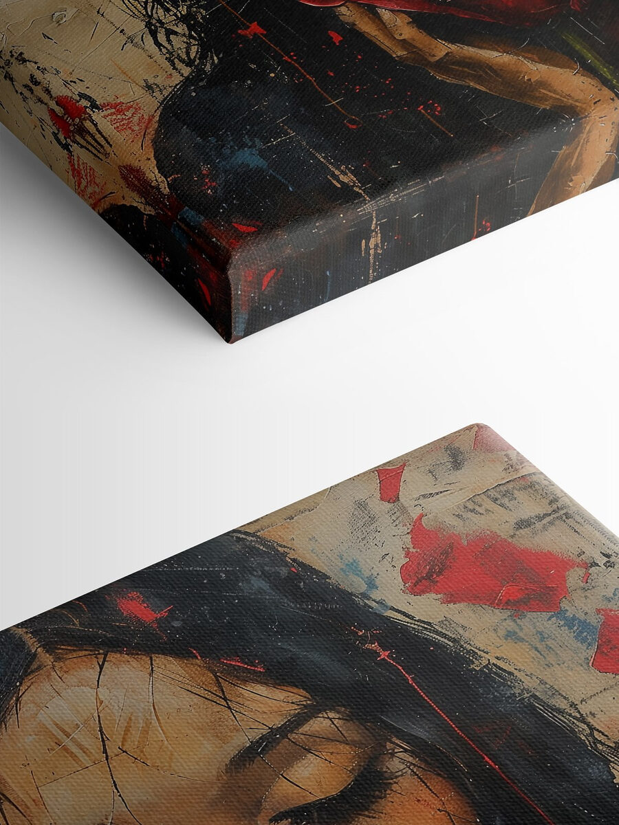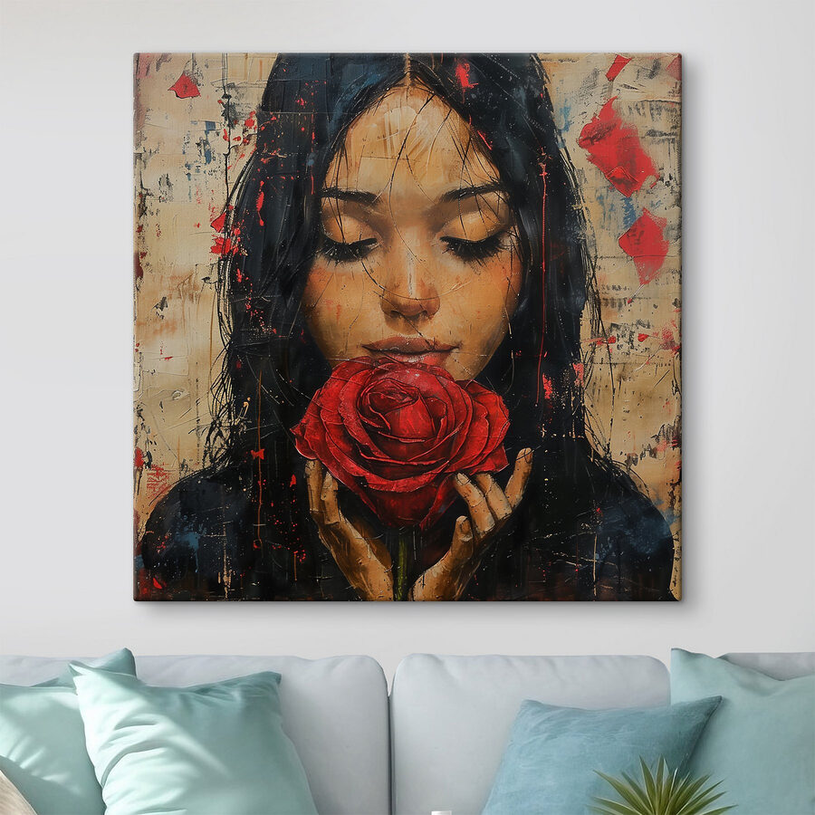 Hier is een doek dat bijna elegantie uitstraalt. Het is een schilderij van een vrouw die liefdevol een rode roos vasthoudt. Stel je dit eens voor in je woonkamer: je vrienden zouden wel eens midden in een zin kunnen stoppen, betoverd door de allure. De manier waarop het dieprode van de roos eruit springt, het is alsof de bloem zo van het doek af bloeit. Perfect voor iedereen die houdt van kunst die een verhaal vertelt en het mysterie van mensen combineert met de tijdloze schoonheid van bloemen. Telkens als je er naar kijkt, kun je er heerlijk bij wegdromen en word je meegezogen in de stille, bloemige wereld.