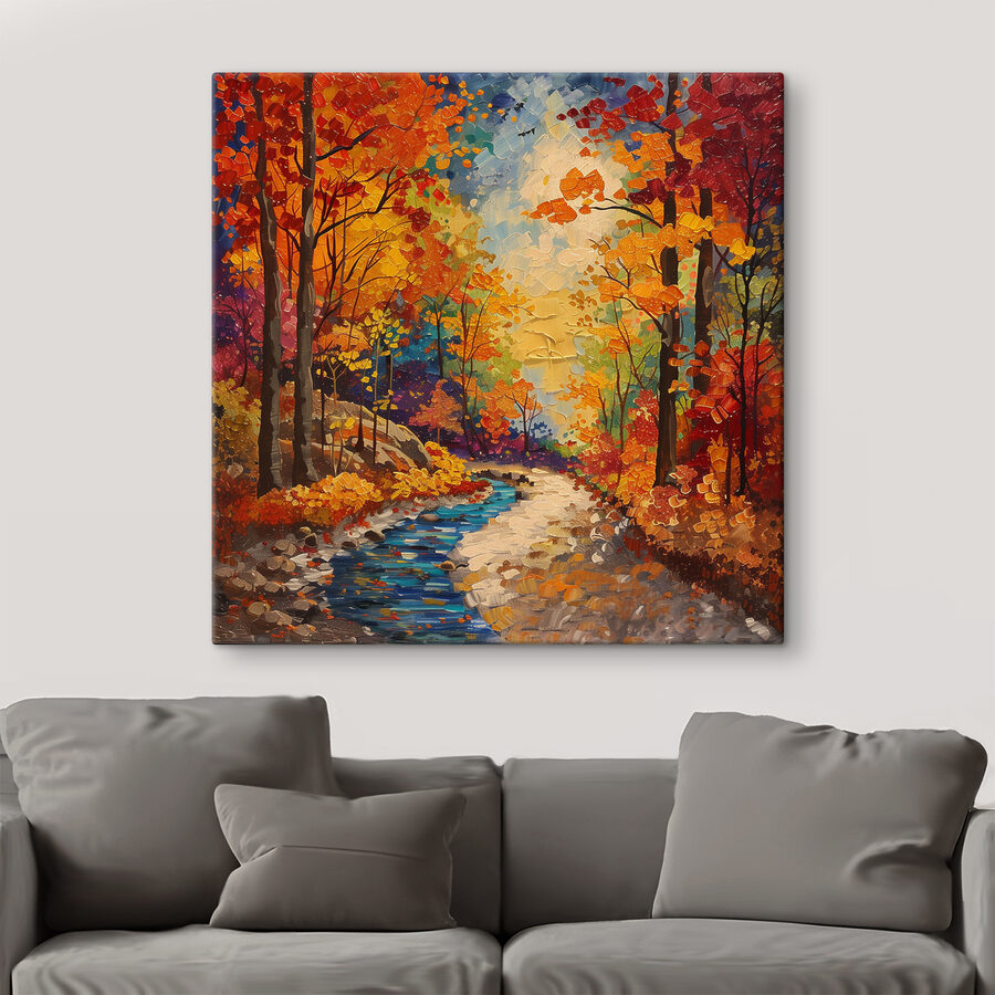 Deze betoverende canvasprint toont een rivier die door een levendig bos kronkelt – een moment waarop de natuur haar eigen meesterwerk schildert. Stel je dit eens voor aan je muur: een kleurenpracht die elke kamer opvrolijkt. Het is als een persoonlijk uitje, zonder de bank te verlaten. Perfect voor mensen die rust vinden in bomen en water – het is als een vredige wandeling in het park, zonder de muggen. Ideaal om een vleugje charme van de natuur aan je huis toe te voegen, en misschien een beetje afgunst van je gasten.