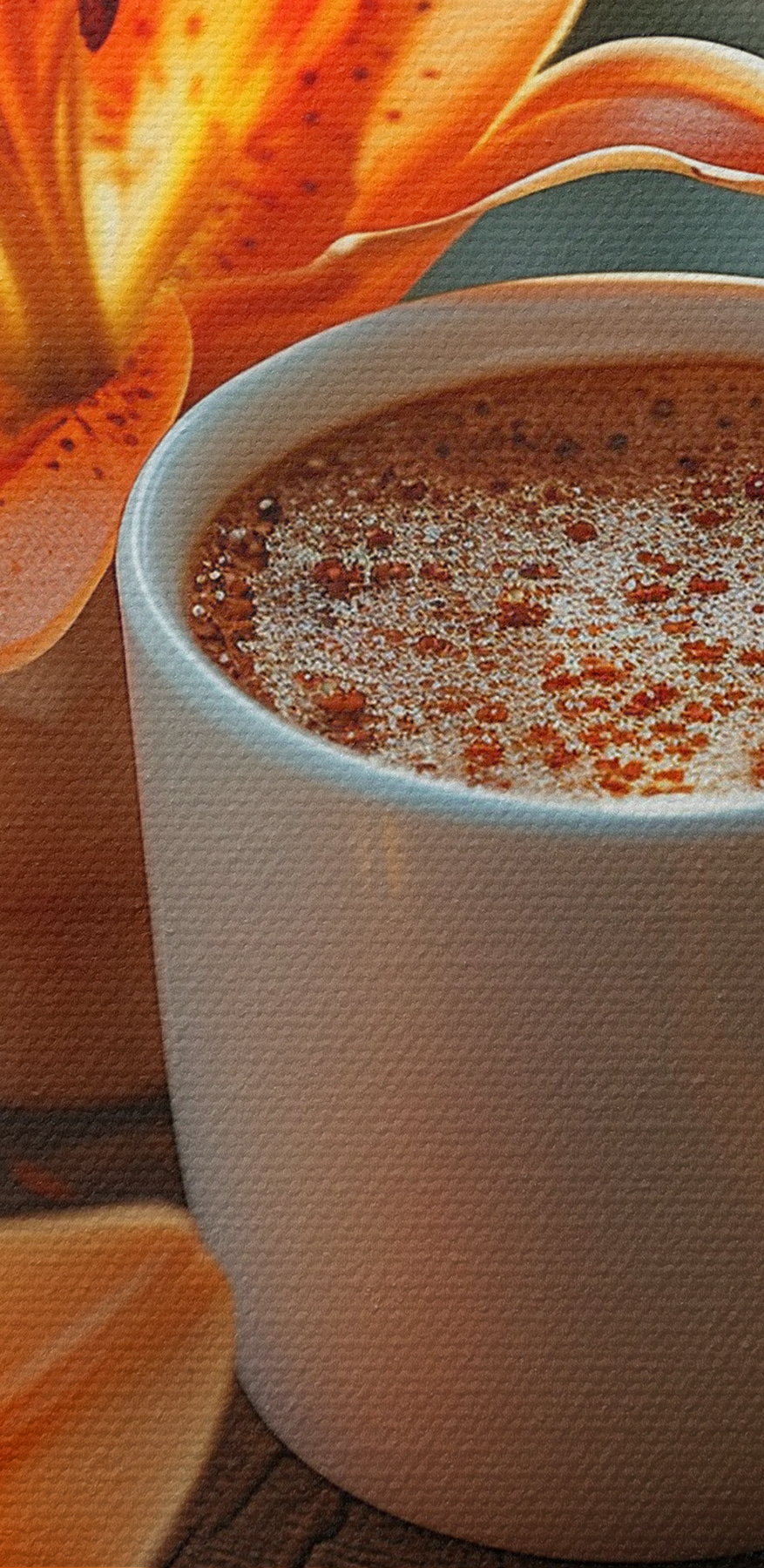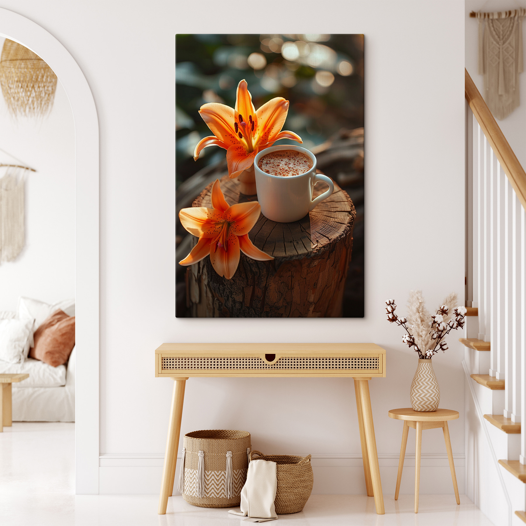 Stel je voor dat je een knus hoekje in je huis vindt waar de tijd even… pauzeert. Deze canvasprint, “Kopje koffie en oranje bloemen”, legt dat moment perfect vast. Het is als een ochtendknuffel, gehuld in de warmte van een kopje koffie en levendige bloemen. De sinaasappels barsten uit met een vriendelijk hallo, terwijl de dampende koffie zegt: “Relax, je kunt het!”. Het kan een herinnering zijn om te vertragen, te genieten van een moment en de eenvoudige geschenken van de natuur je dag te laten kleuren. Een heerlijke toevoeging aan elke ruimte die een vleugje leven en een vleugje rust nodig heeft. Perfect voor dagdromers en koffieliefhebbers!