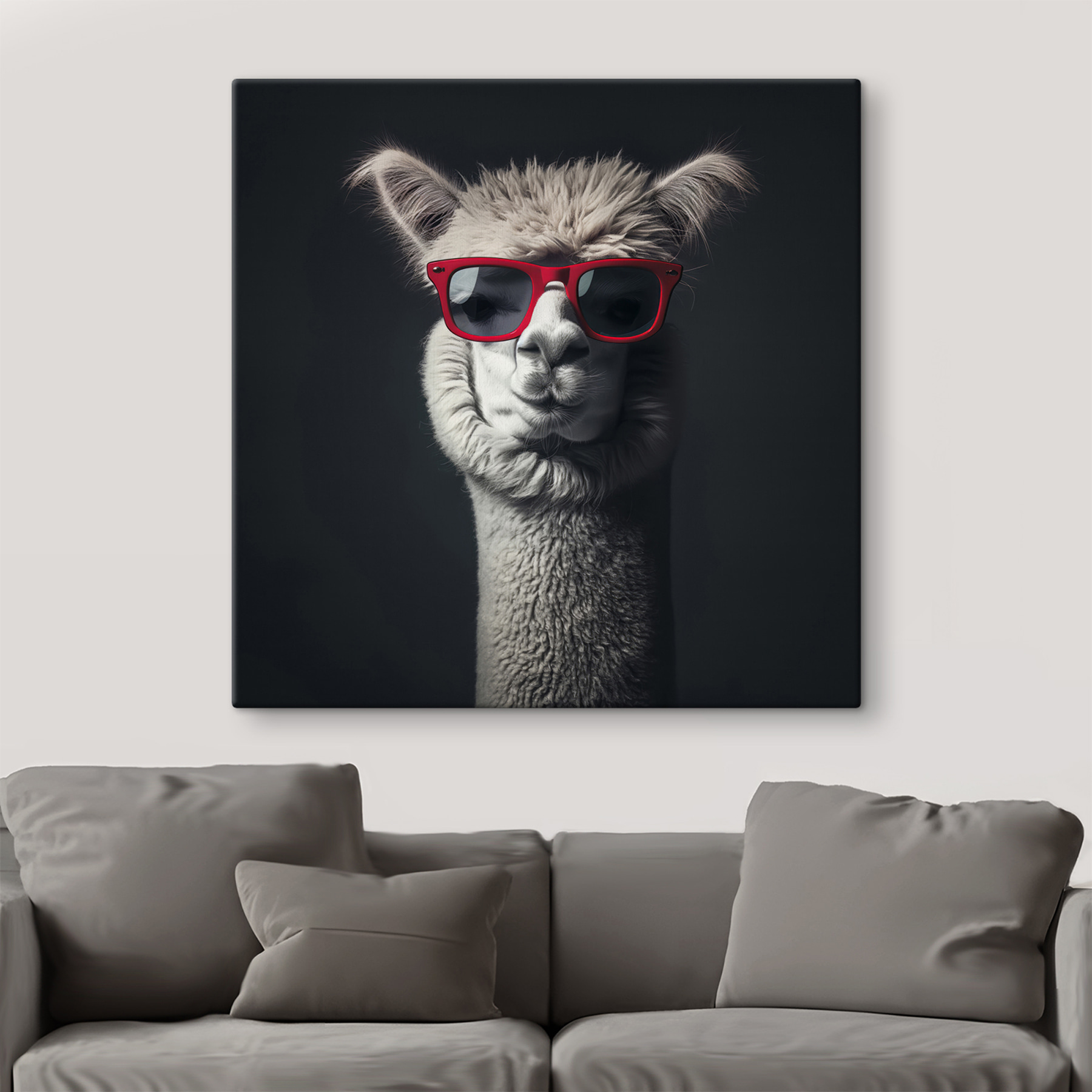 Maak kennis met je nieuwe favoriete gespreksonderwerp: een coole lama met een rode zonnebril. Het is de perfecte mix van zwart-witte charme met een vleugje plezier. Stel je voor dat deze brutale lama in je woonkamer hangt en een beetje eigenzinnigheid en mysterie toevoegt. De minimalistische vibe houdt het stijlvol, terwijl de zonnebril? Puur charisma. Alsof je een stijlvol maatje hebt dat te cool is voor school, maar er stiekem van houdt om je te laten glimlachen. Perfect voor dierenliefhebbers en iedereen die van een beetje humor in zijn inrichting houdt. Wie wist dat lama’s zo’n goede smaak hadden?
