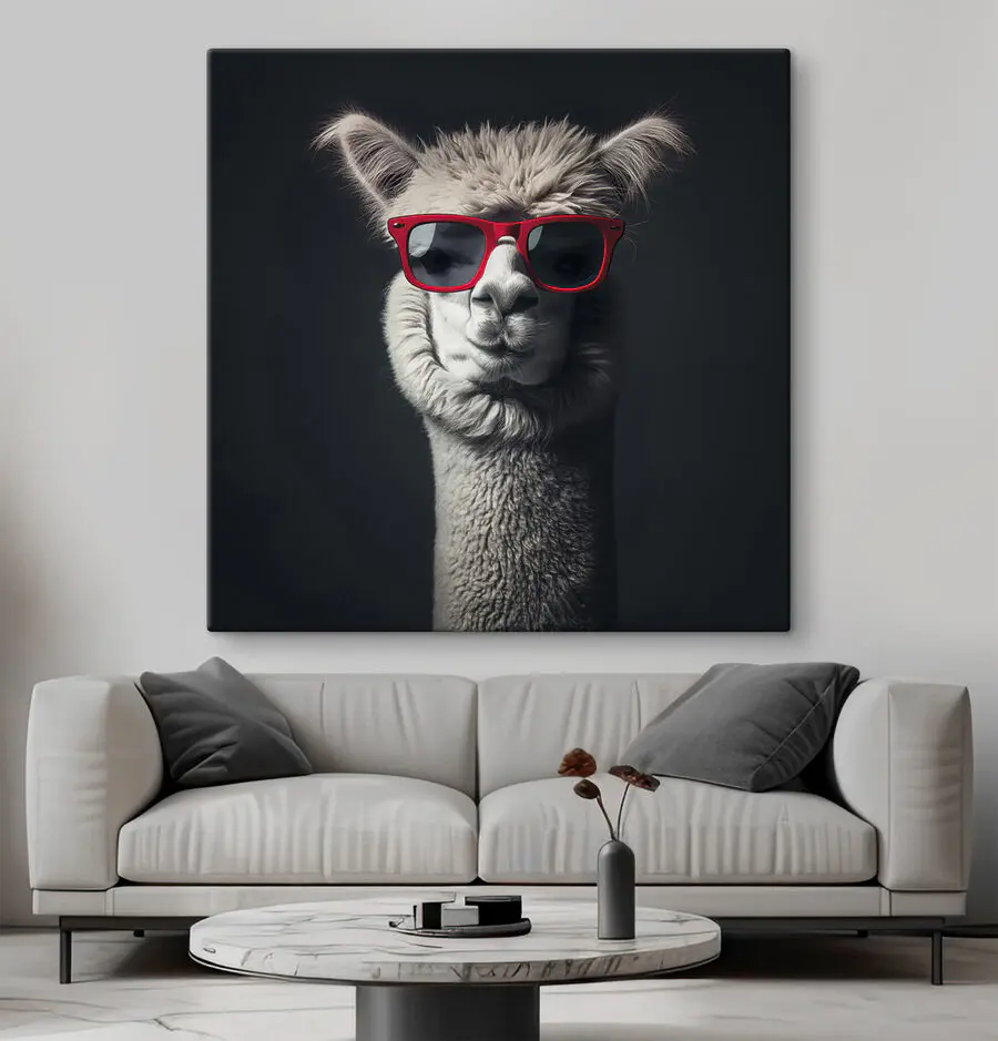 Maak kennis met je nieuwe favoriete gespreksonderwerp: een coole lama met een rode zonnebril. Het is de perfecte mix van zwart-witte charme met een vleugje plezier. Stel je voor dat deze brutale lama in je woonkamer hangt en een beetje eigenzinnigheid en mysterie toevoegt. De minimalistische vibe houdt het stijlvol, terwijl de zonnebril? Puur charisma. Alsof je een stijlvol maatje hebt dat te cool is voor school, maar er stiekem van houdt om je te laten glimlachen. Perfect voor dierenliefhebbers en iedereen die van een beetje humor in zijn inrichting houdt. Wie wist dat lama’s zo’n goede smaak hadden?
