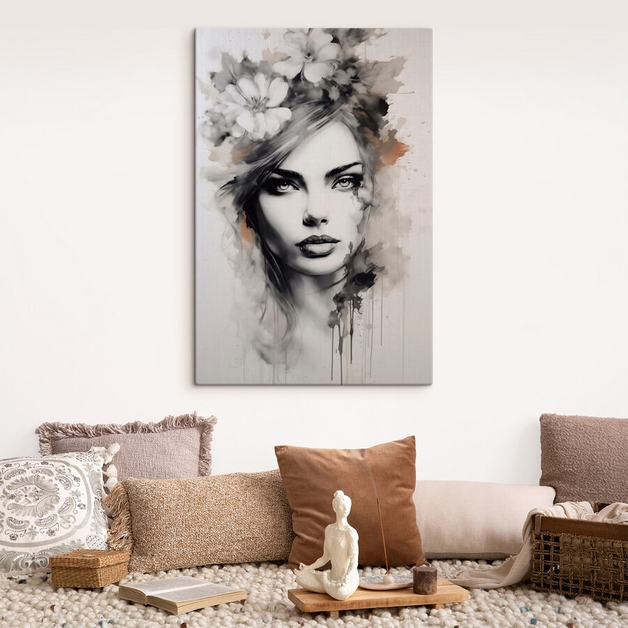 Stel je voor: een opvallend stuk dat elegantie uitstraalt met een vleugje mysterie. Maak kennis met het doek van een vrouw gekroond met bloesems, allemaal in zachte zwart-wit tinten. Het is alsof ze je recht aankijkt en je meeneemt in haar kalme maar intrigerende wereld. Perfect voor liefhebbers van verhalen en emoties die in kunst zijn verweven. Zie het al voor je aan de muur, misschien om dat gezellige leeshoekje op te fleuren of om charme toe te voegen aan je woonkamer. Het is een gespreksstarter, een sfeermaker. Absoluut tijdloos, met een vleugje eigenzinnigheid.