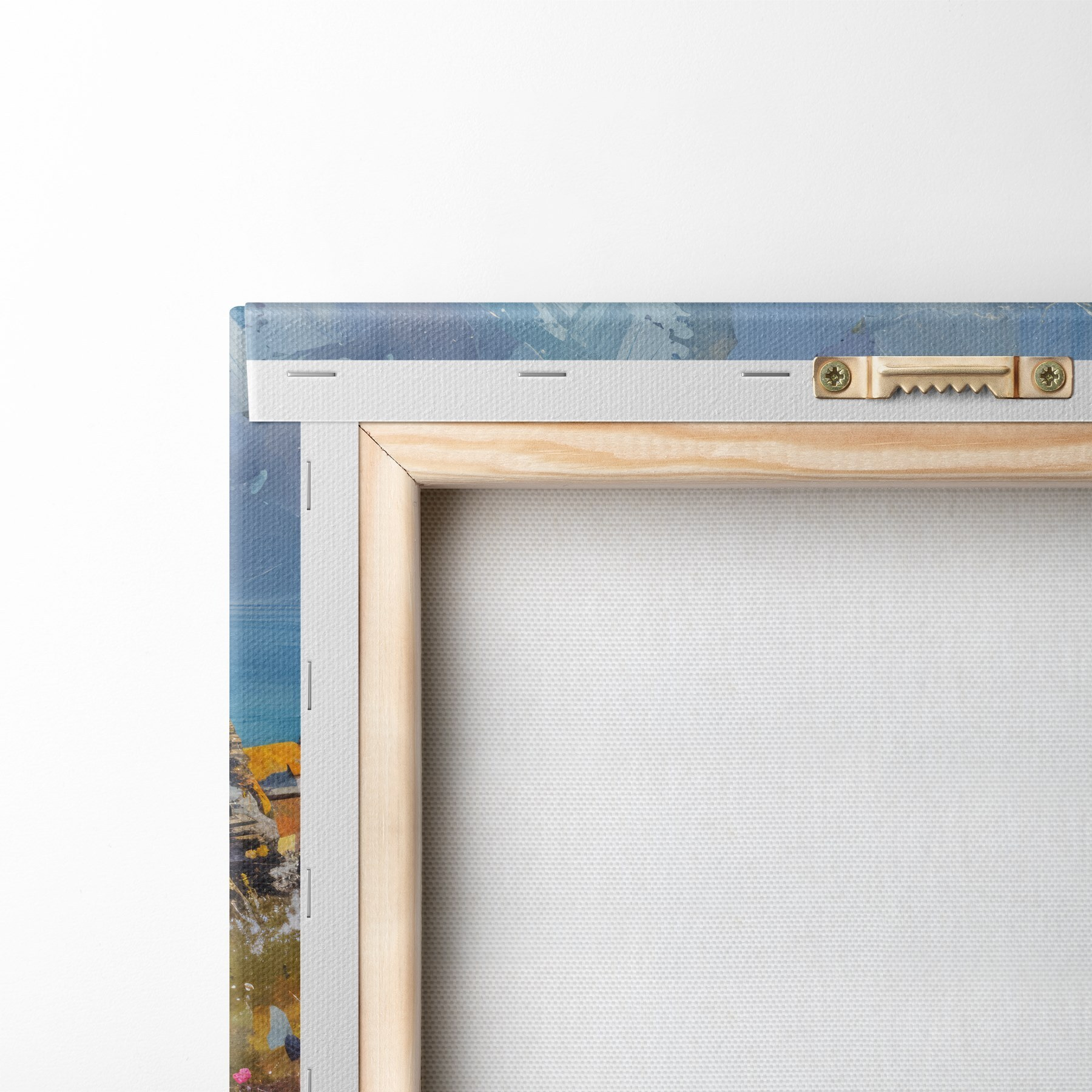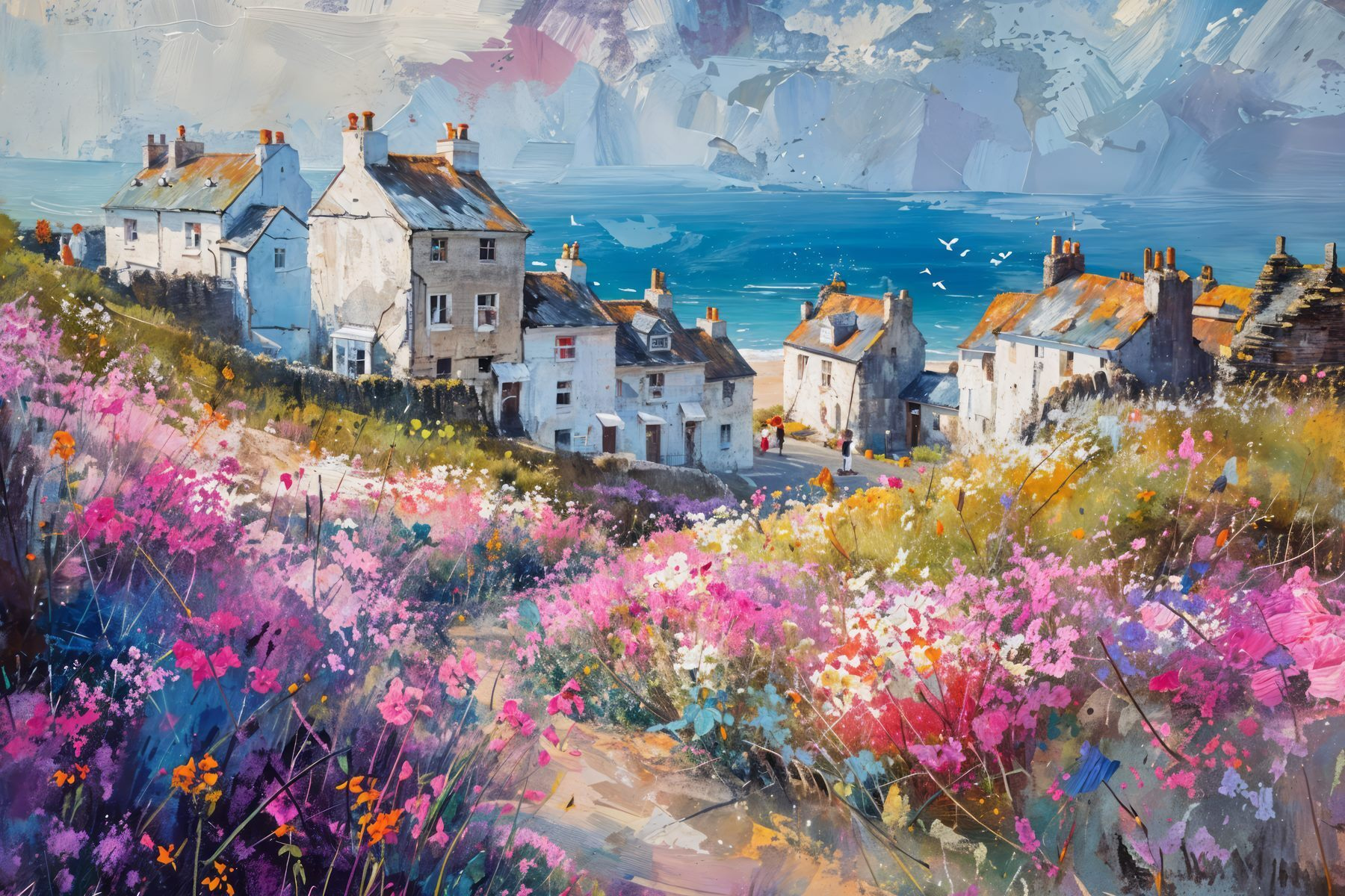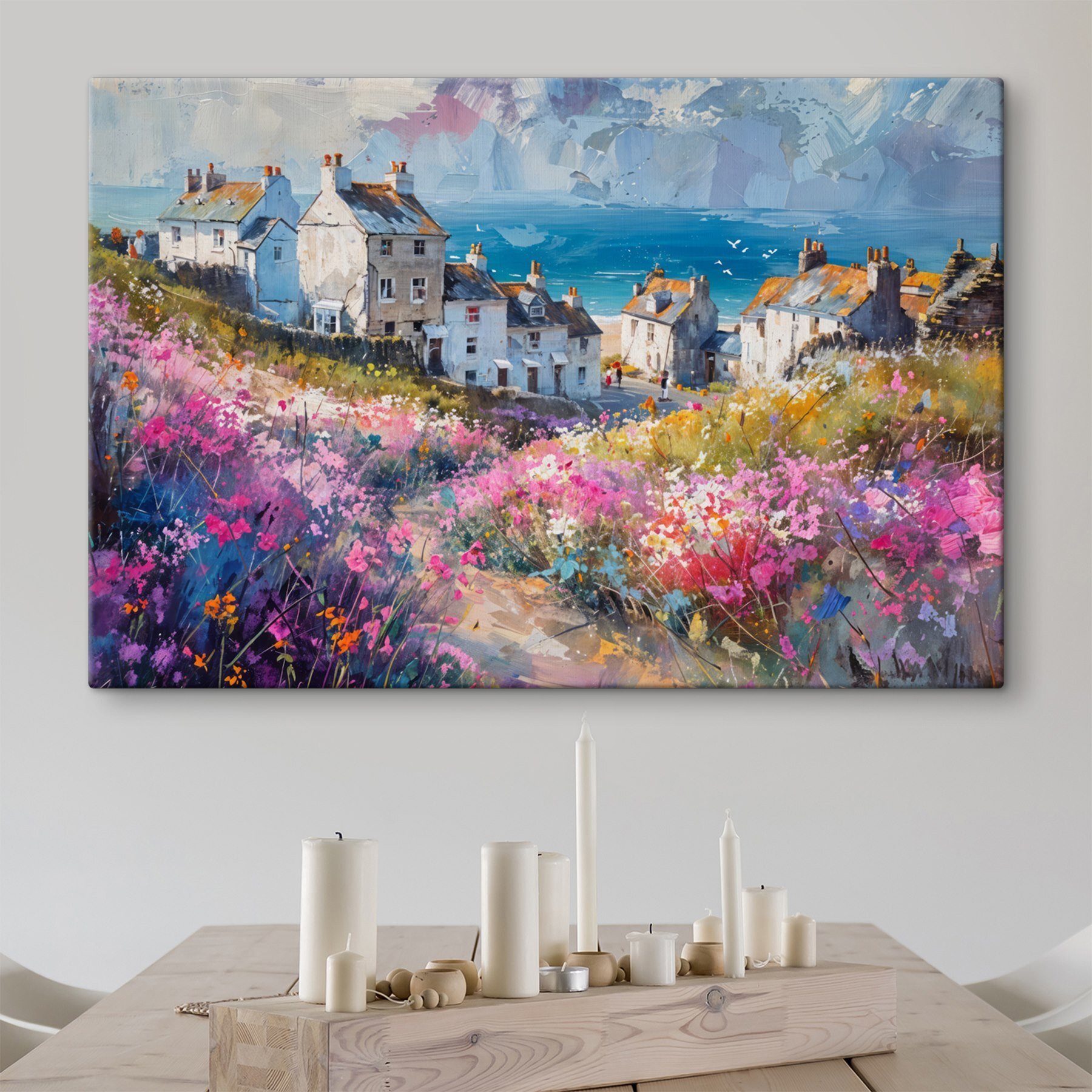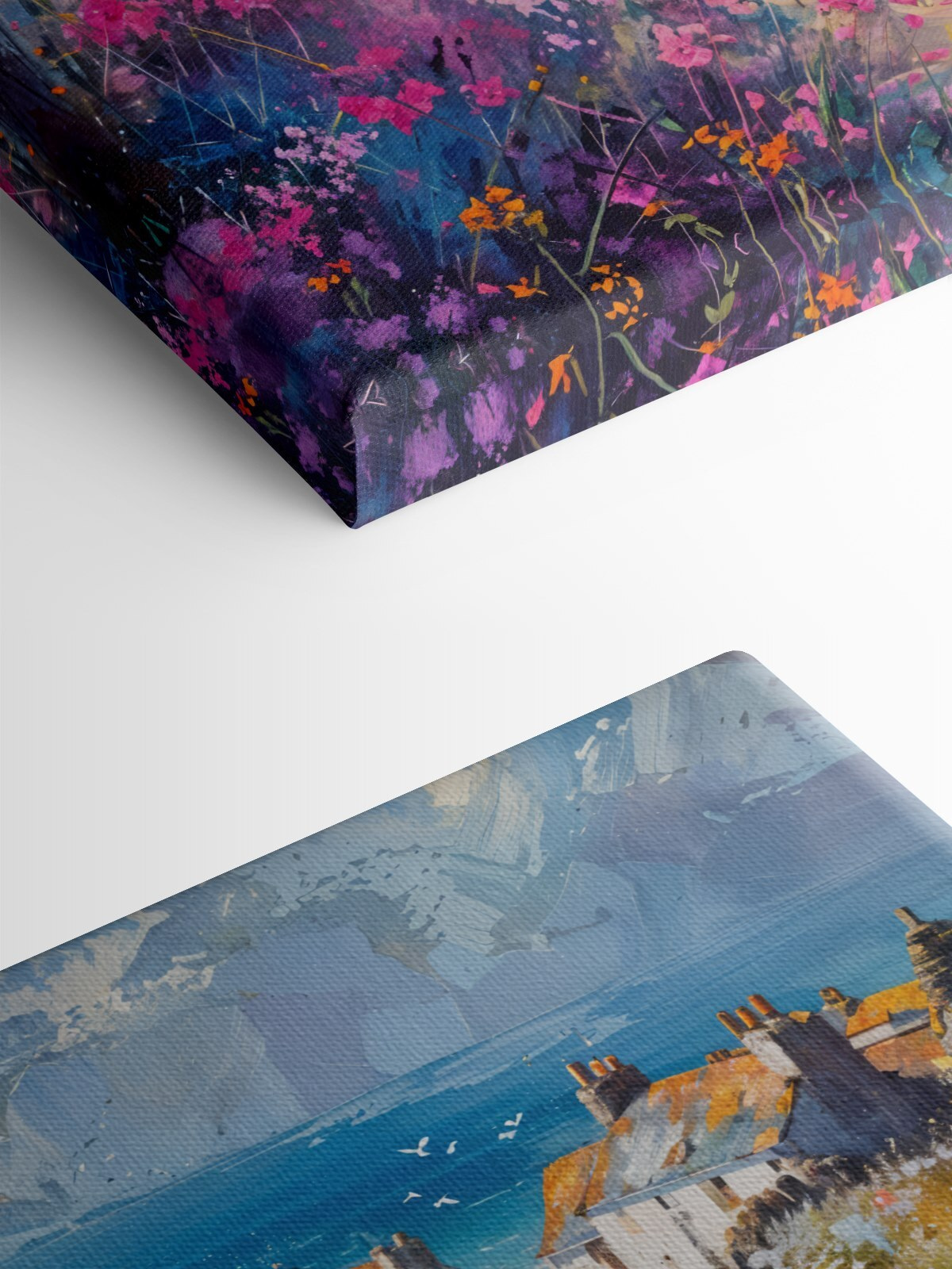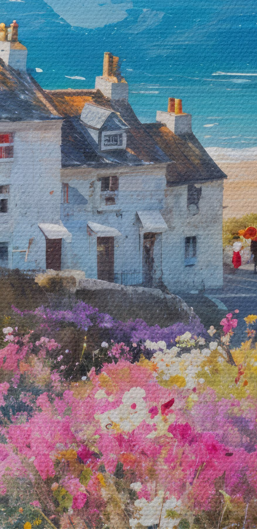 Stel je voor dat je een levendig dorpje binnenstapt, waar de bloemen uitbarsten in kleuren die zo helder zijn dat je zou zweren dat het eeuwig zomer is. Deze canvasprint legt die magie vast, hoe de lucht ruikt naar verse bloemen en oude verhalen. De zee fluistert net voorbij, hintend op onvertelde avonturen. Hang dit in je kamer en plotseling heeft je woonkamer de gezellige charme van een oude ontsnapping aan zee. Het is net een minivakantie, maar dan zonder lastige sandalen en zonnebrand. Ideaal voor dromers en zwervers!
