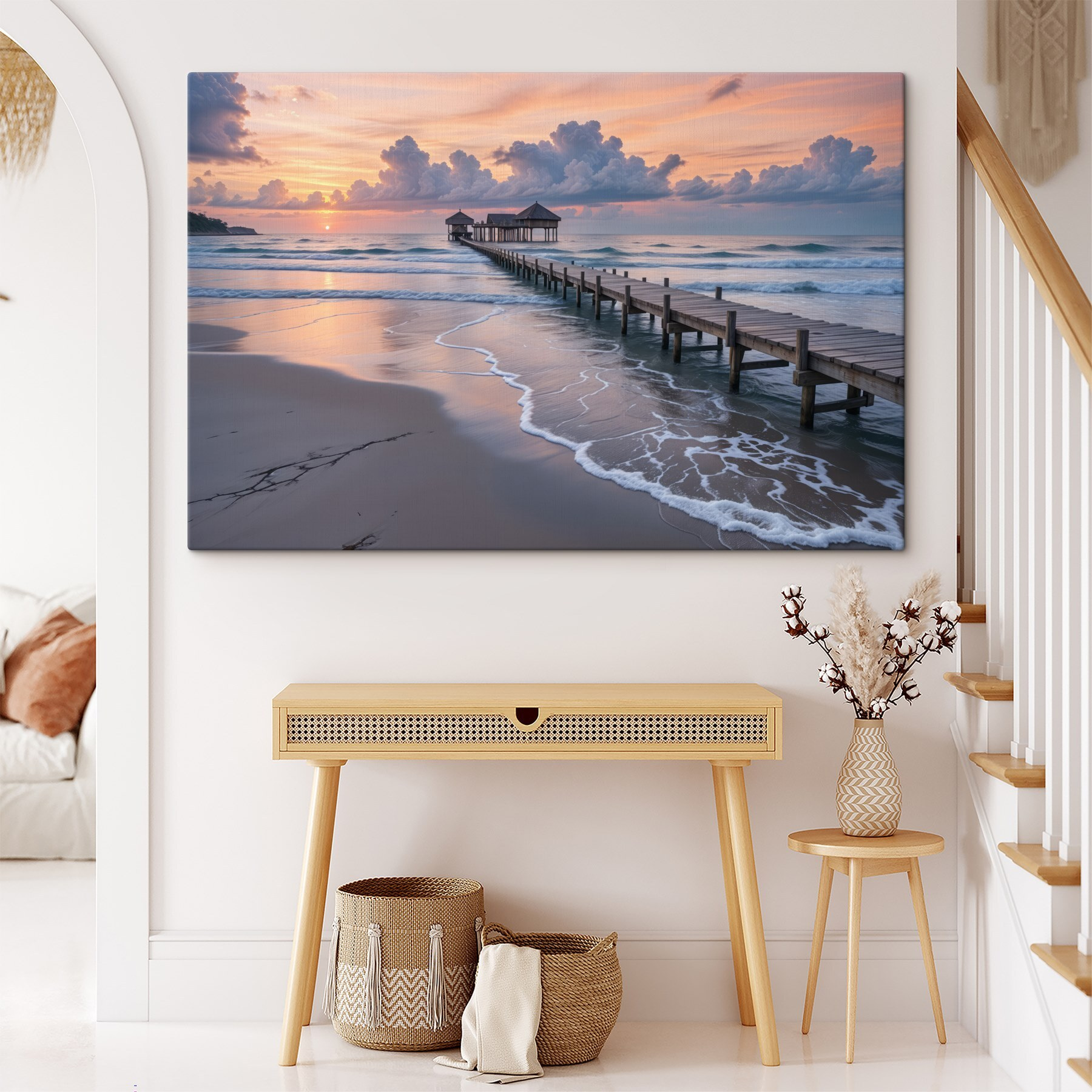 Stel je voor dat je na een lange dag thuiskomt – plof neer en kijk naar dit doek: “Dock Leading to a Building.” Het is alsof er een stukje sereniteit je kamer binnenstroomt. Die zachte tinten, de zachte golven-je kunt ze bijna de geheimen van de zee horen fluisteren. Perfect voor die “ik heb vakantie nodig”-momenten zonder dat je je bank hoeft te verlaten. Het is alsof je je muren een knuffel geeft en de rust van de natuur combineert met een vleugje reislust. Echt, wie zou er niet elke dag bij zonsondergang over die kade willen wandelen? Instant strandgevoel.