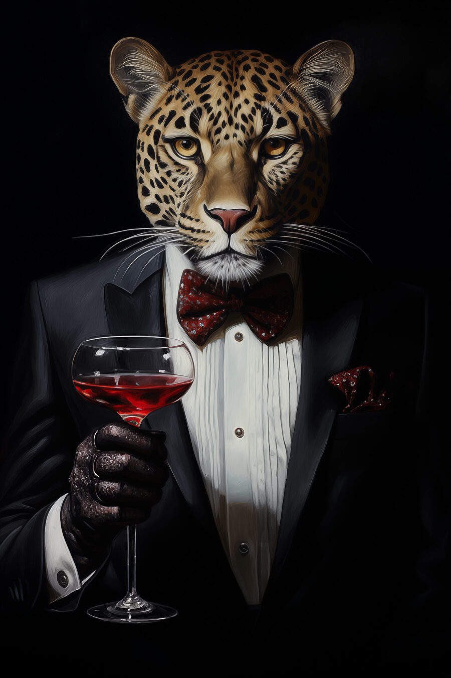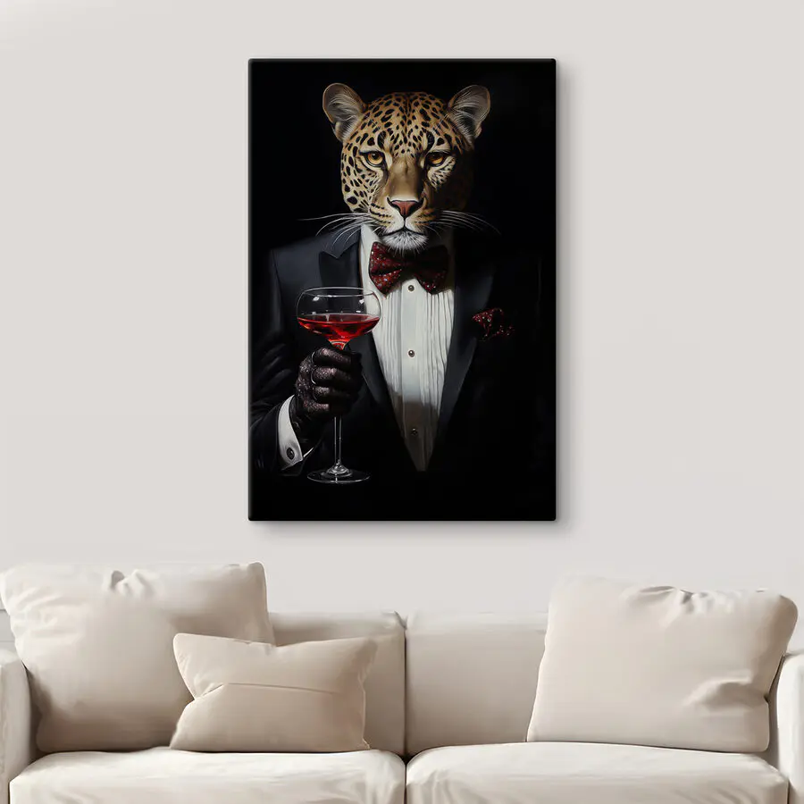 Stel je voor dat je thuiskomt en je ziet een luipaard in pak met strik en een wijnglas in de hand – en niet zomaar een luipaard, maar het perfecte, debonair exemplaar dat je op je etentje zou willen zien. Deze zwart-witte canvas print voegt een vleugje eigenzinnigheid, verfijning en, laten we eerlijk zijn, een beetje mysterie toe aan je interieur. Perfect voor zowel dierenliefhebbers als kunstliefhebbers, het is een conversatiestarter die gasten laat nadenken over de wilde werelden van elegantie en charme. Plaats het in je woonkamer voor een vleugje van het buitengewone, want wie houdt er niet van een goed geklede katachtige met gevoel voor humor?